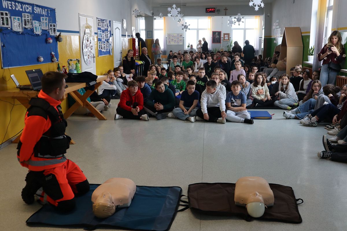 Nie zabrakło również rozmów o bezpiecznych zabawach zimowych, takich jak jazda na sankach czy zabawy na śniegu, a także o zagrożeniach związanych z wchodzeniem na zamarznięte zbiorniki wodne. Ważnym elementem spotkania była nauka podstaw udzielania pierwszej pomocy, w tym ćwiczenia z resuscytacji krążeniowo-oddechowej oraz wskazówki, jak zachować się w sytuacjach zagrożenia i kiedy wzywać pomoc.
