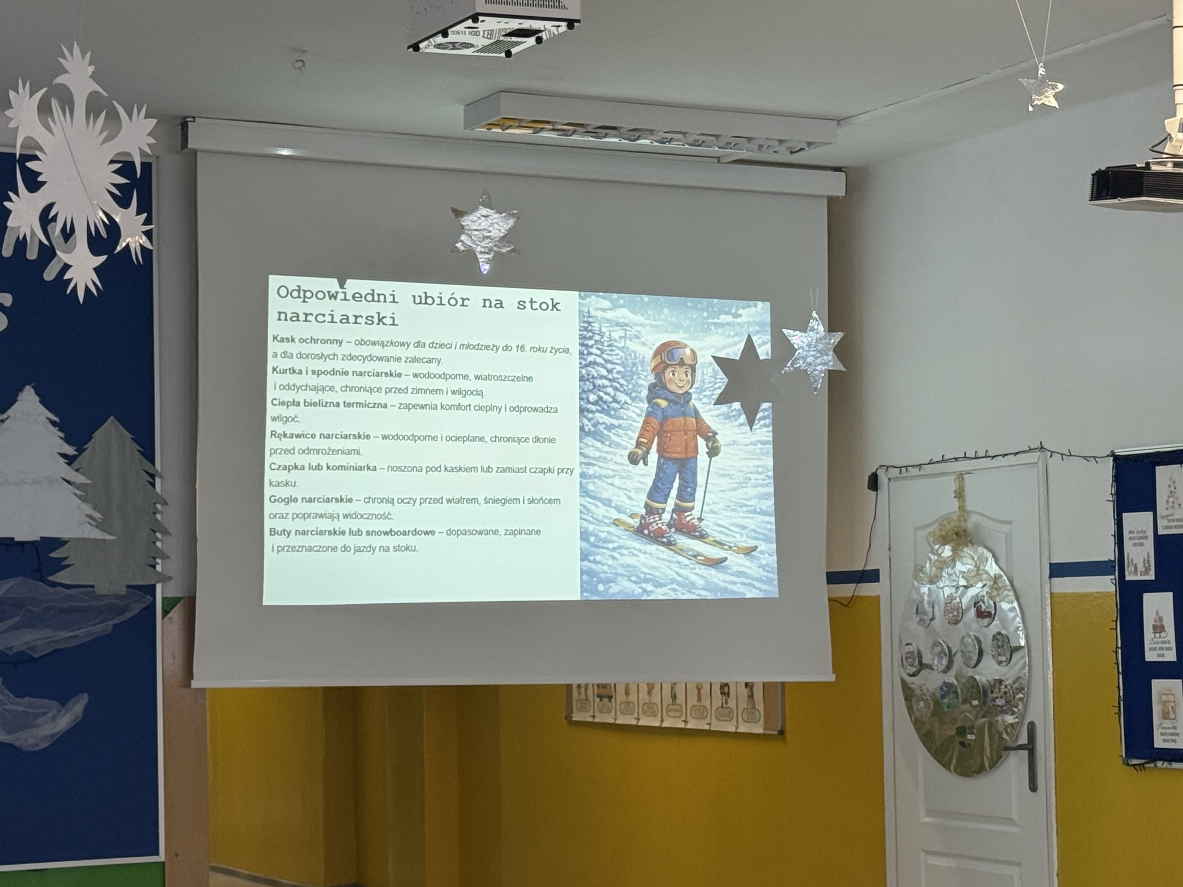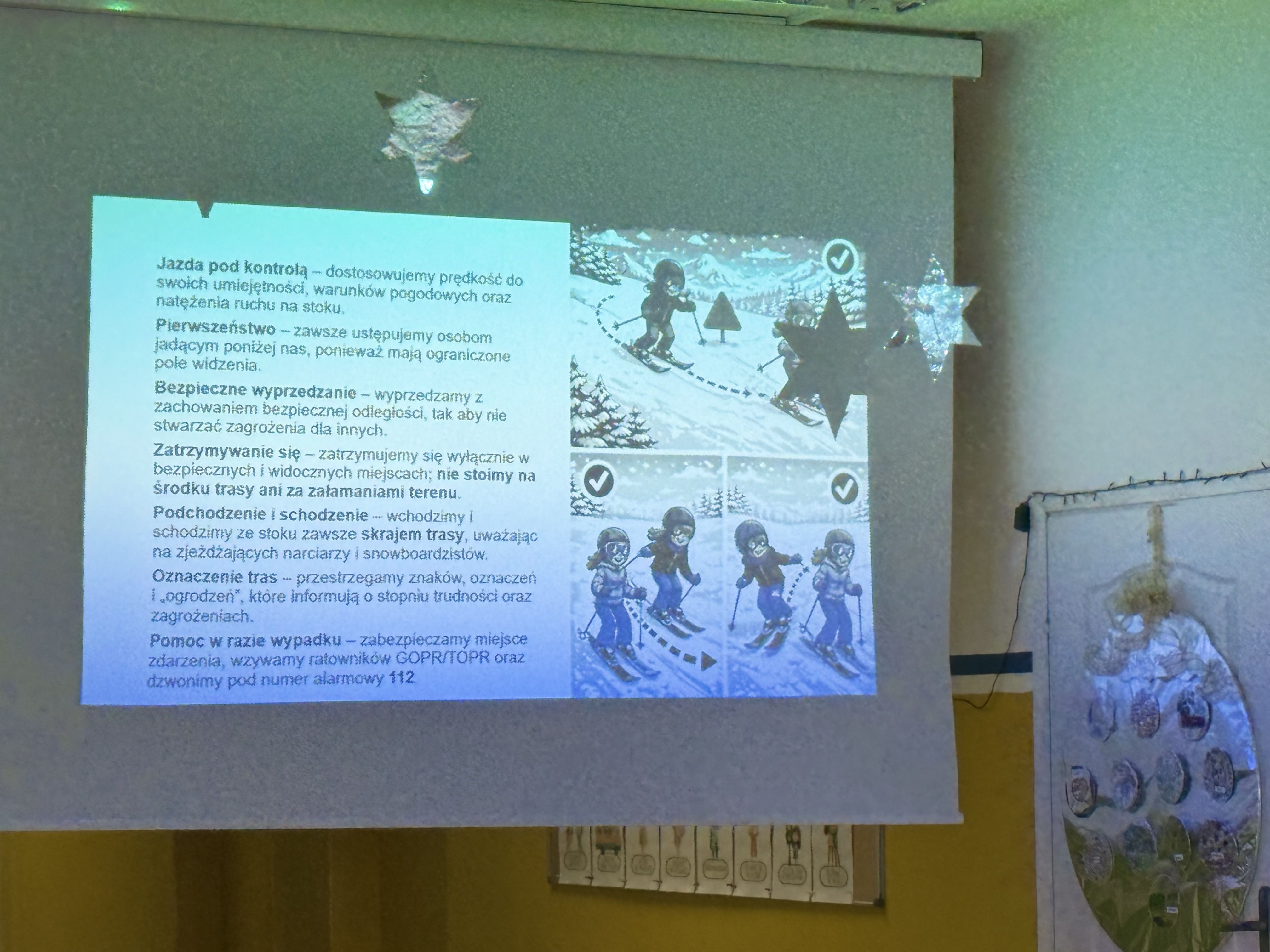 Podczas spotkania omówiono m.in. odpowiedni ubiór na zimowe aktywności, zwracając uwagę na konieczność noszenia kasku, ciepłej i nieprzemakalnej odzieży oraz gogli ochronnych. Uczniowie dowiedzieli się także, jak zachowywać się na stokach narciarskich – jak dobierać trasy do swoich umiejętności, przestrzegać zasad pierwszeństwa oraz dbać o bezpieczeństwo swoje i innych.