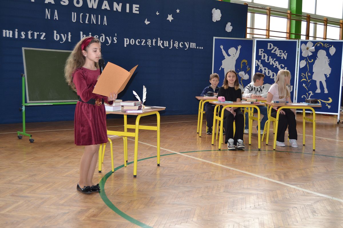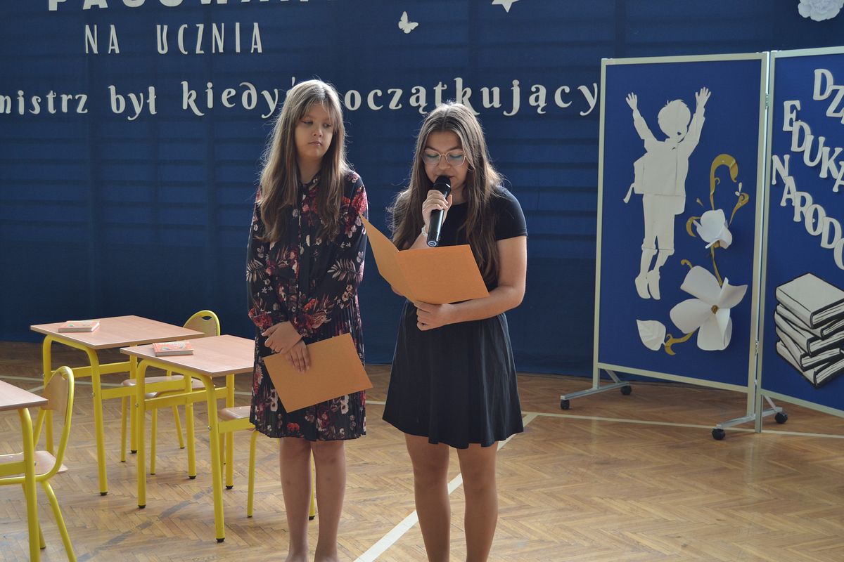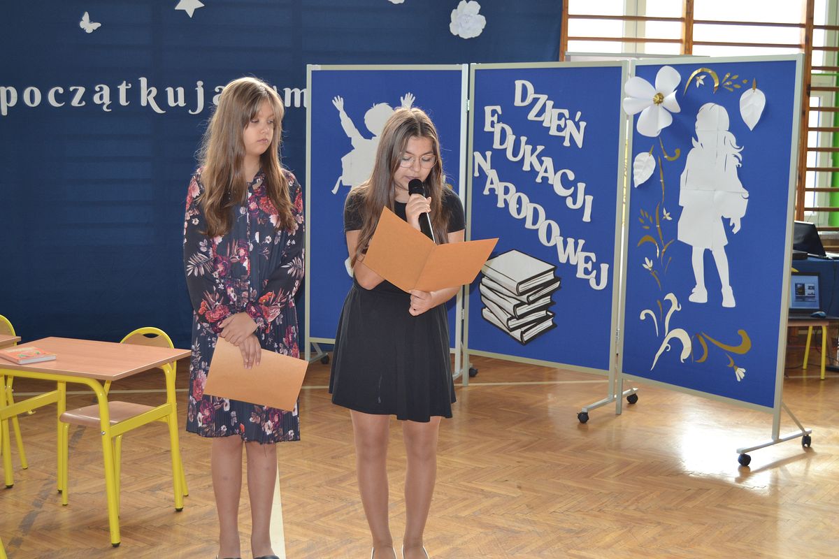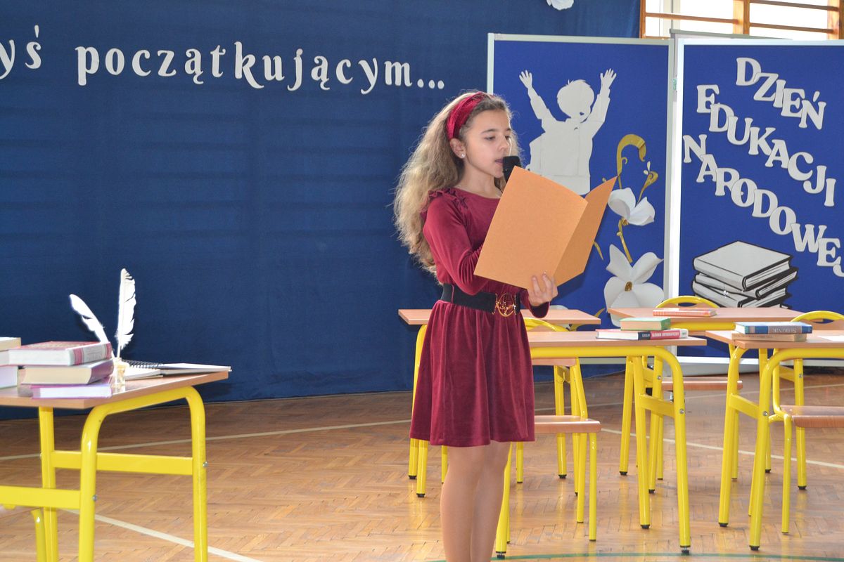 Z okazji Dnia Edukacji Narodowej w naszej szkole odbył się uroczysty apel z występami wokalnymi i montażem słowno- muzycznym przygotowanym przez naszych podopiecznych. Pani Dyrektor powitała wszystkich zebranych i nakreśliła jak istotną rolę odgrywa edukacja w życiu młodych ludzi. Wyraziła również radość i zadowolenie z możliwości wspólnego tworzenia niezwykłej społeczności naszej szkoły.