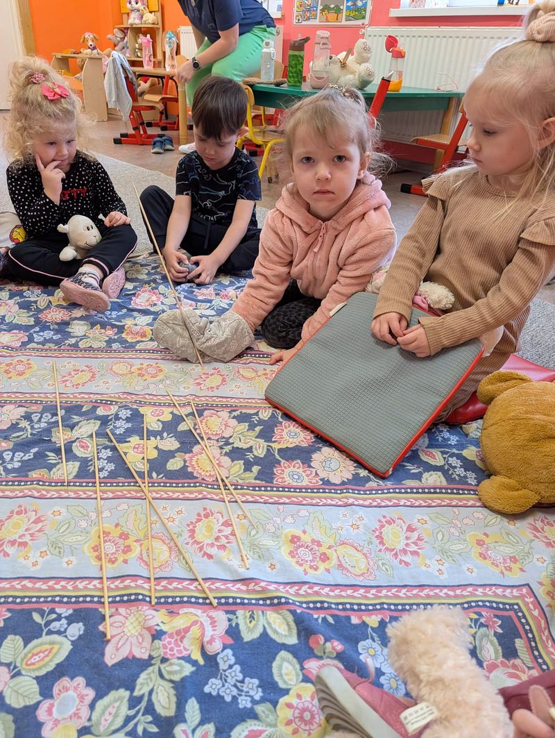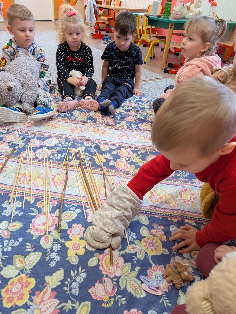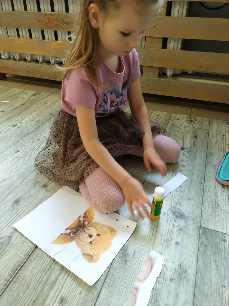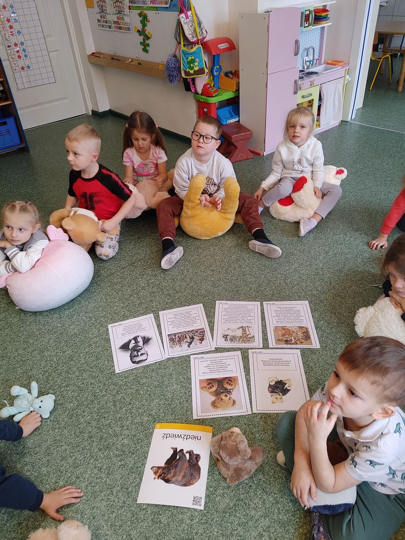 Następnie odbyły się zajęcia ruchowe z misiami, podczas których dzieci brały udział w zabawach muzyczno – ruchowych: „Misiowy taniec”, „Stary niedźwiedź mocno śpi” czy tor przeszkód, który należało pokonać, niosąc swojego misia. Dzieci wysłuchały także opowiadania o misiach oraz obejrzały krótką prezentację o historii pluszowego misia. Wspólnie przypomnieliśmy sobie znane bajkowe misie, takie jak Kubuś Puchatek czy Miś Uszatek.