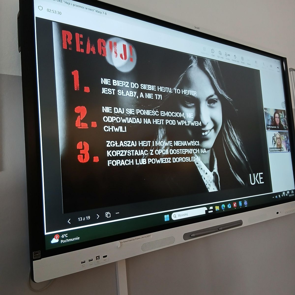 Starsze klasy miały okazję zgłębić temat przemocy w internecie w szerszym kontekście. Uczniowie wysłuchali o odpowiedzialności za swoje działania online, konsekwencjach hejtu oraz sposobach reagowania na cyberprzemoc. Poruszono także kwestie ochrony prywatności i bezpiecznego korzystania z mediów społecznościowych.