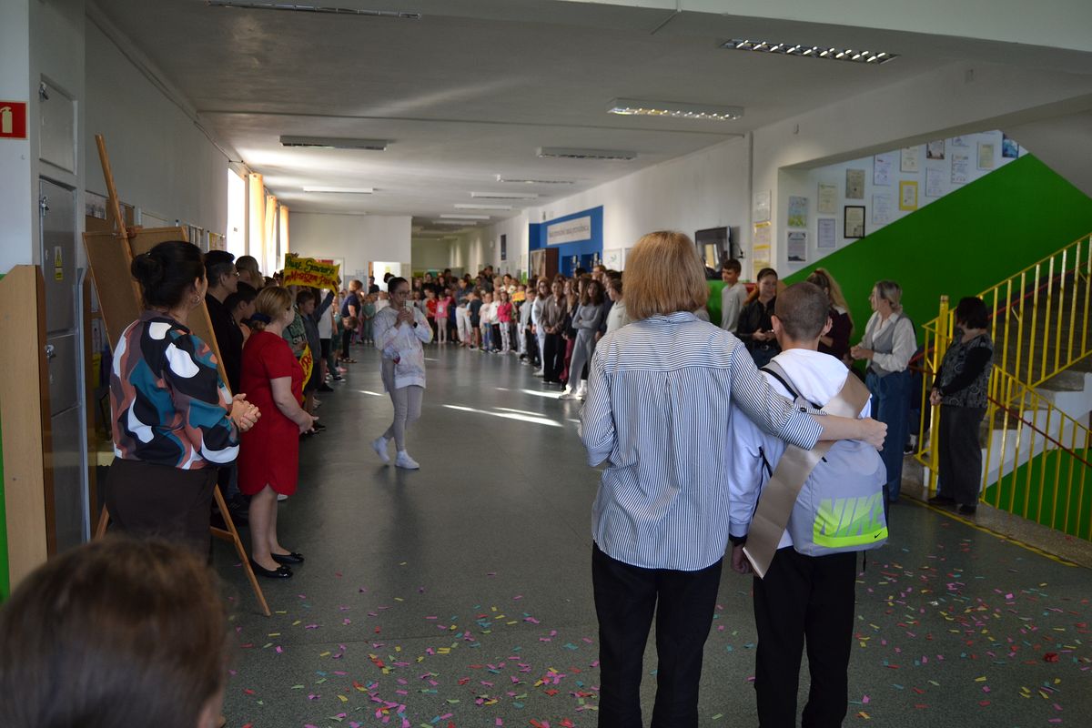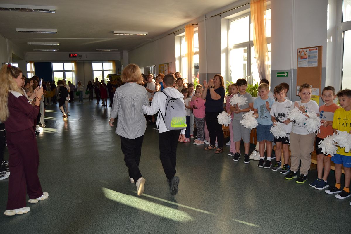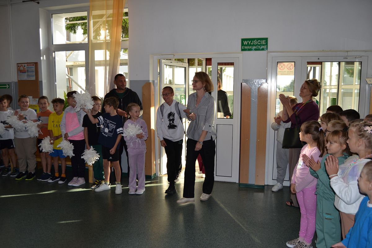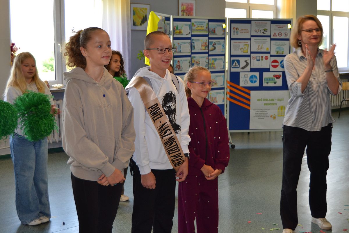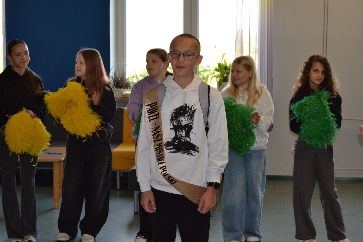 Kilka dni po niezwykłym triumfie sportowym Pawła, w piątkowy poranek wszyscy uczniowie i nauczyciele zebrali się w głównym holu szkolnym, by powitać gromkimi brawami i wiwatowaniem mistrza Polski. Pani dyrektor pogratulowała Pawłowi złotego medalu i podkreśliła, że jest on wynikiem talentu, pracy i determinacji w dążeniu do celu. Złota szarfa , która ozdobiła ramię naszego ucznia dumnie obwieszczała, że jest on NASZYM MISTRZEM POLSKI. Wzruszenie i radość towarzyszyły wszystkim dzieciom i dorosłym oklaskującym złotego medalistę olimpiady lekkoatletycznej.