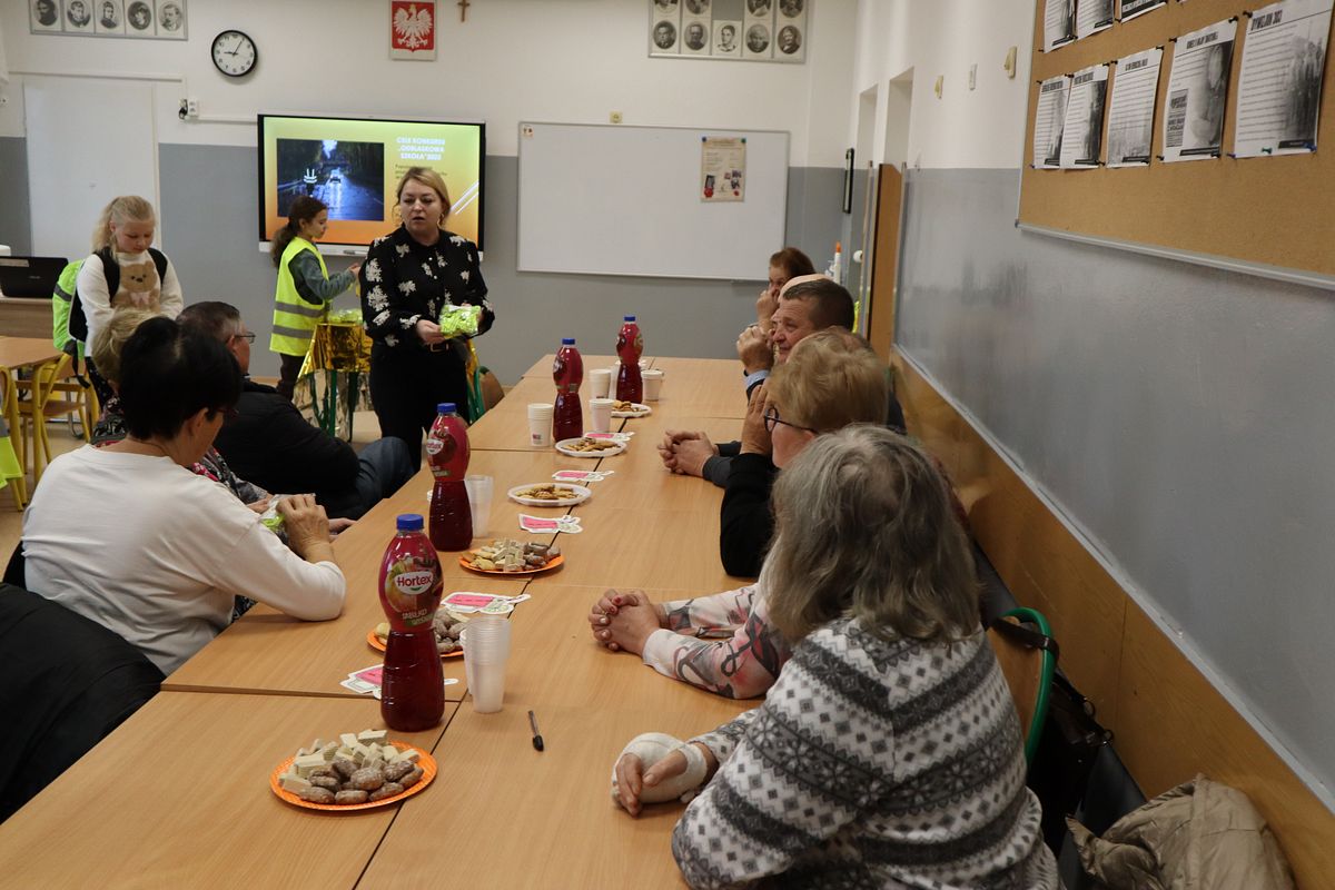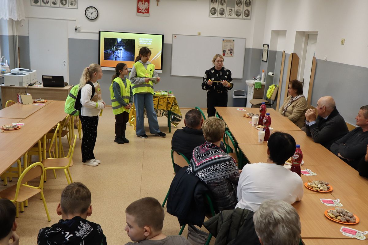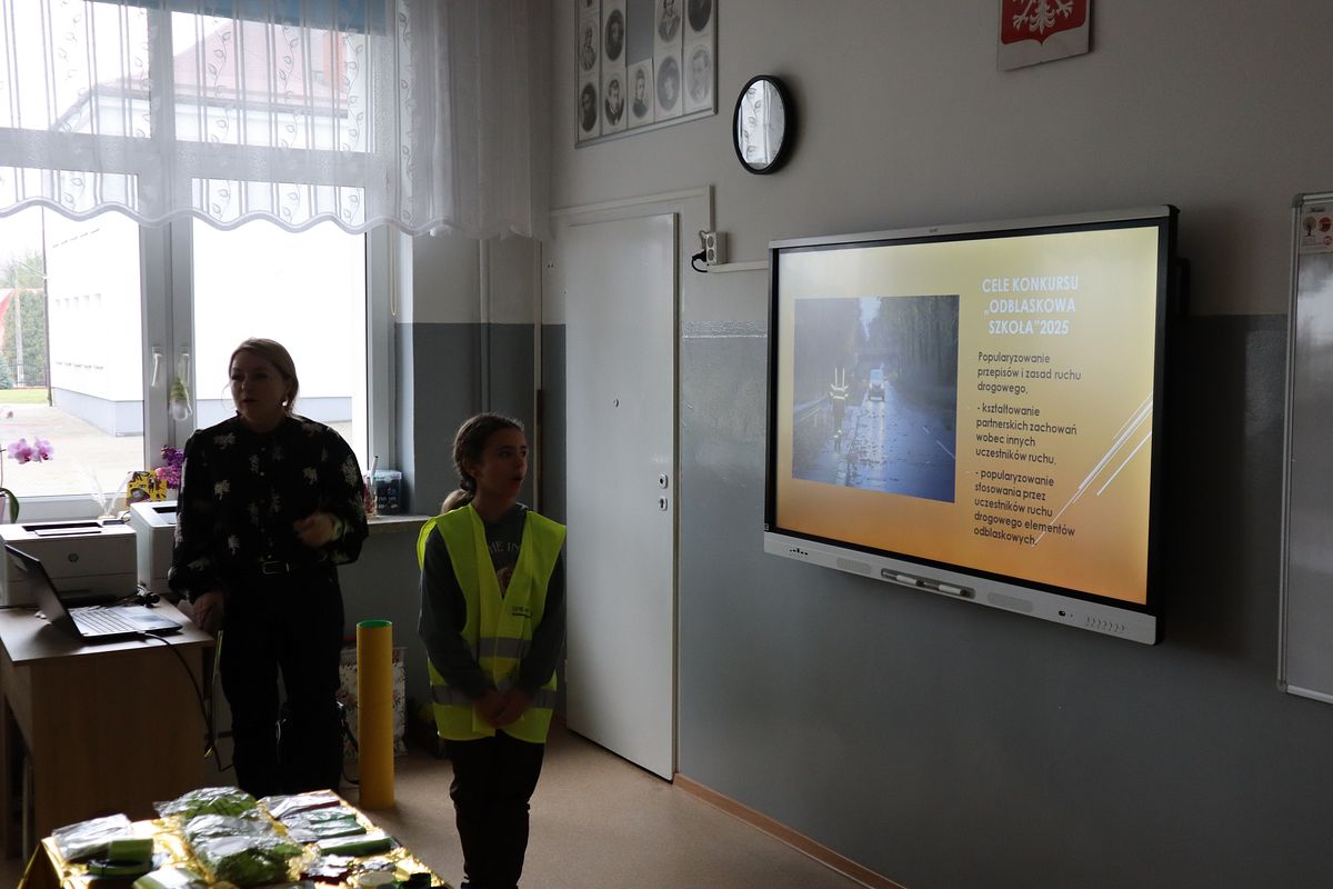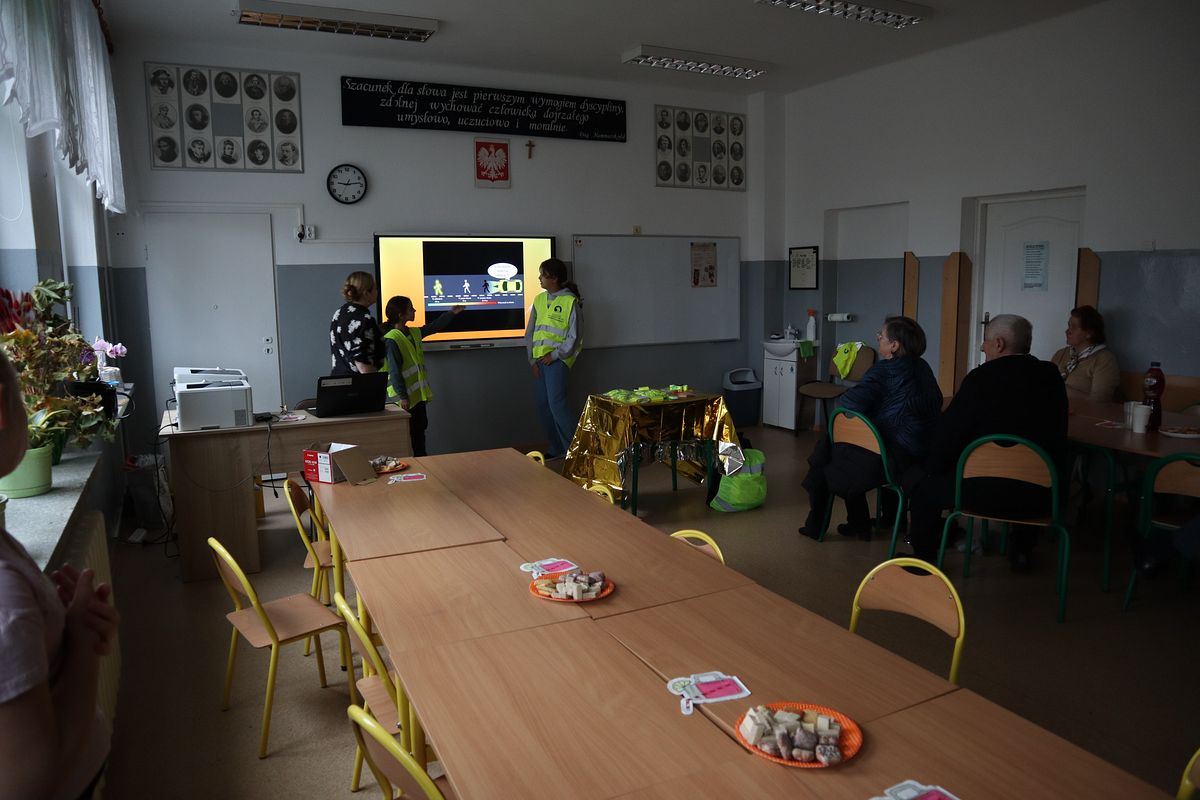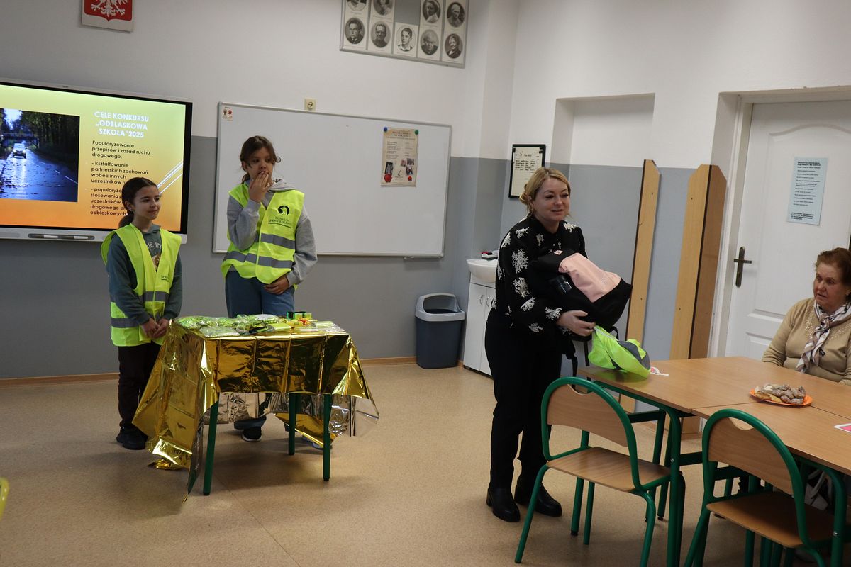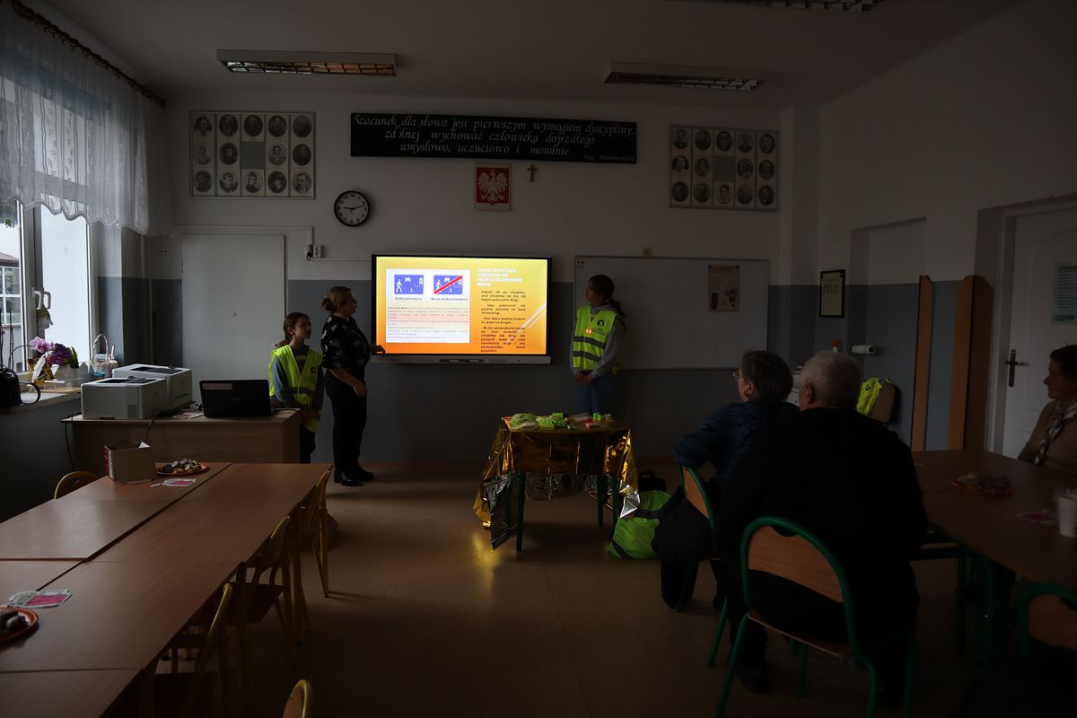 Podczas prezentacji multimedialnej przypominano o zasadach poruszania się pieszych po obszarach zabudowanych i poza nimi. Uczniowie zwrócili uwagę na różnice w widoczności osób idących chodnikiem z elementami odblaskowymi i bez nich. Następnie pokazali zaproszonym seniorom różne gadżety odblaskowe i sposoby ich noszenia.
