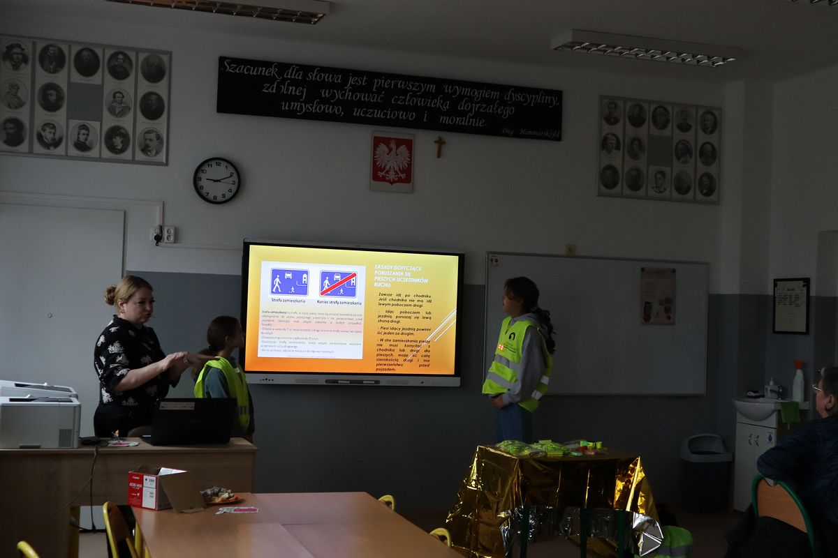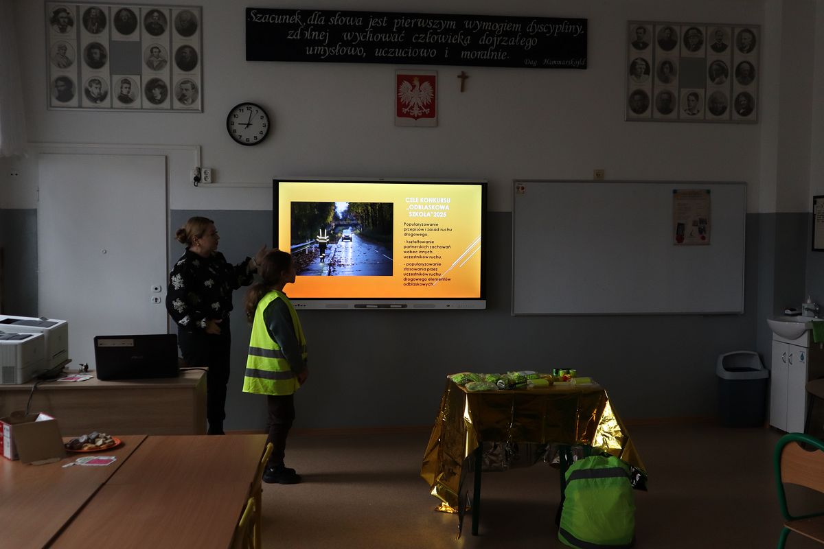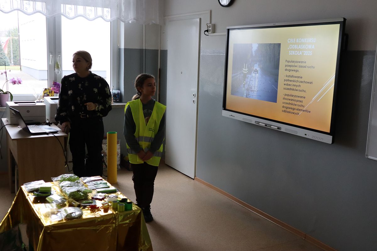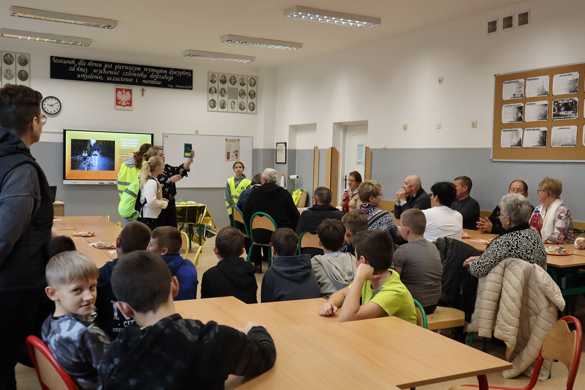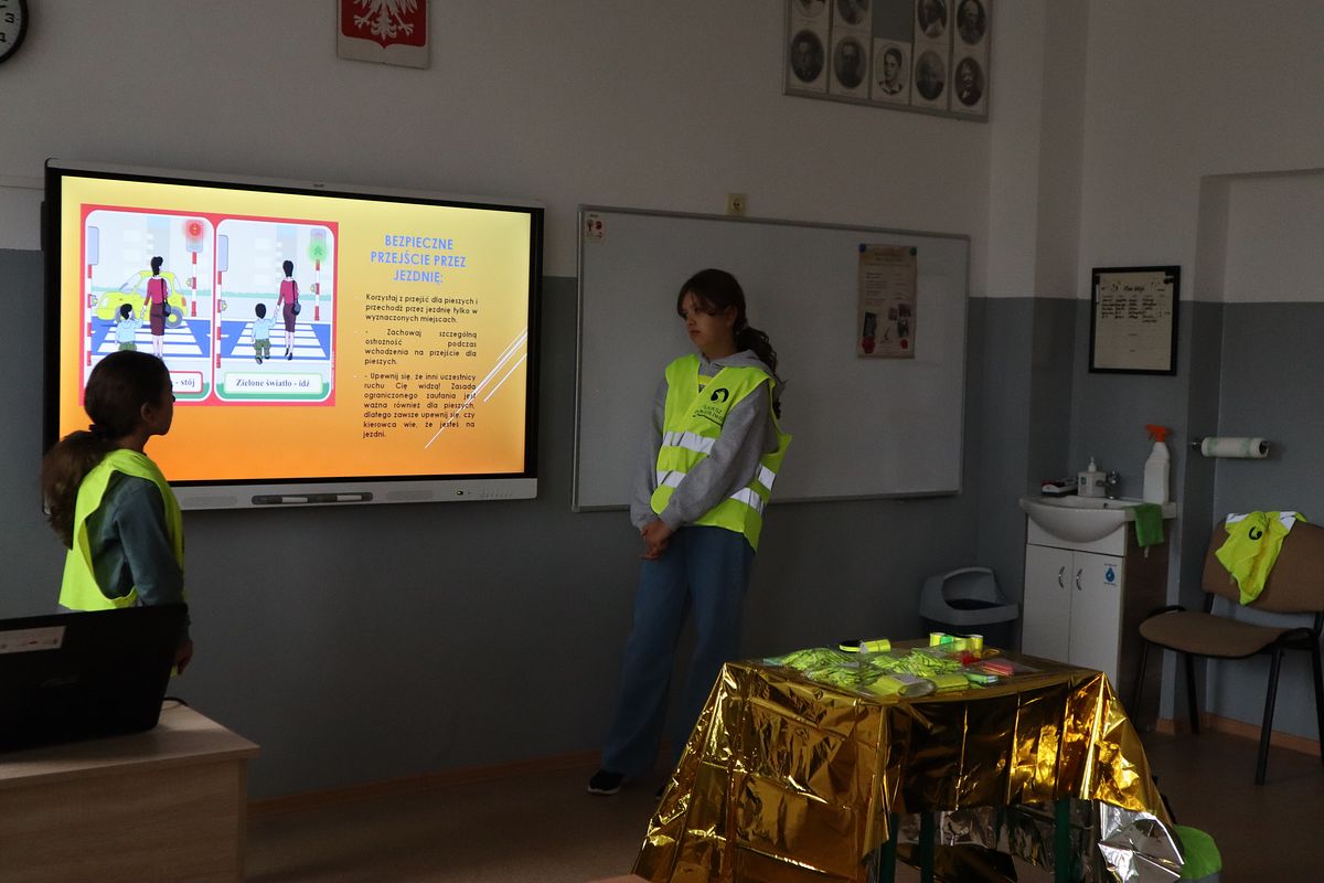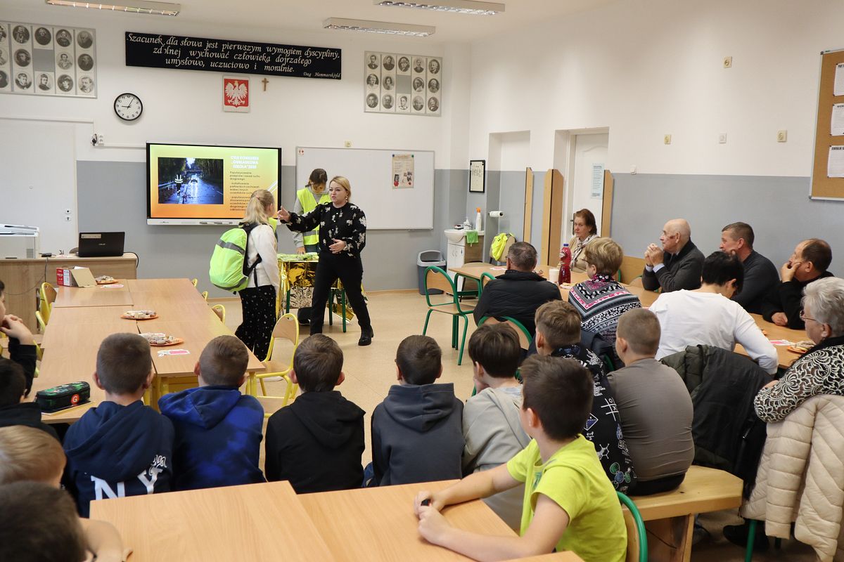 Podczas prezentacji multimedialnej przypominano o zasadach poruszania się pieszych po obszarach zabudowanych i poza nimi. Uczniowie zwrócili uwagę na różnice w widoczności osób idących chodnikiem z elementami odblaskowymi i bez nich. Następnie pokazali zaproszonym seniorom różne gadżety odblaskowe i sposoby ich noszenia.