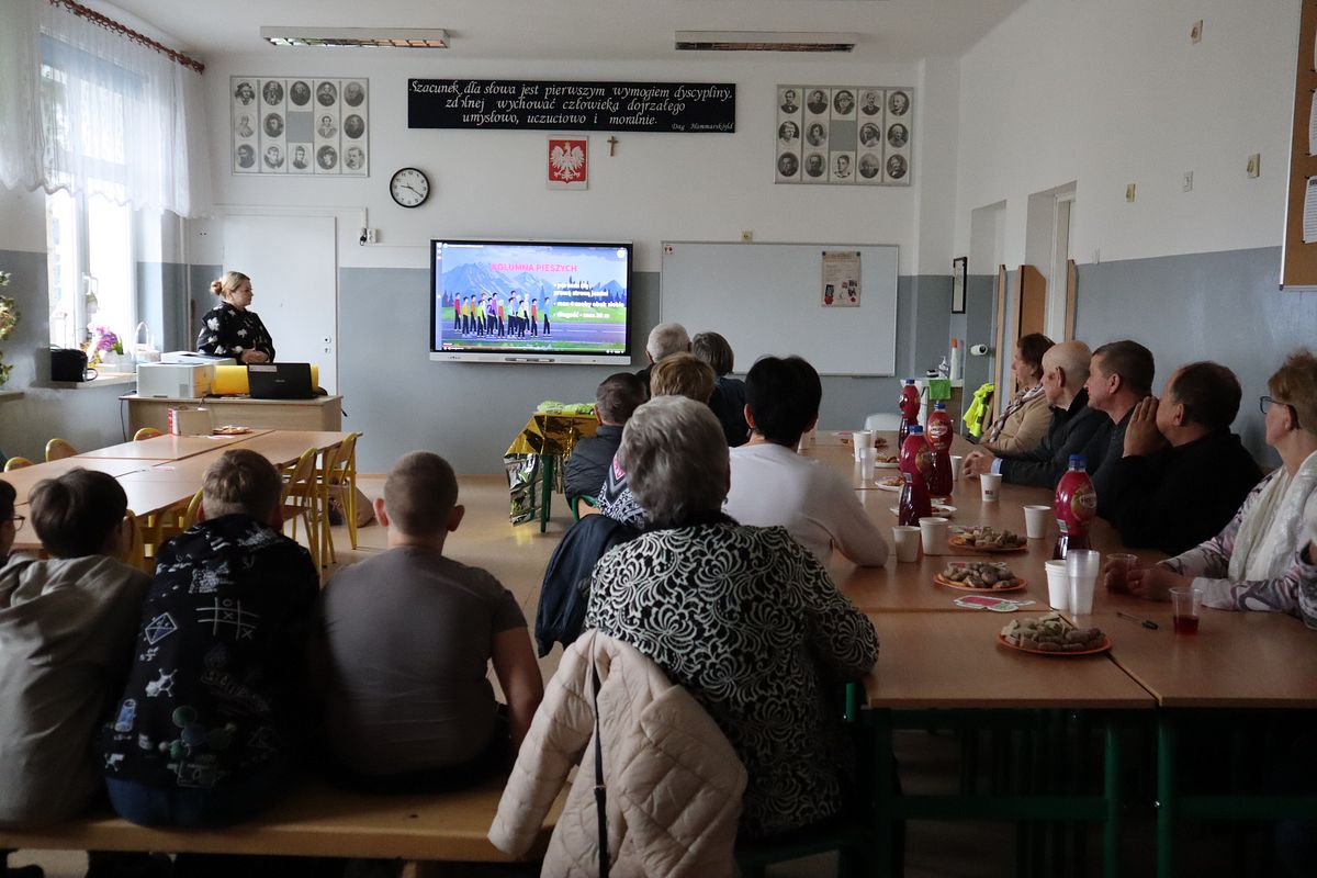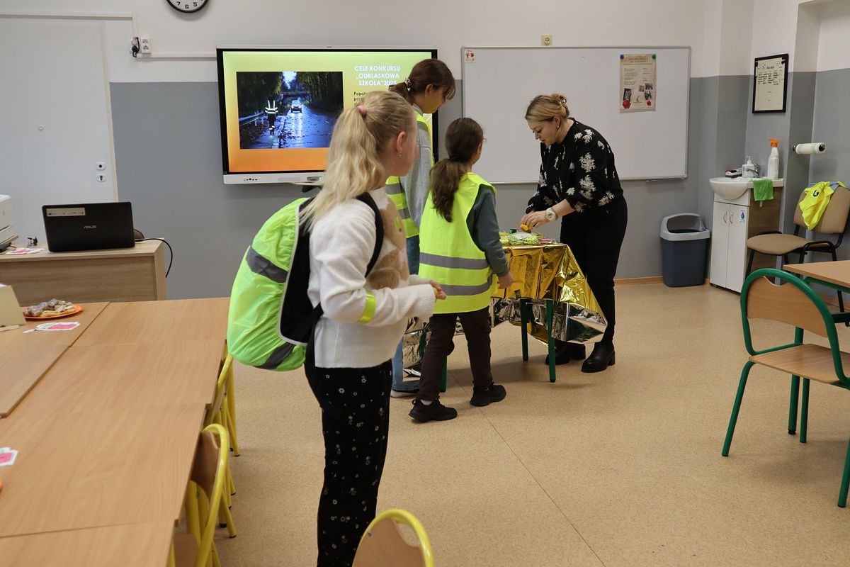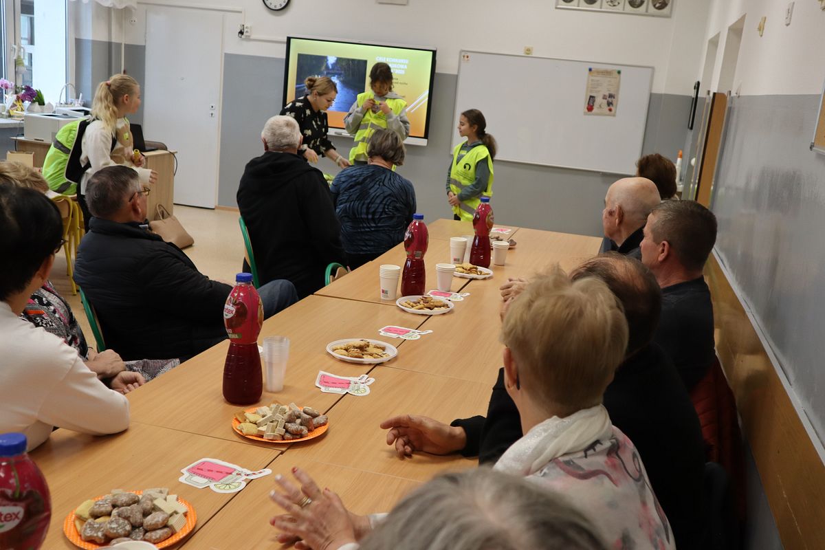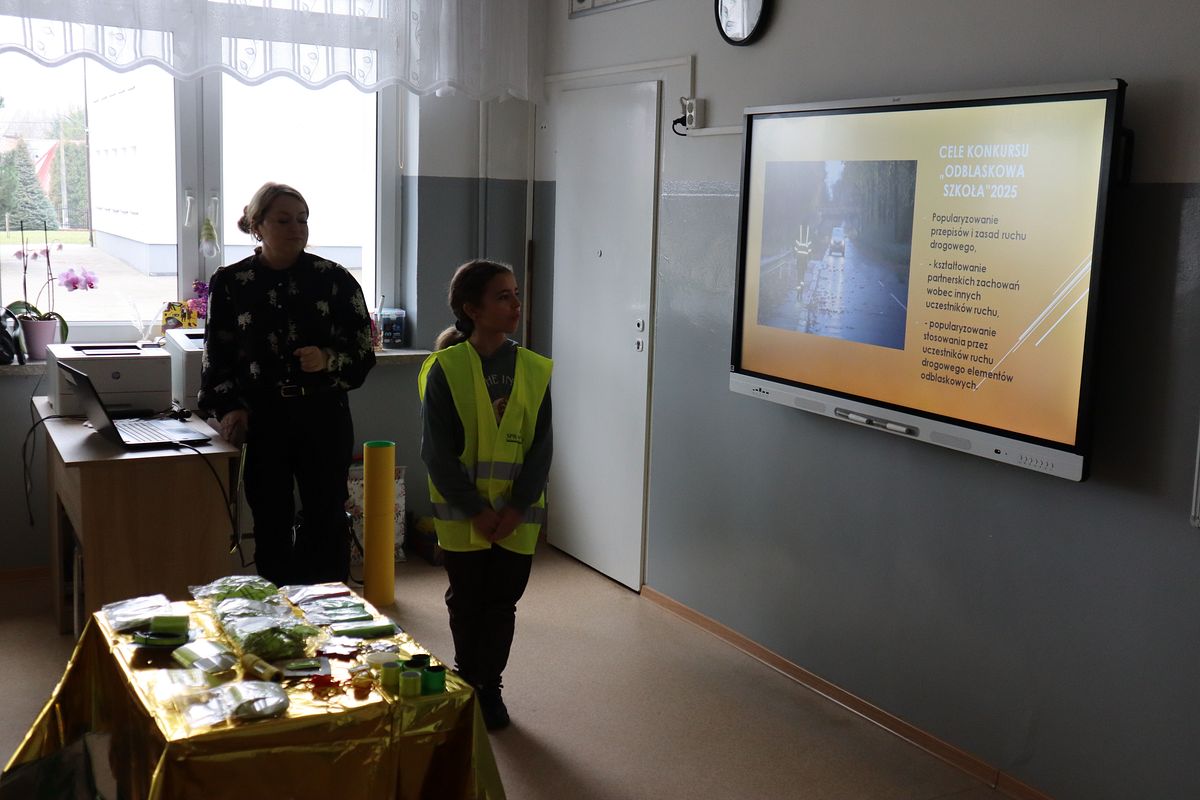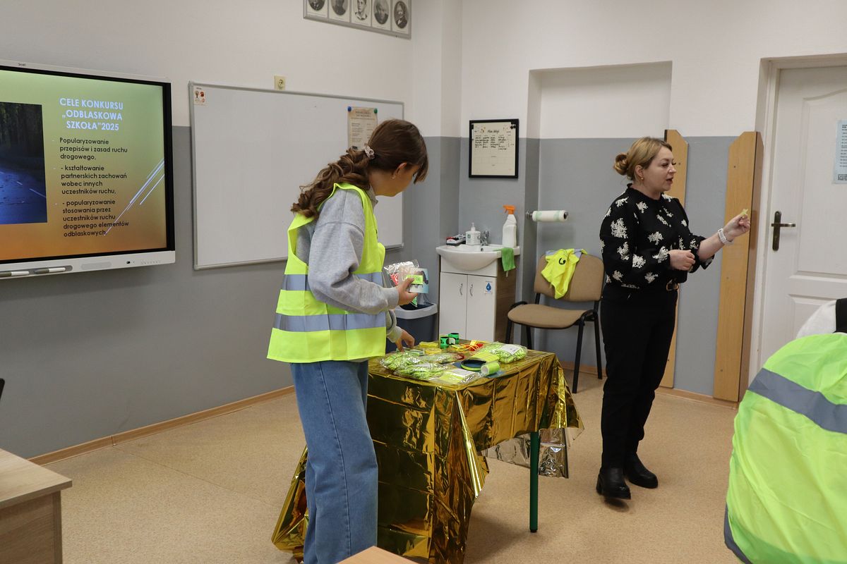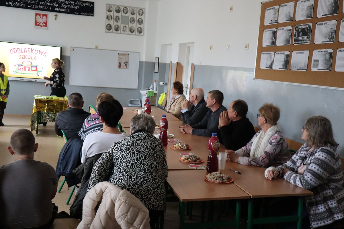 Podczas prezentacji multimedialnej przypominano o zasadach poruszania się pieszych po obszarach zabudowanych i poza nimi. Uczniowie zwrócili uwagę na różnice w widoczności osób idących chodnikiem z elementami odblaskowymi i bez nich. Następnie pokazali zaproszonym seniorom różne gadżety odblaskowe i sposoby ich noszenia.