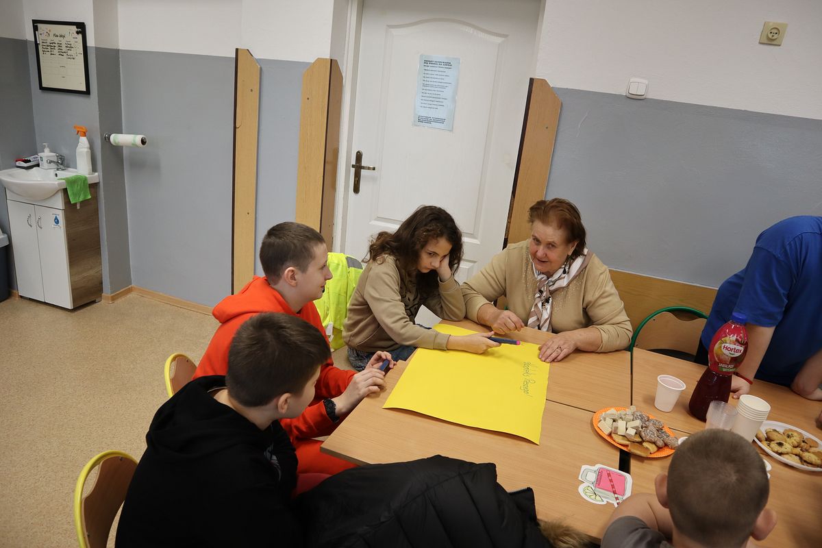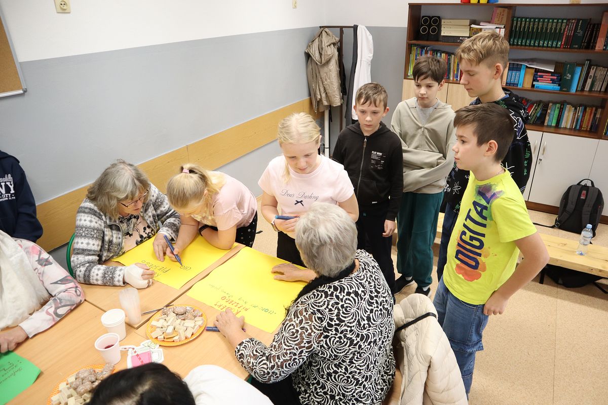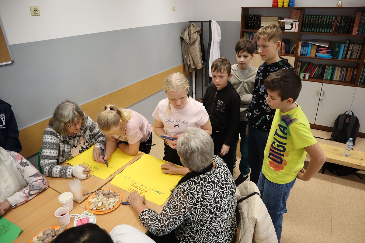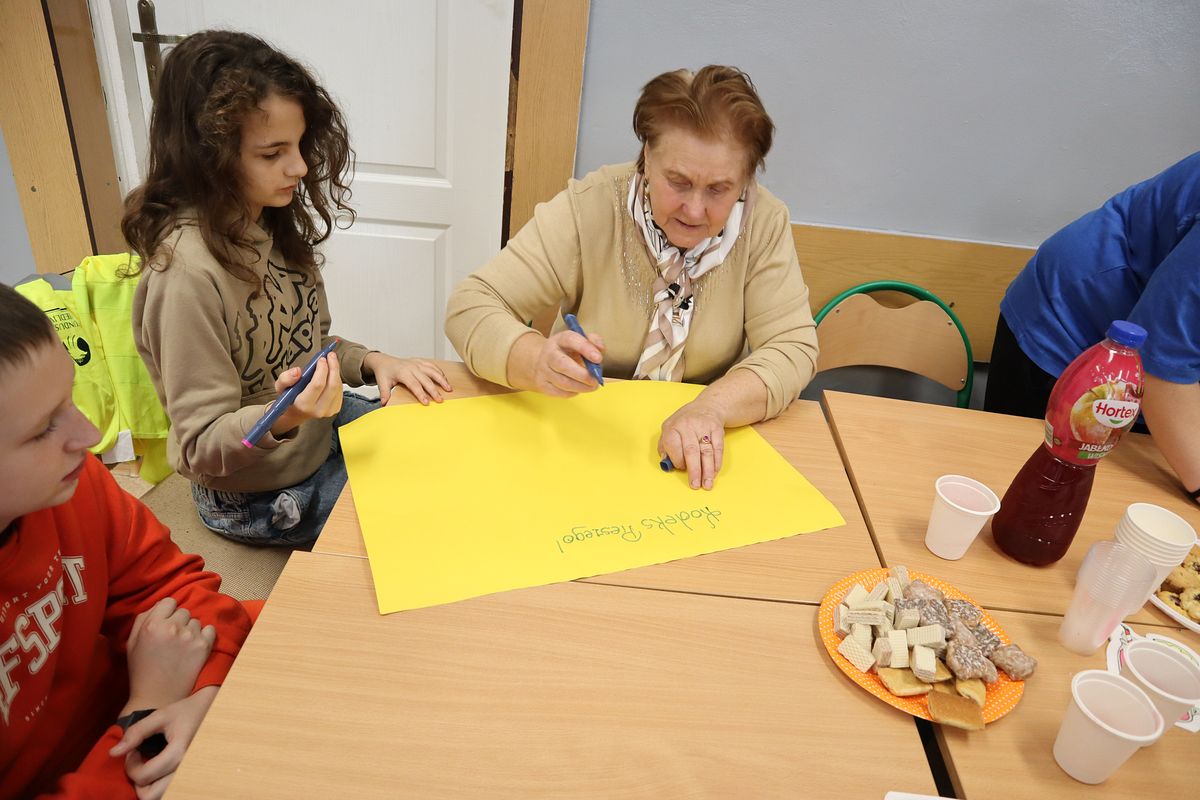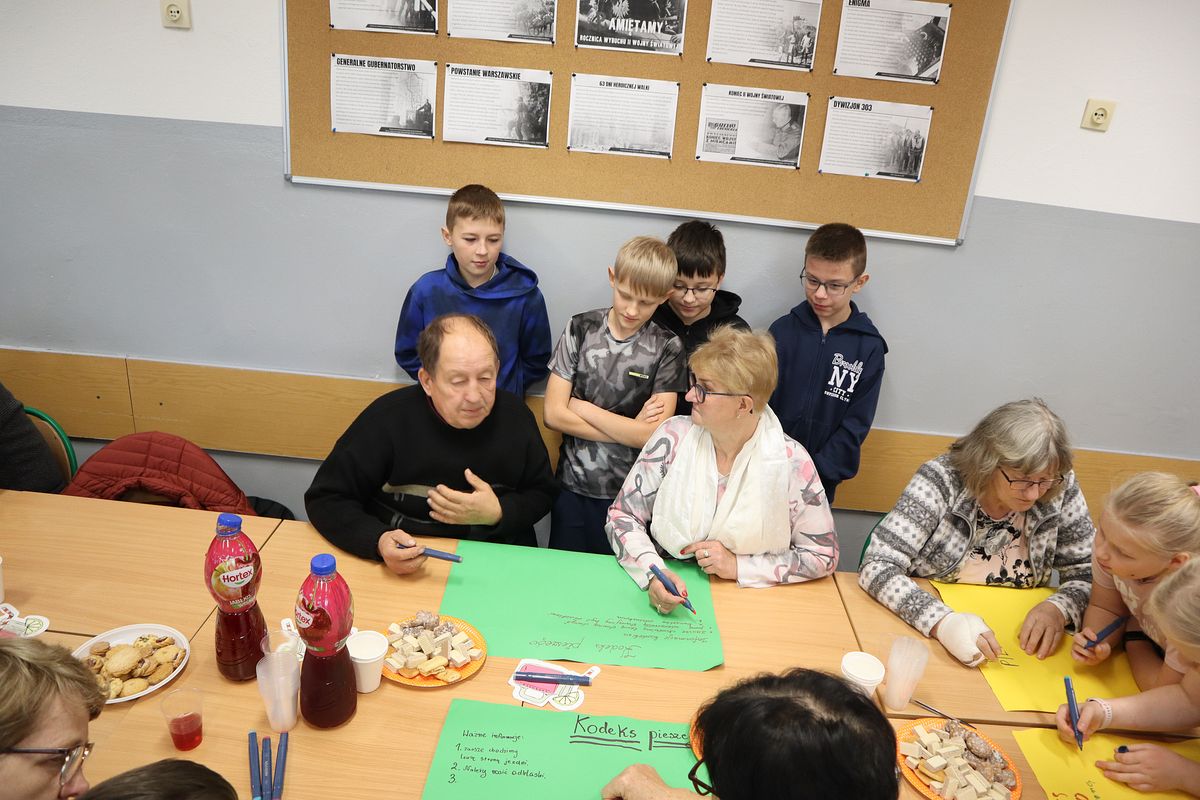 W miłej atmosferze wyświetlono film edukacyjny promujący odpowiedzialne i partnerskie uczestniczenie w ruchu drogowym. W części warsztatowej babcie i dziadkowie wraz ze swoimi wnukami z klasy V, tworzyli kodeksy pieszych, w których zawarte zostały najistotniejsze rady dotyczące poruszania się po poboczach, chodnikach i przejściach dla pieszych