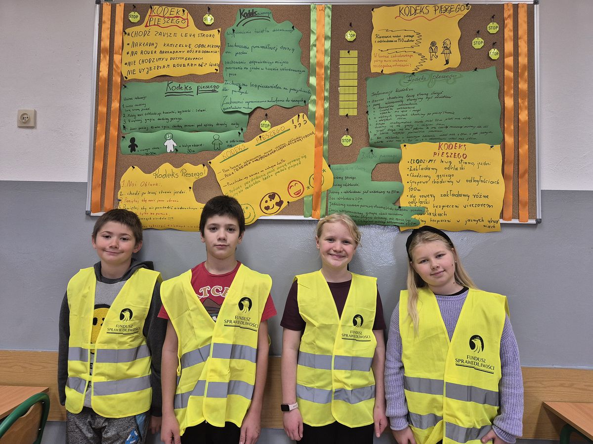 Uczniowie klasy V, w ramach działań akcji „Odblaskowa szkoła”2025, przygotowali gazetkę ścienną z zasadami poruszania się pieszych uczestników ruchu. „Odblaskowe kodeksy pieszych” pomagali tworzyć uczniom ich dziadkowie podczas wcześniejszego spotkania. Następnie uczniowie uporządkowali zebrane materiały, wyselekcjonowali najistotniejsze treści i opracowali przystępną formę zaprezentowania wspólnej pracy. Efektem było przypomnienie zasad poruszania się podczas pieszych wędrówek i zachęcenie do noszenia elementów odblaskowych.