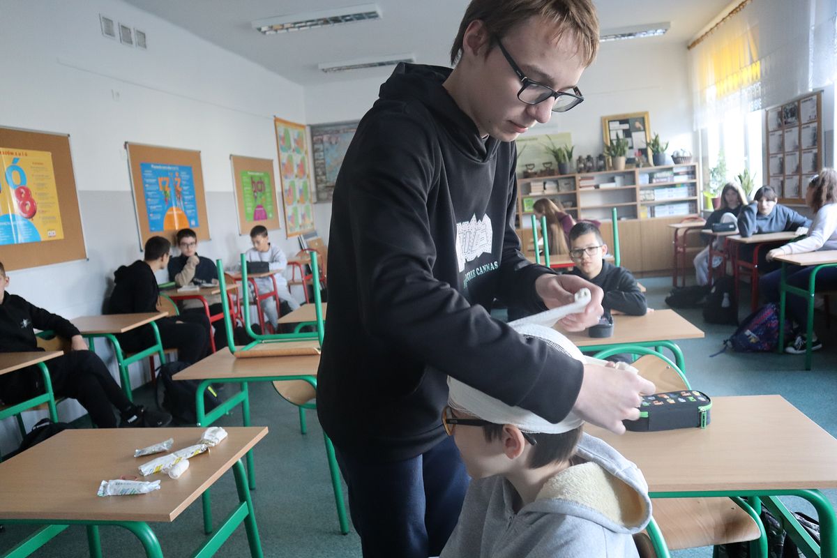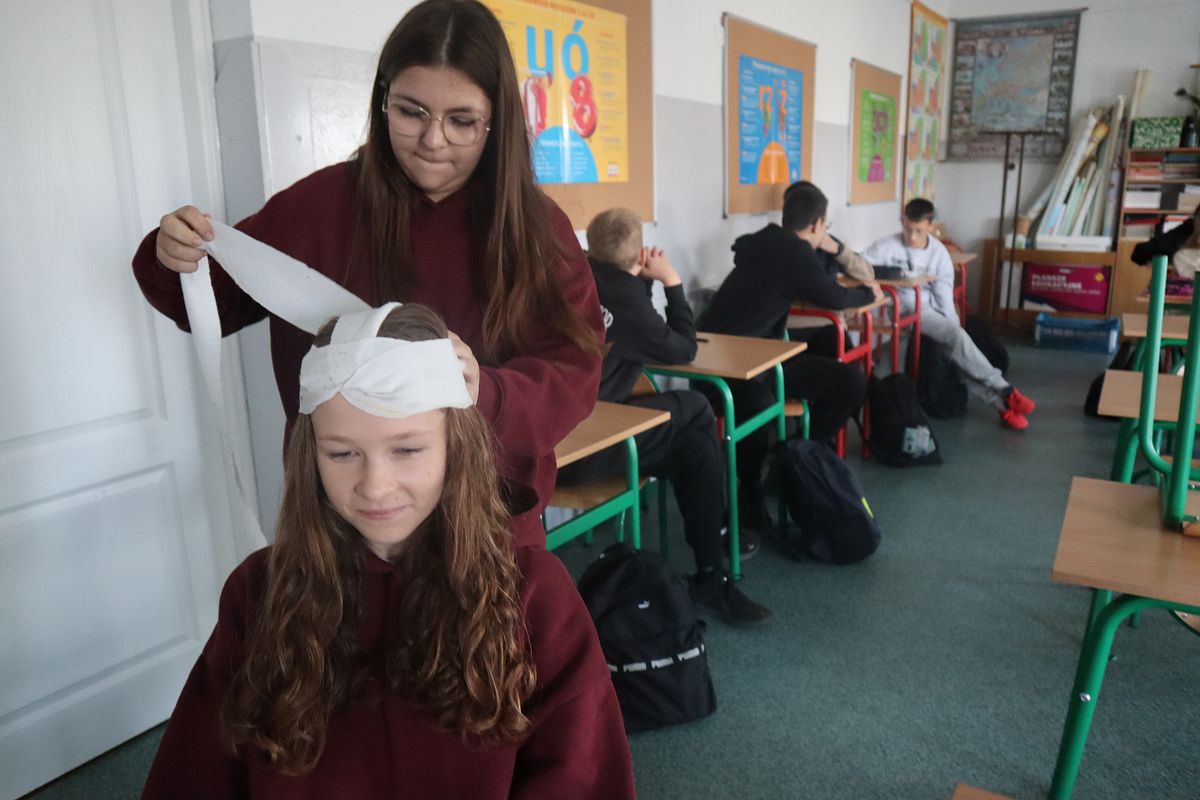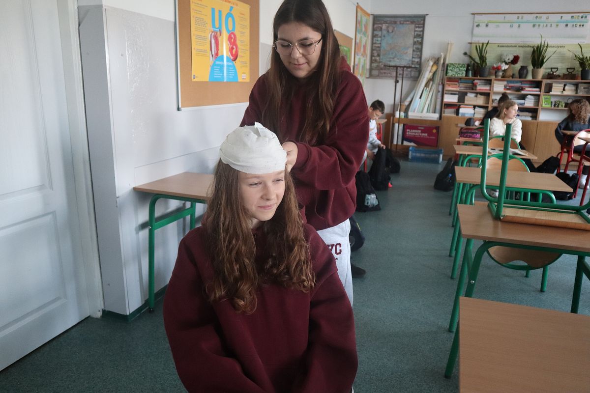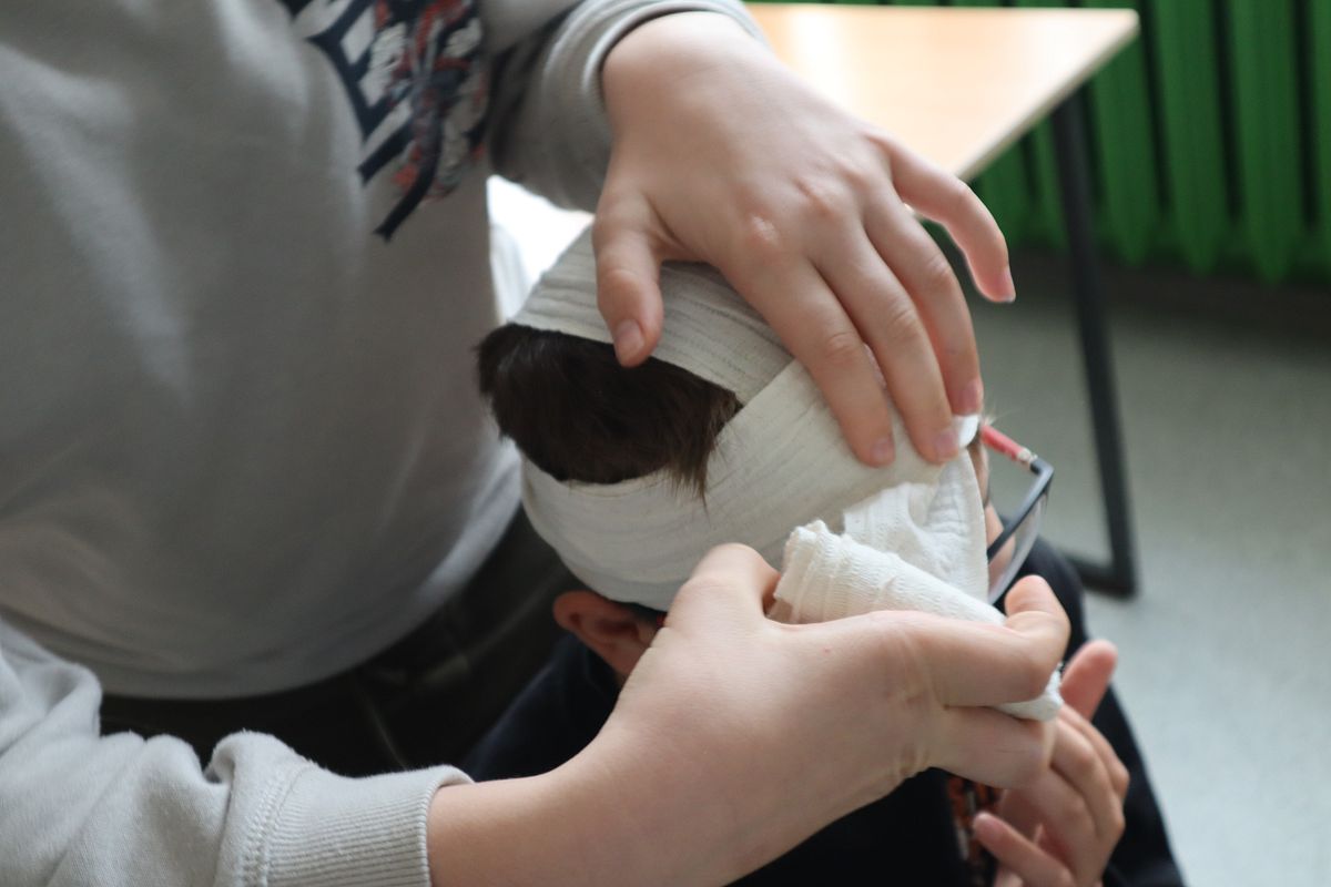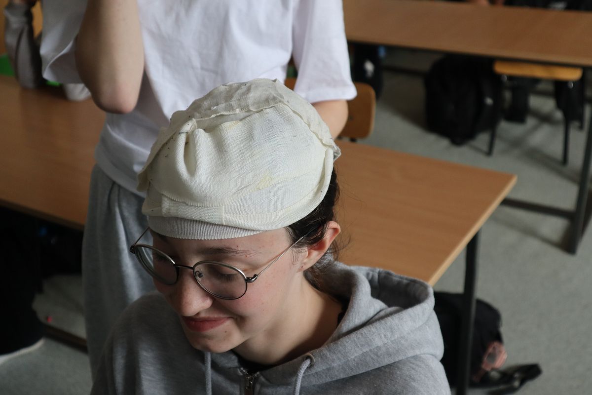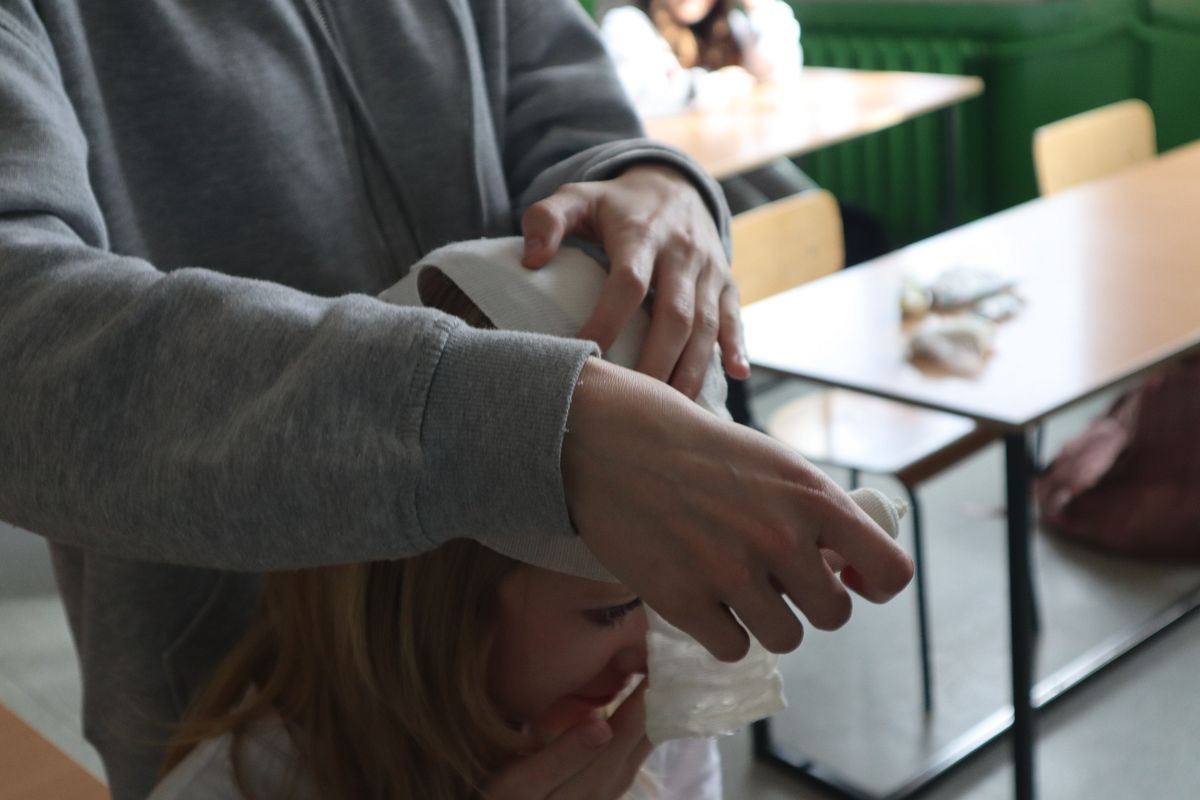 Praktyczne umiejętności opatrywania różnego rodzaju zranień okazały się niejednokrotnie dużym wyzwaniem. Uczniowie z zaangażowaniem podejmowali kolejne wyznaczane im zadania.