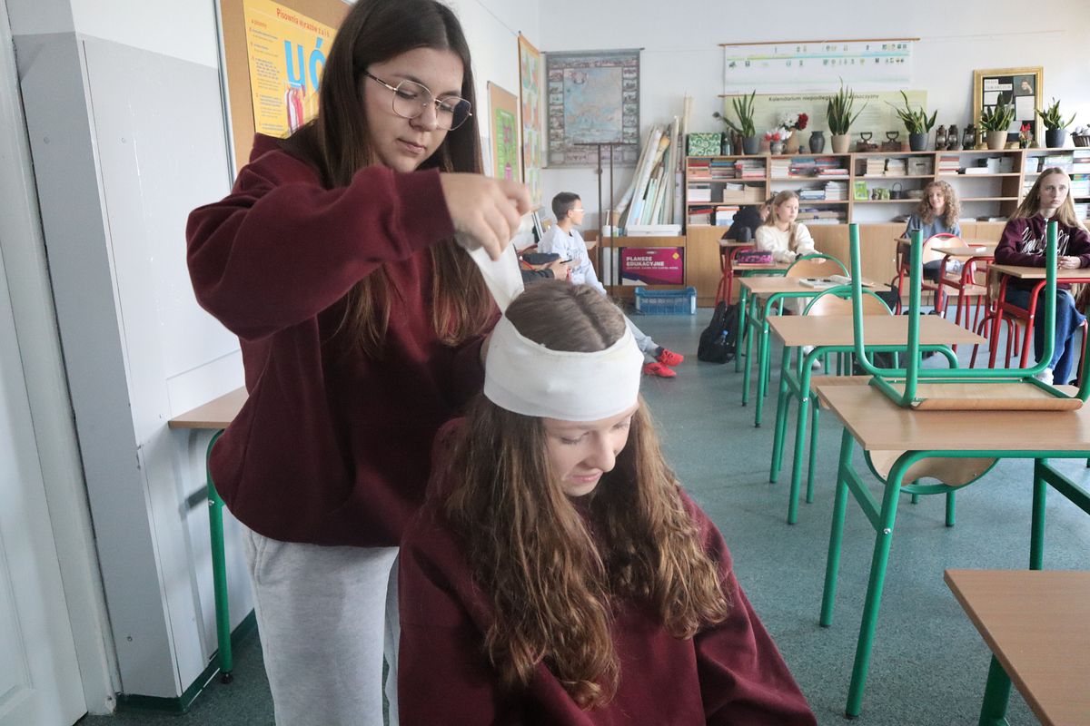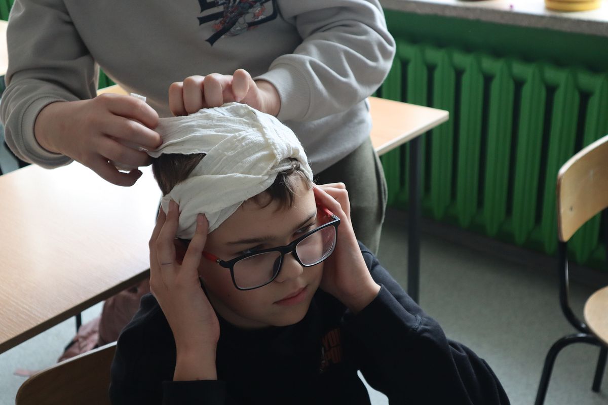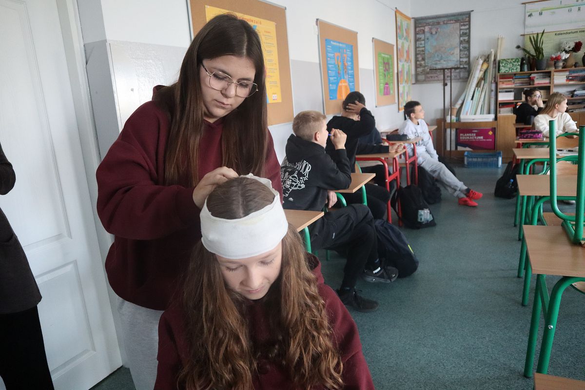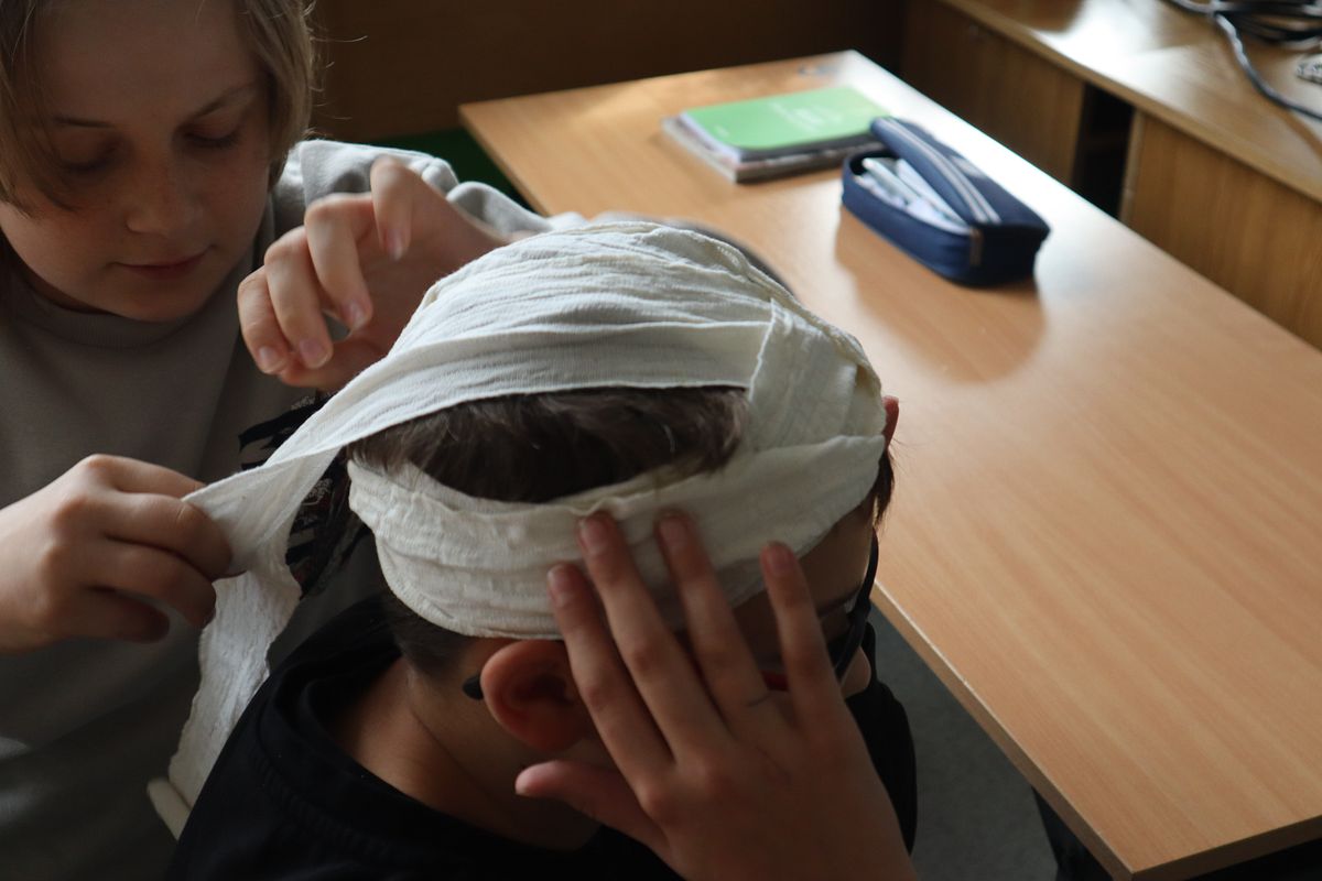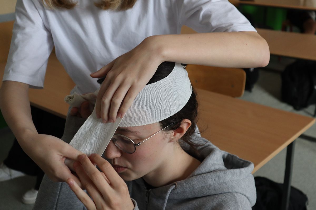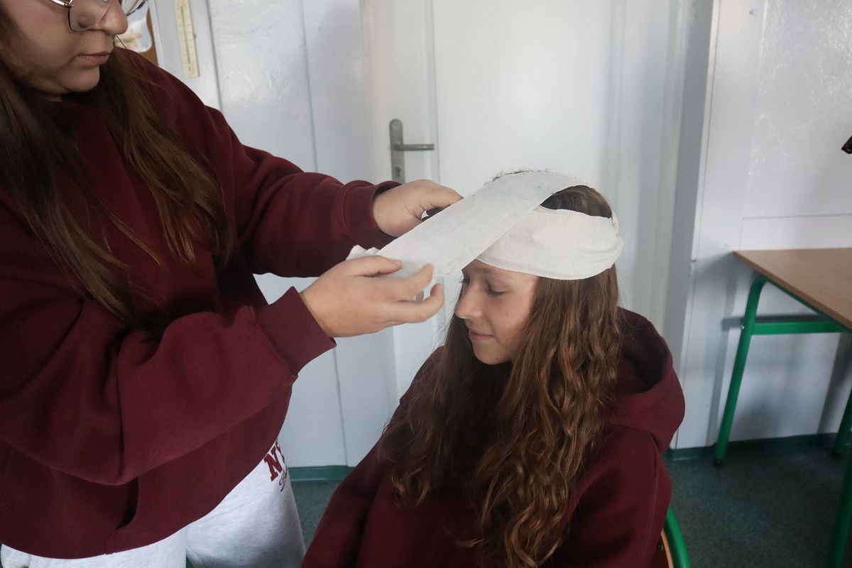 Praktyczne umiejętności opatrywania różnego rodzaju zranień okazały się niejednokrotnie dużym wyzwaniem. Uczniowie z zaangażowaniem podejmowali kolejne wyznaczane im zadania.