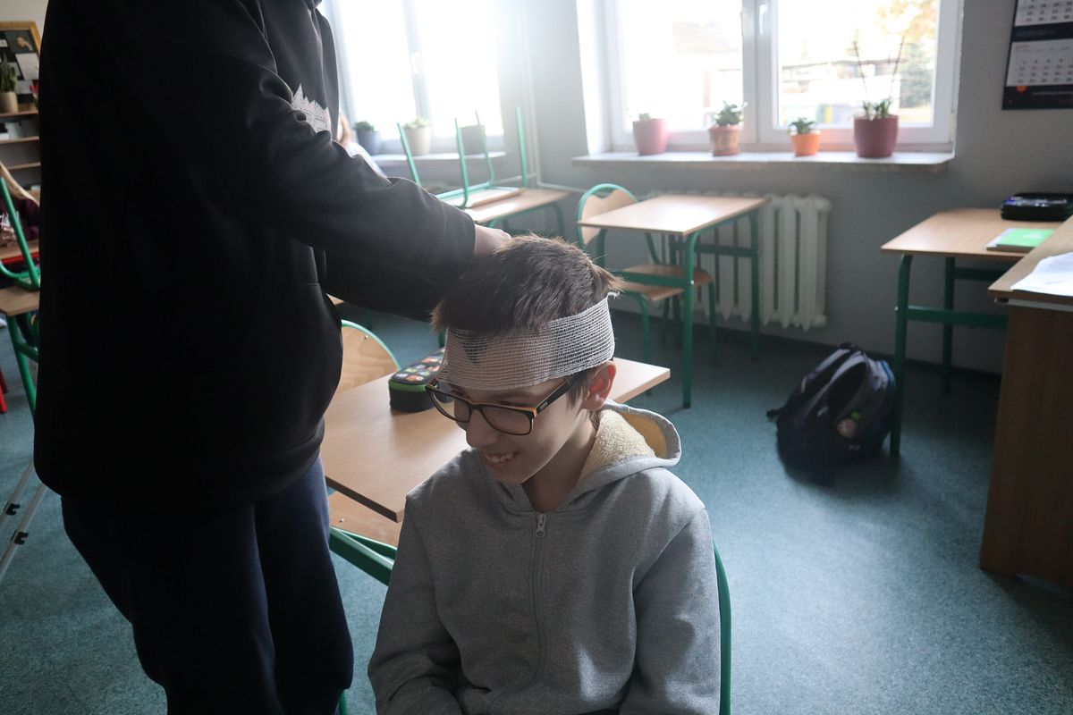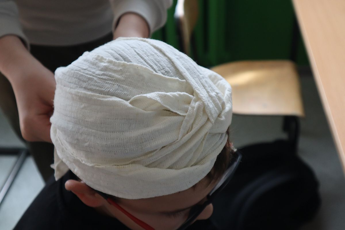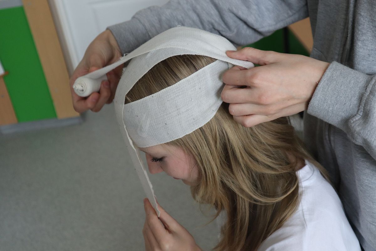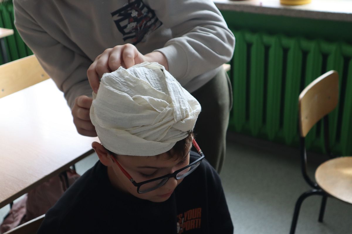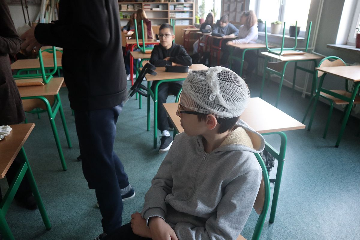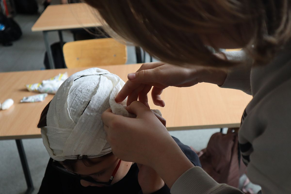 Praktyczne umiejętności opatrywania różnego rodzaju zranień okazały się niejednokrotnie dużym wyzwaniem. Uczniowie z zaangażowaniem podejmowali kolejne wyznaczane im zadania.