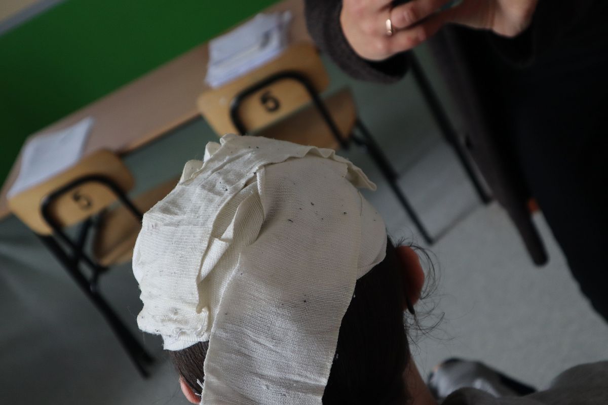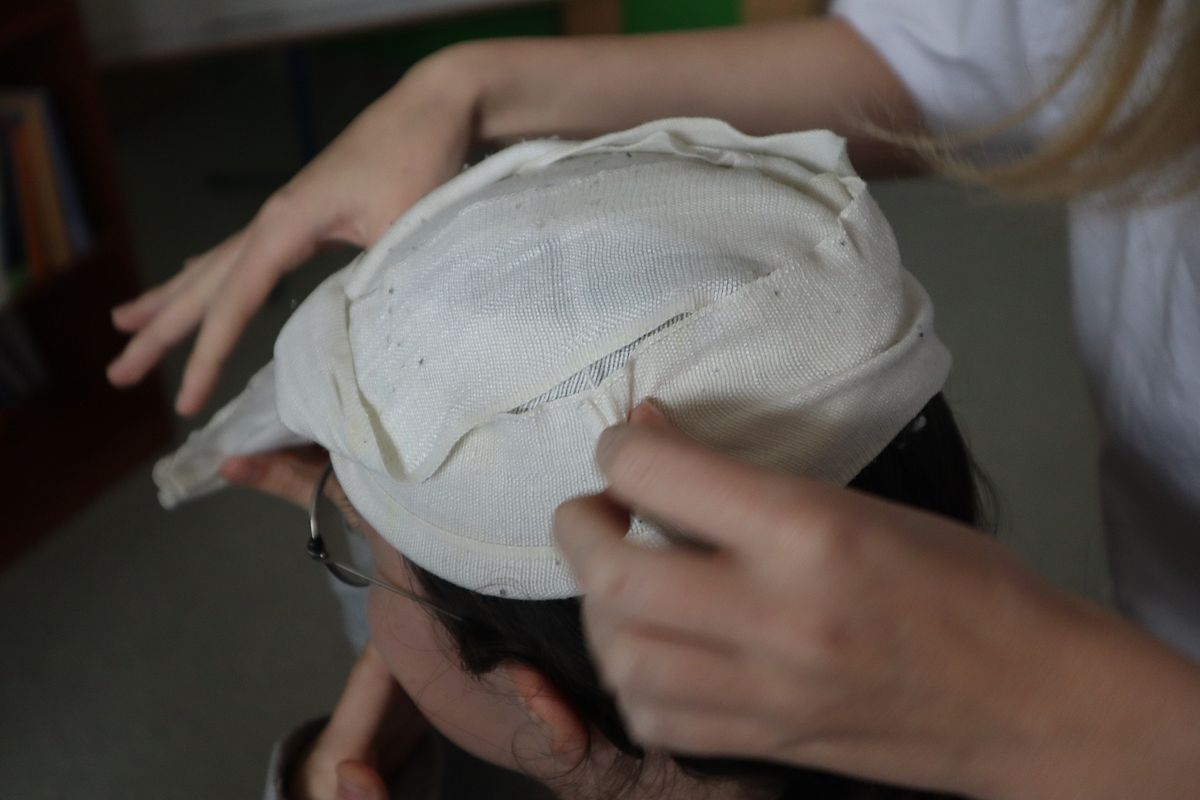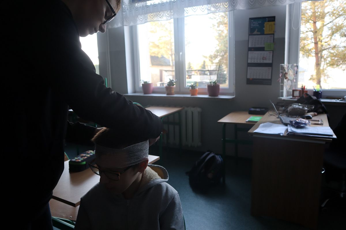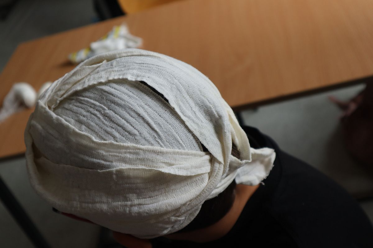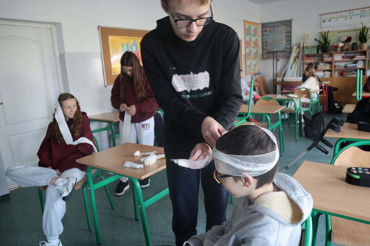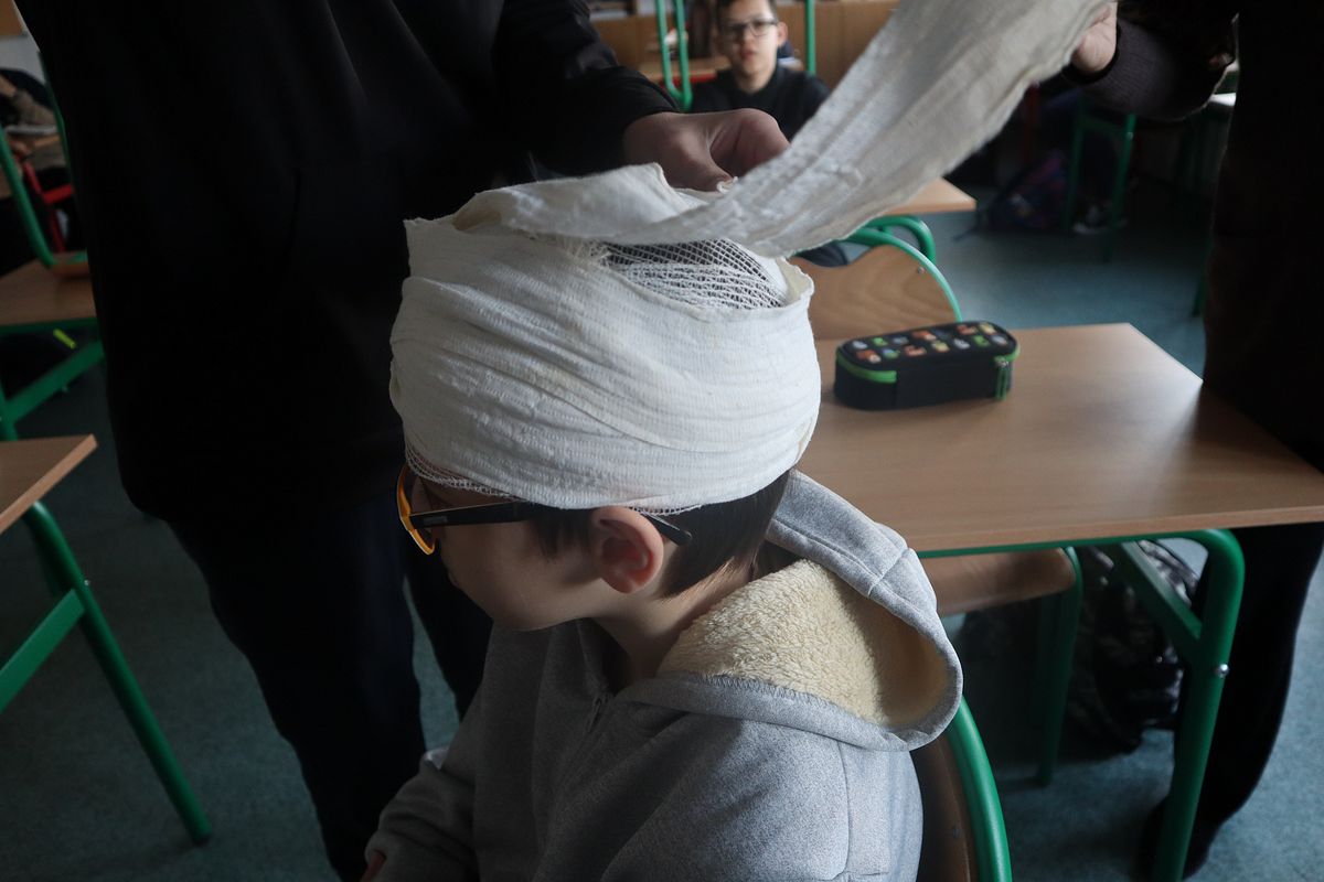 Praktyczne umiejętności opatrywania różnego rodzaju zranień okazały się niejednokrotnie dużym wyzwaniem. Uczniowie z zaangażowaniem podejmowali kolejne wyznaczane im zadania.