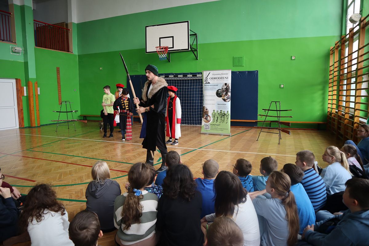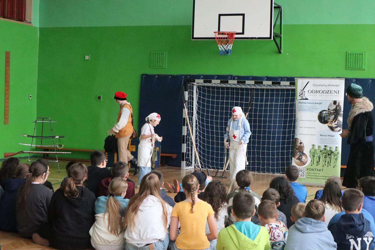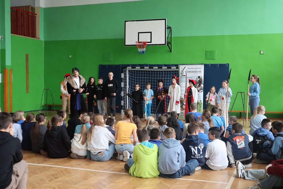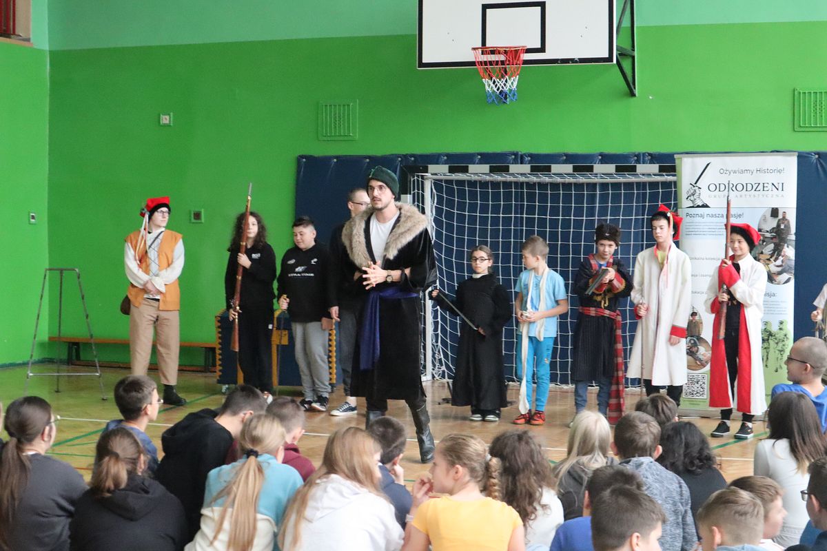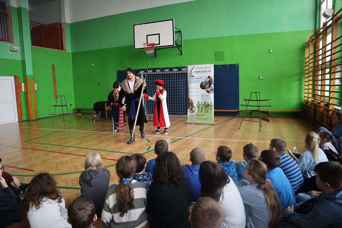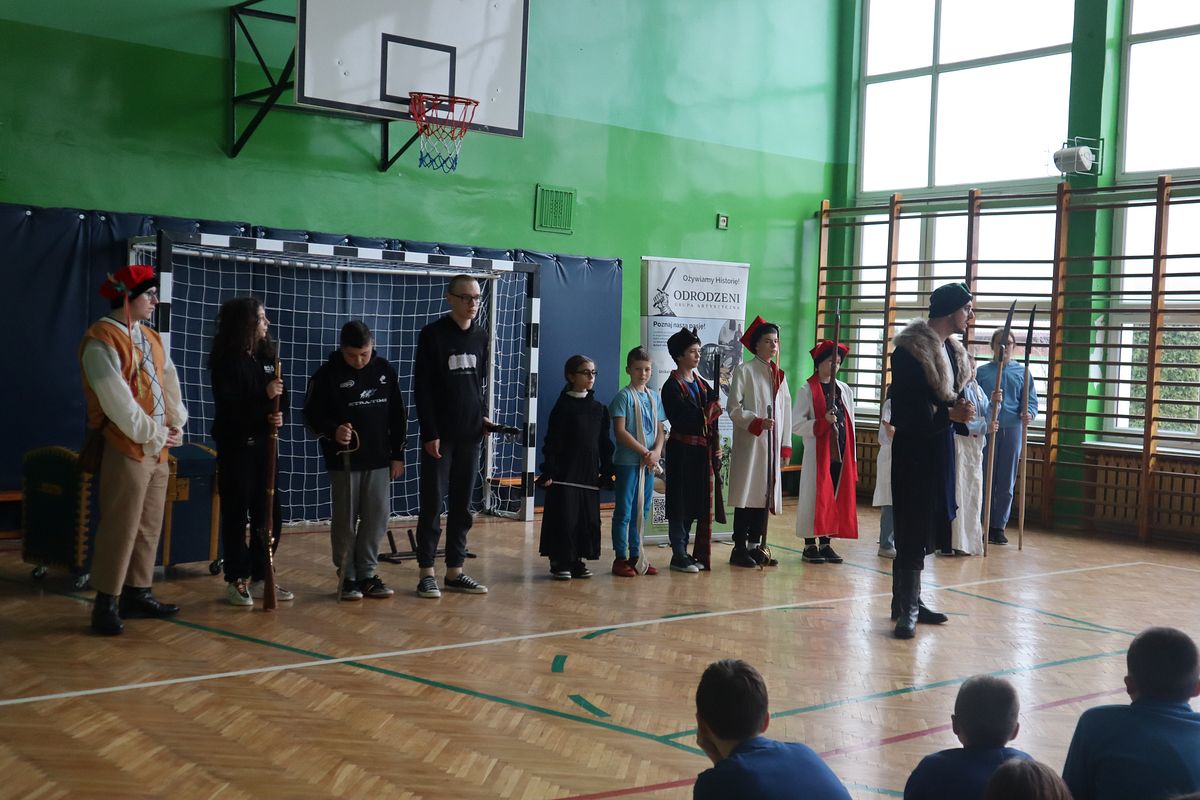 Uczniowie klas 4-8 chętnie wzięli udział w widowisku historycznym przygotowanym przez grupę artystyczną „Odrodzeni". Prowadzący przypominali o przyczynach rozbiorów Rzeczypospolitej i utracie przez nasze państwo niepodległości w XVIII wieku. Przywołane zostały postacie bohaterów narodowych: Tadeusza Kościuszki, Jana Henryka Dąbrowskiego i Piotra Wysockiego. „Żywa lekcja historii” w interesujący sposób nakreśliła wydarzenia związane z Insurekcją Kościuszkowską, utworzeniem Legionów Polskich we Włoszech i Powstaniem Listopadowym. Można było zobaczyć repliki sprzętu bojowego i wyposażenia powstańców oraz stroje z epoki walki narodowowyzwoleńczych. Dzięki temu spotkaniu nasi uczniowie mogli lepiej zrozumieć sytuację Polaków pod zaborami i ich pragnienie wolności.