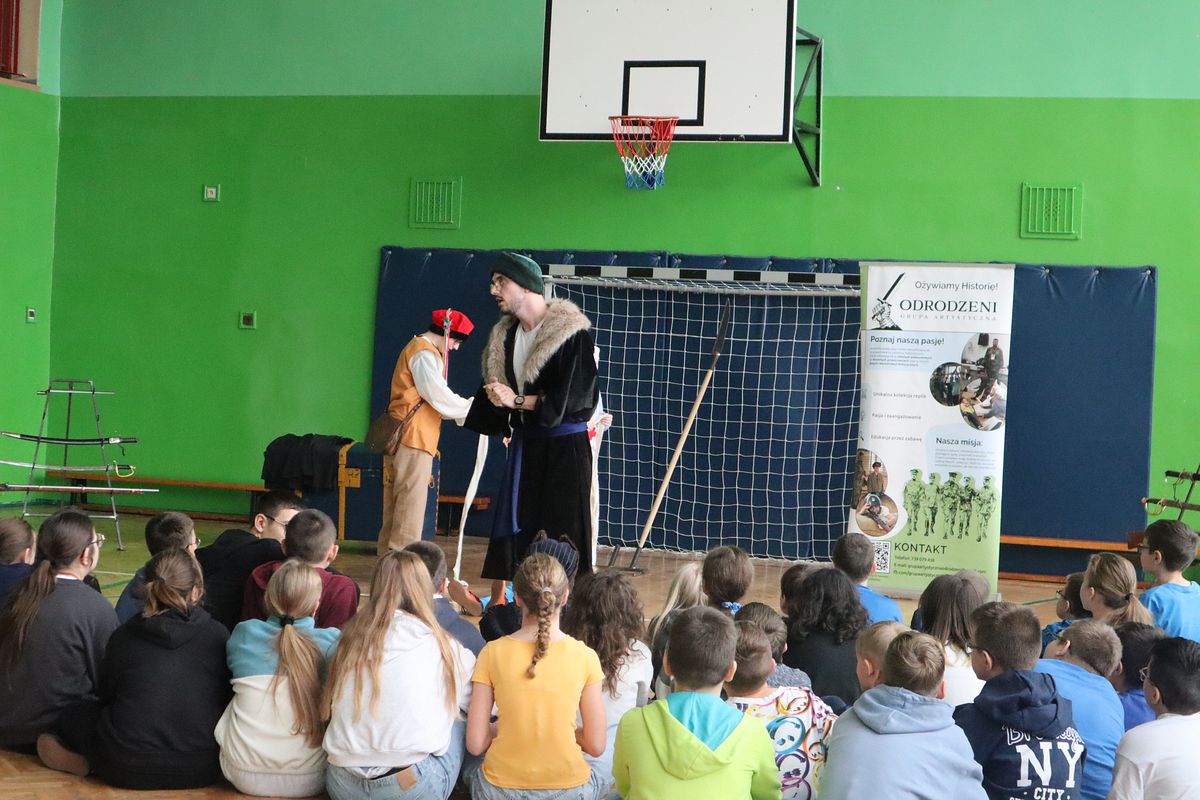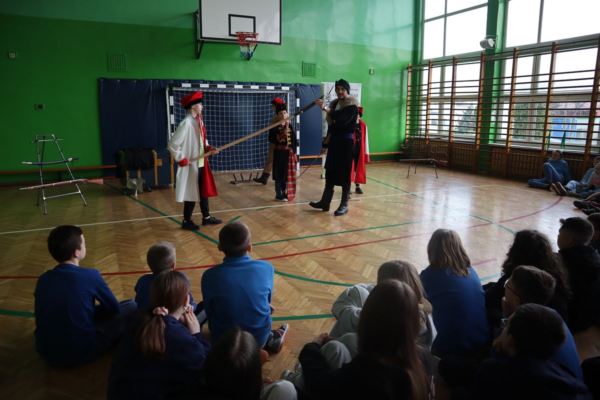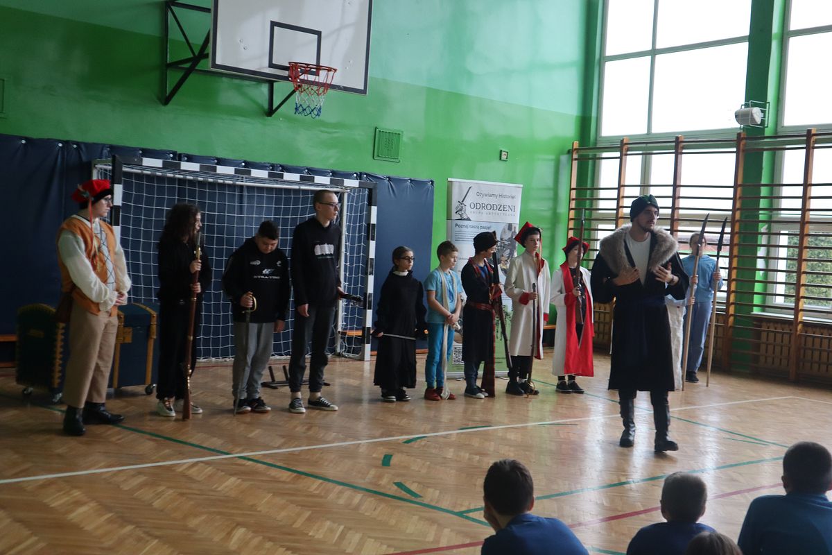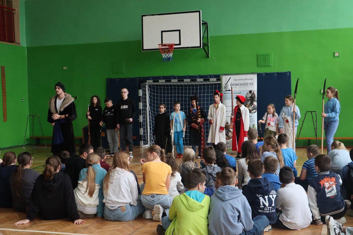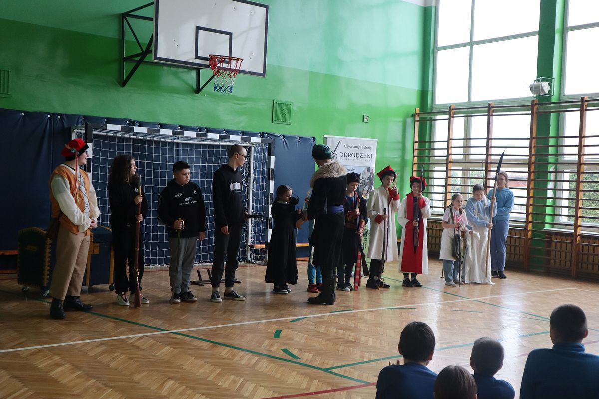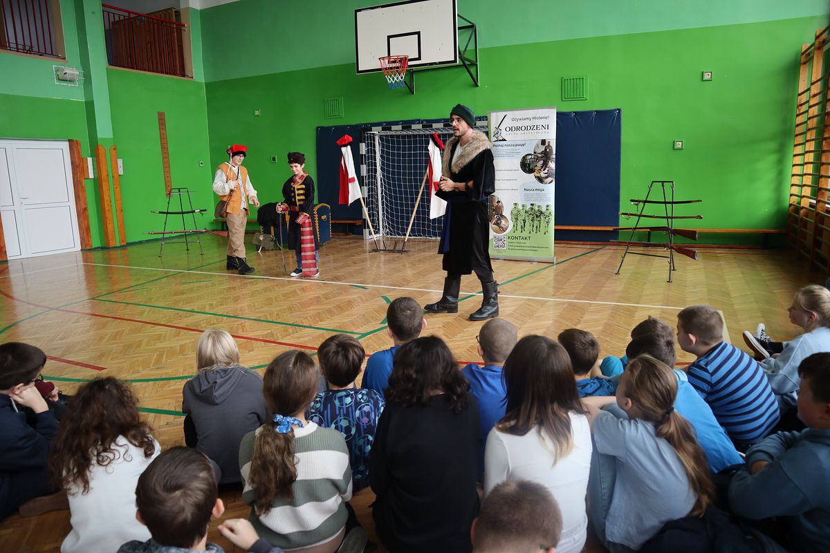 Uczniowie klas 4-8 chętnie wzięli udział w widowisku historycznym przygotowanym przez grupę artystyczną „Odrodzeni". Prowadzący przypominali o przyczynach rozbiorów Rzeczypospolitej i utracie przez nasze państwo niepodległości w XVIII wieku. Przywołane zostały postacie bohaterów narodowych: Tadeusza Kościuszki, Jana Henryka Dąbrowskiego i Piotra Wysockiego. „Żywa lekcja historii” w interesujący sposób nakreśliła wydarzenia związane z Insurekcją Kościuszkowską, utworzeniem Legionów Polskich we Włoszech i Powstaniem Listopadowym. Można było zobaczyć repliki sprzętu bojowego i wyposażenia powstańców oraz stroje z epoki walki narodowowyzwoleńczych. Dzięki temu spotkaniu nasi uczniowie mogli lepiej zrozumieć sytuację Polaków pod zaborami i ich pragnienie wolności.