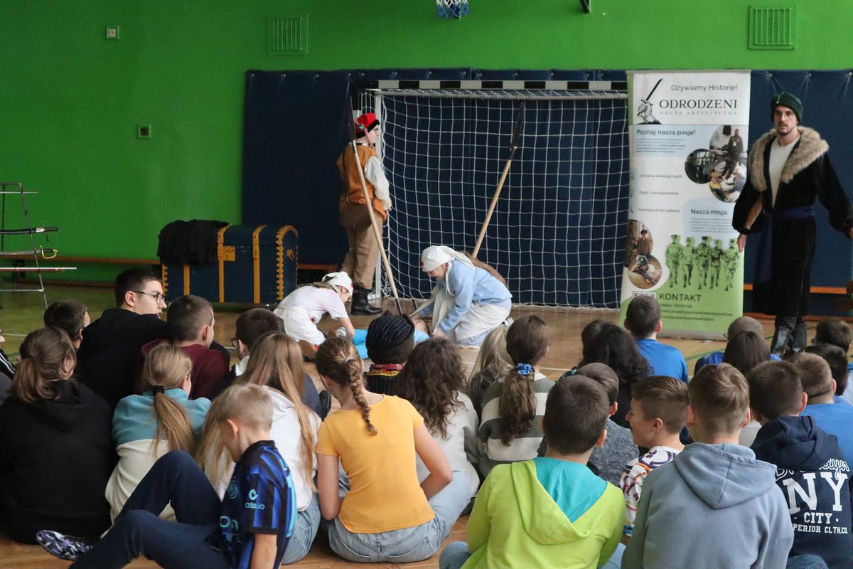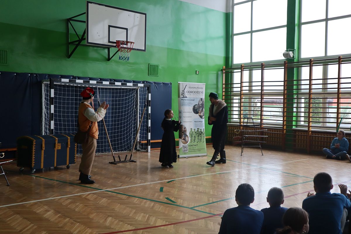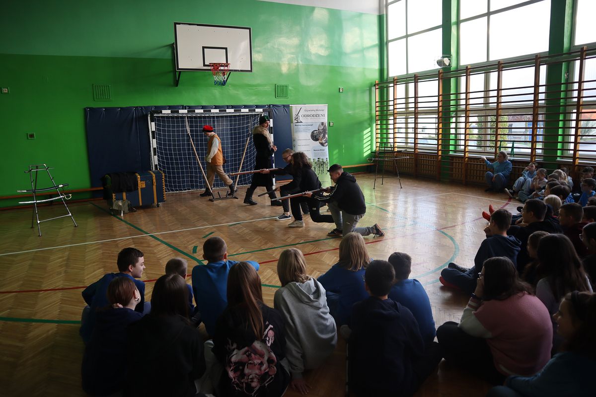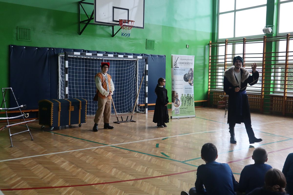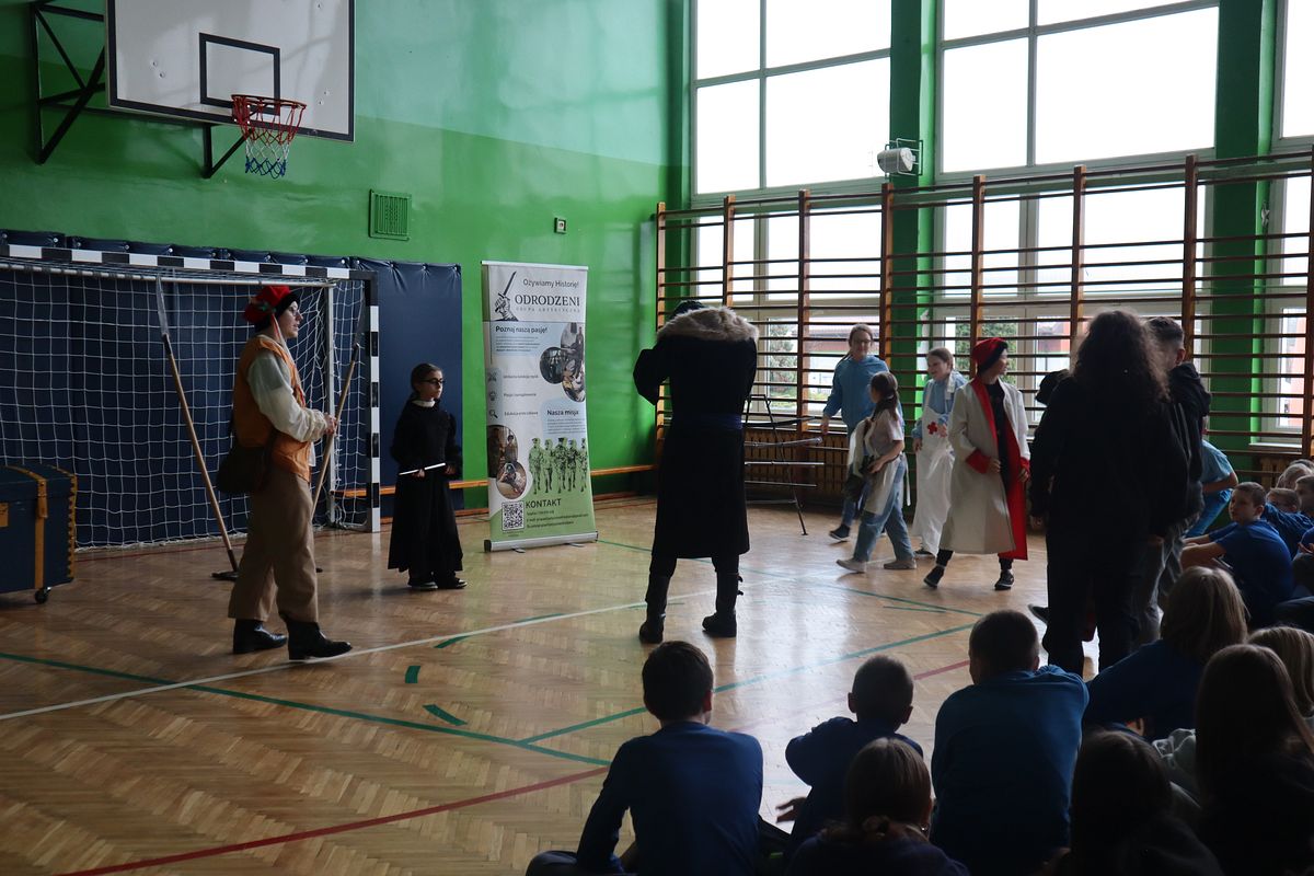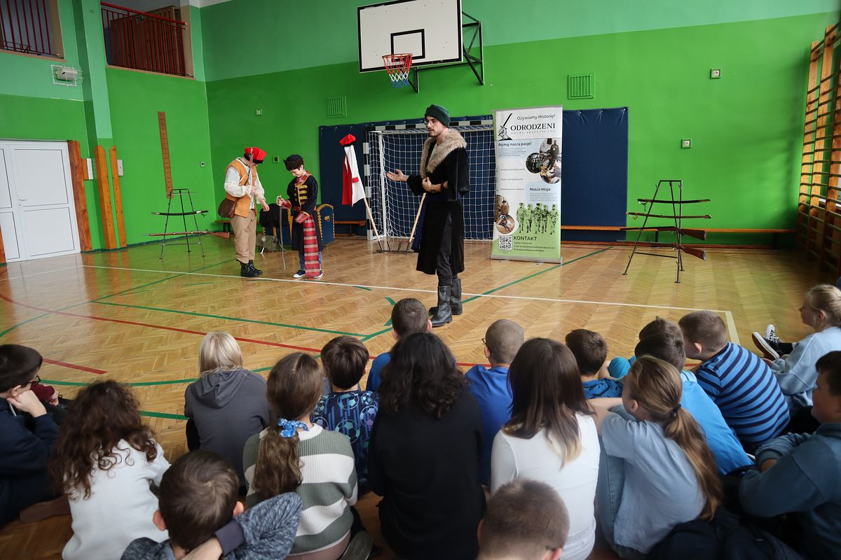 Uczniowie klas 4-8 chętnie wzięli udział w widowisku historycznym przygotowanym przez grupę artystyczną „Odrodzeni". Prowadzący przypominali o przyczynach rozbiorów Rzeczypospolitej i utracie przez nasze państwo niepodległości w XVIII wieku. Przywołane zostały postacie bohaterów narodowych: Tadeusza Kościuszki, Jana Henryka Dąbrowskiego i Piotra Wysockiego. „Żywa lekcja historii” w interesujący sposób nakreśliła wydarzenia związane z Insurekcją Kościuszkowską, utworzeniem Legionów Polskich we Włoszech i Powstaniem Listopadowym. Można było zobaczyć repliki sprzętu bojowego i wyposażenia powstańców oraz stroje z epoki walki narodowowyzwoleńczych. Dzięki temu spotkaniu nasi uczniowie mogli lepiej zrozumieć sytuację Polaków pod zaborami i ich pragnienie wolności.