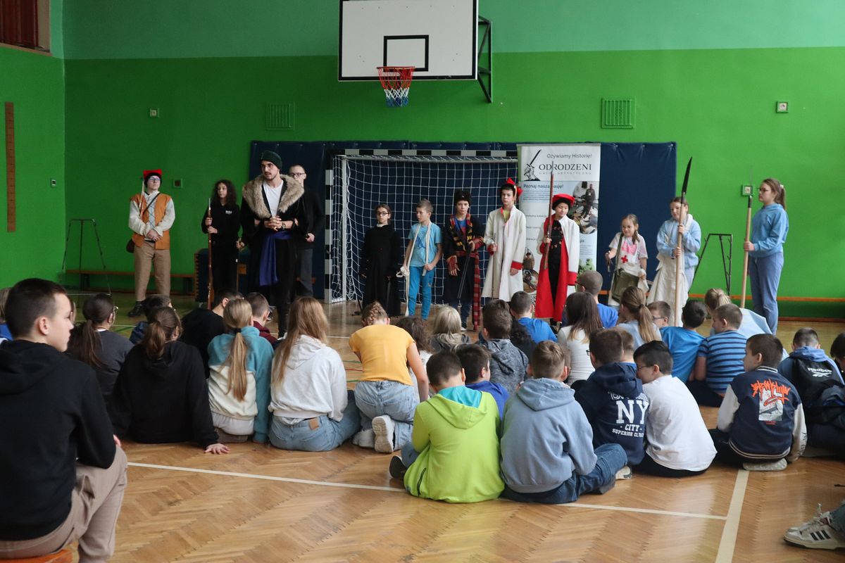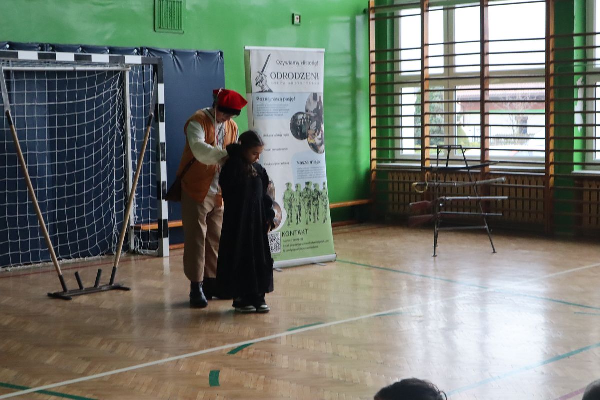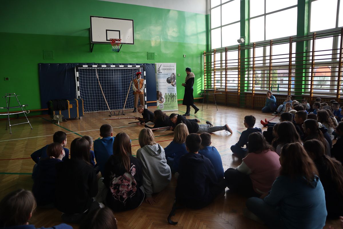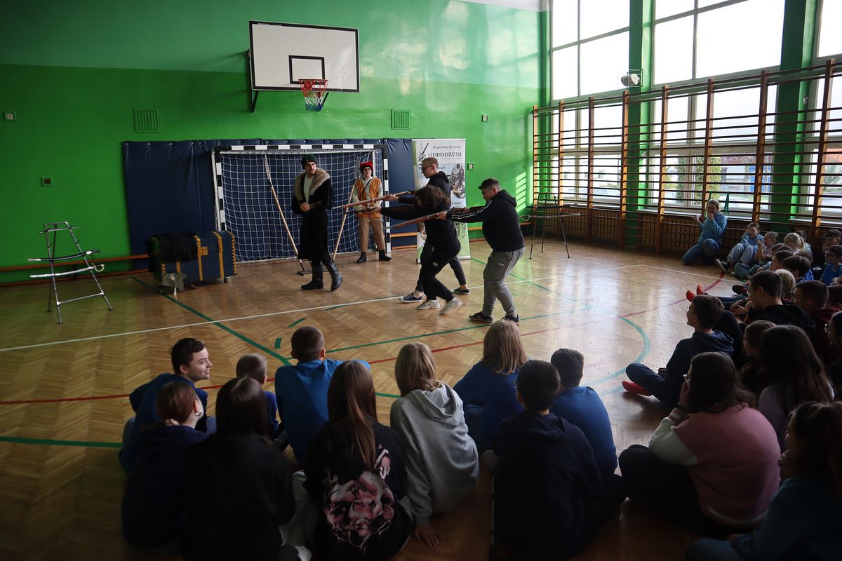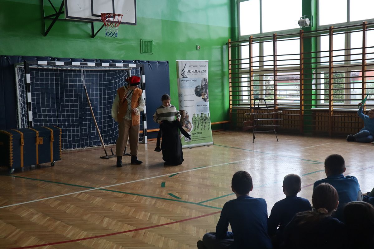Uczniowie klas 4-8 chętnie wzięli udział w widowisku historycznym przygotowanym przez grupę artystyczną „Odrodzeni". Prowadzący przypominali o przyczynach rozbiorów Rzeczypospolitej i utracie przez nasze państwo niepodległości w XVIII wieku. Przywołane zostały postacie bohaterów narodowych: Tadeusza Kościuszki, Jana Henryka Dąbrowskiego i Piotra Wysockiego. „Żywa lekcja historii” w interesujący sposób nakreśliła wydarzenia związane z Insurekcją Kościuszkowską, utworzeniem Legionów Polskich we Włoszech i Powstaniem Listopadowym. Można było zobaczyć repliki sprzętu bojowego i wyposażenia powstańców oraz stroje z epoki walki narodowowyzwoleńczych. Dzięki temu spotkaniu nasi uczniowie mogli lepiej zrozumieć sytuację Polaków pod zaborami i ich pragnienie wolności.