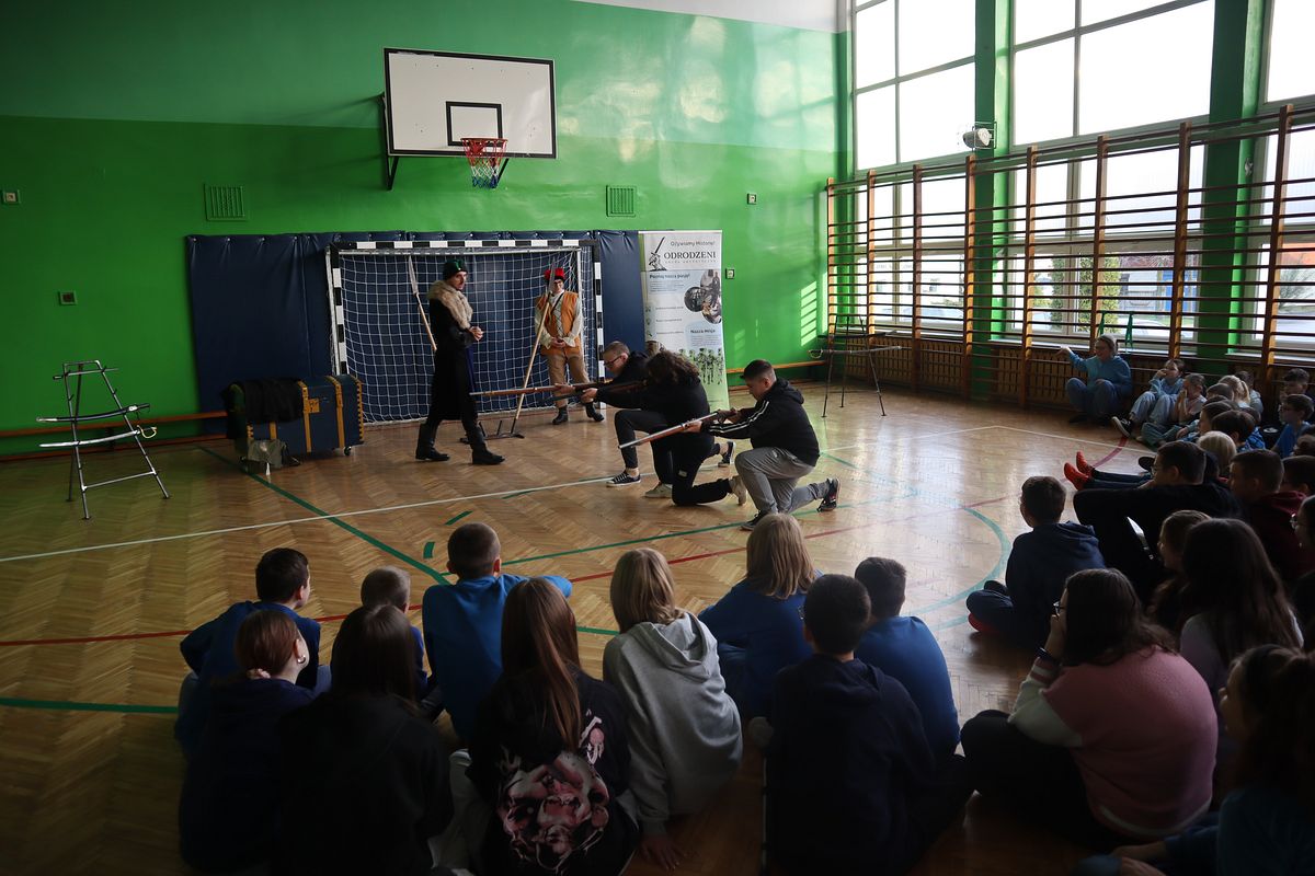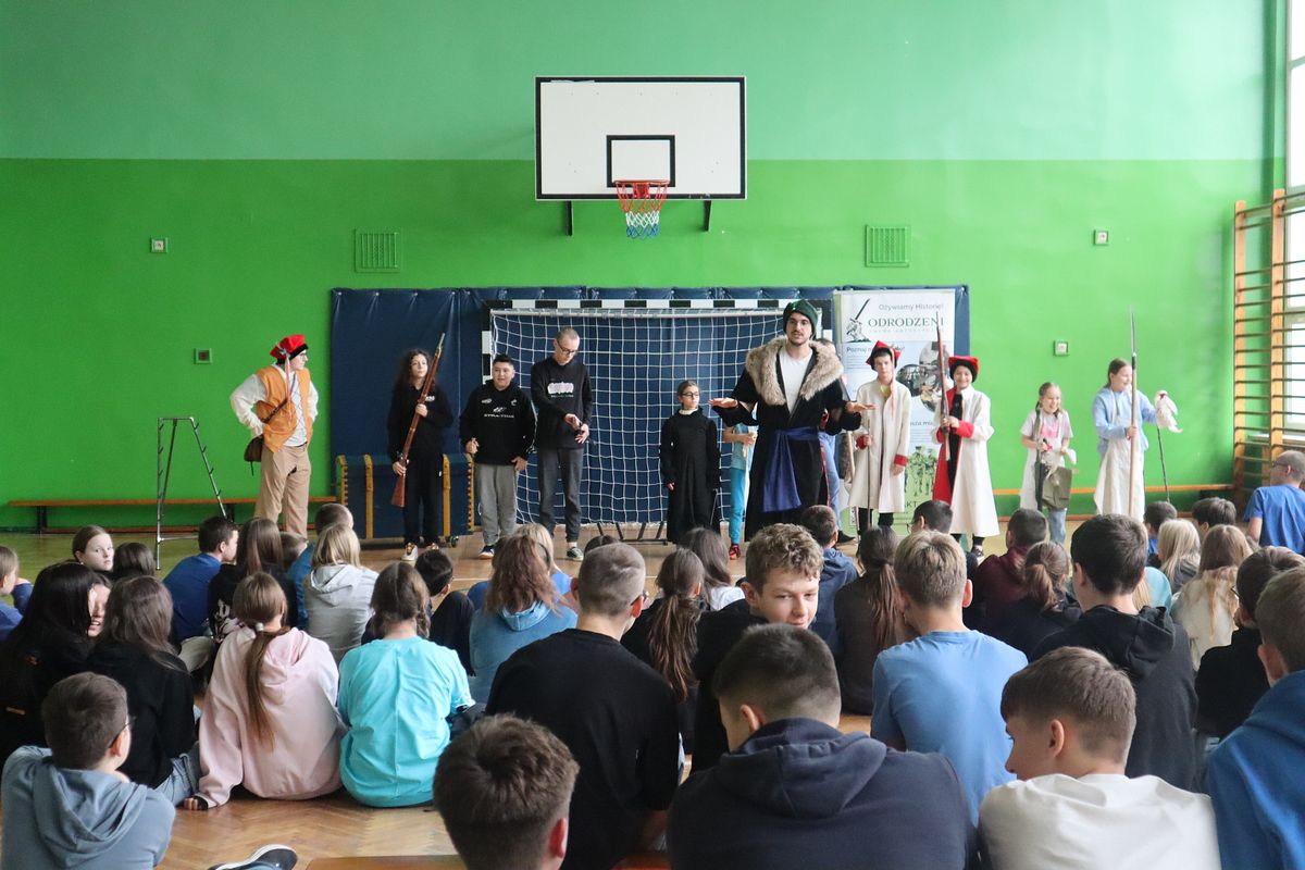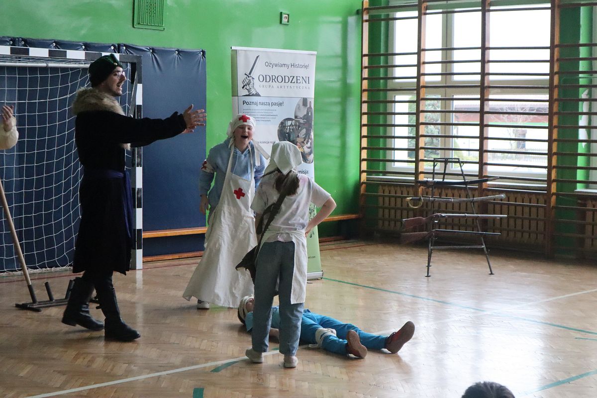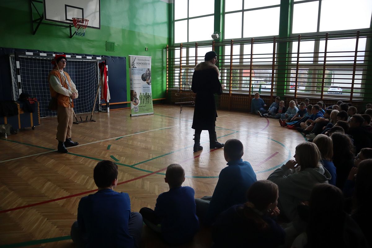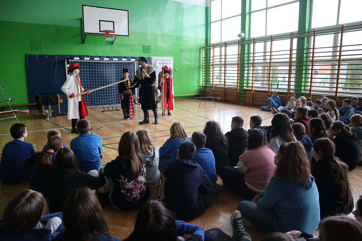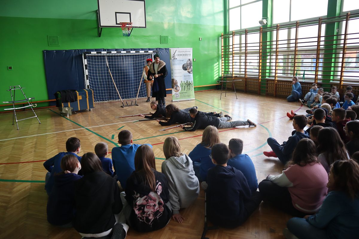 Uczniowie klas 4-8 chętnie wzięli udział w widowisku historycznym przygotowanym przez grupę artystyczną „Odrodzeni". Prowadzący przypominali o przyczynach rozbiorów Rzeczypospolitej i utracie przez nasze państwo niepodległości w XVIII wieku. Przywołane zostały postacie bohaterów narodowych: Tadeusza Kościuszki, Jana Henryka Dąbrowskiego i Piotra Wysockiego. „Żywa lekcja historii” w interesujący sposób nakreśliła wydarzenia związane z Insurekcją Kościuszkowską, utworzeniem Legionów Polskich we Włoszech i Powstaniem Listopadowym. Można było zobaczyć repliki sprzętu bojowego i wyposażenia powstańców oraz stroje z epoki walki narodowowyzwoleńczych. Dzięki temu spotkaniu nasi uczniowie mogli lepiej zrozumieć sytuację Polaków pod zaborami i ich pragnienie wolności.