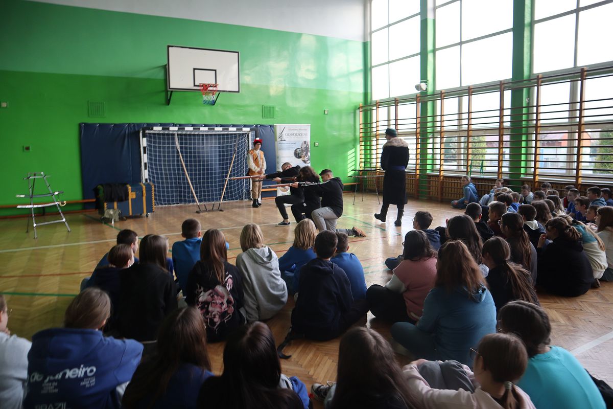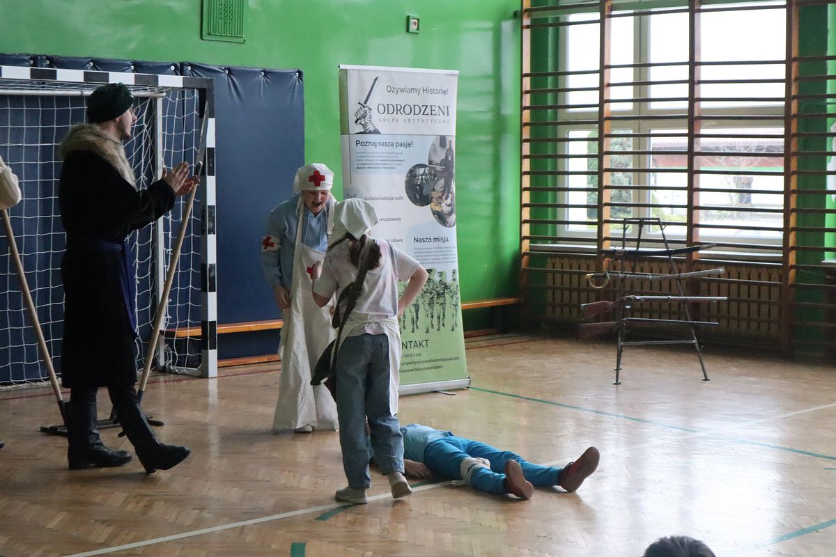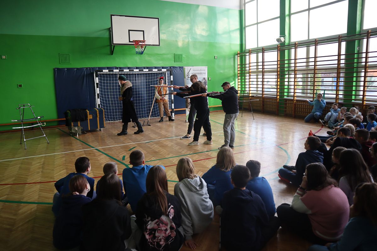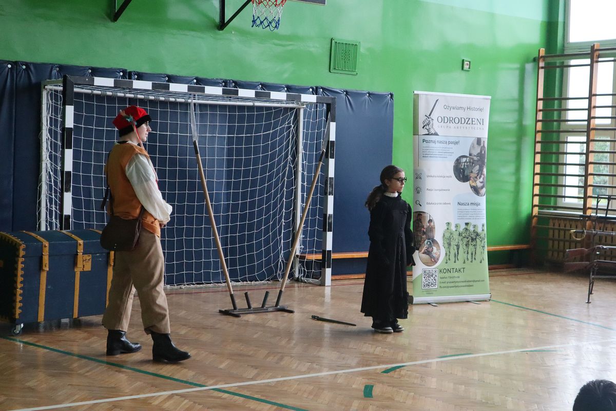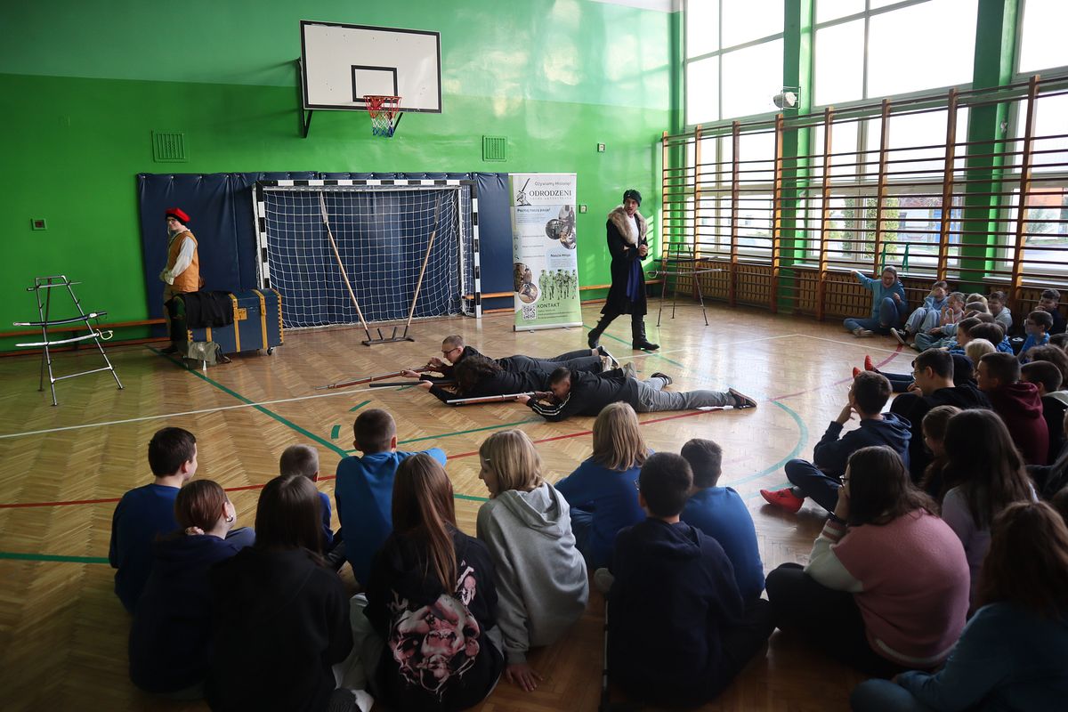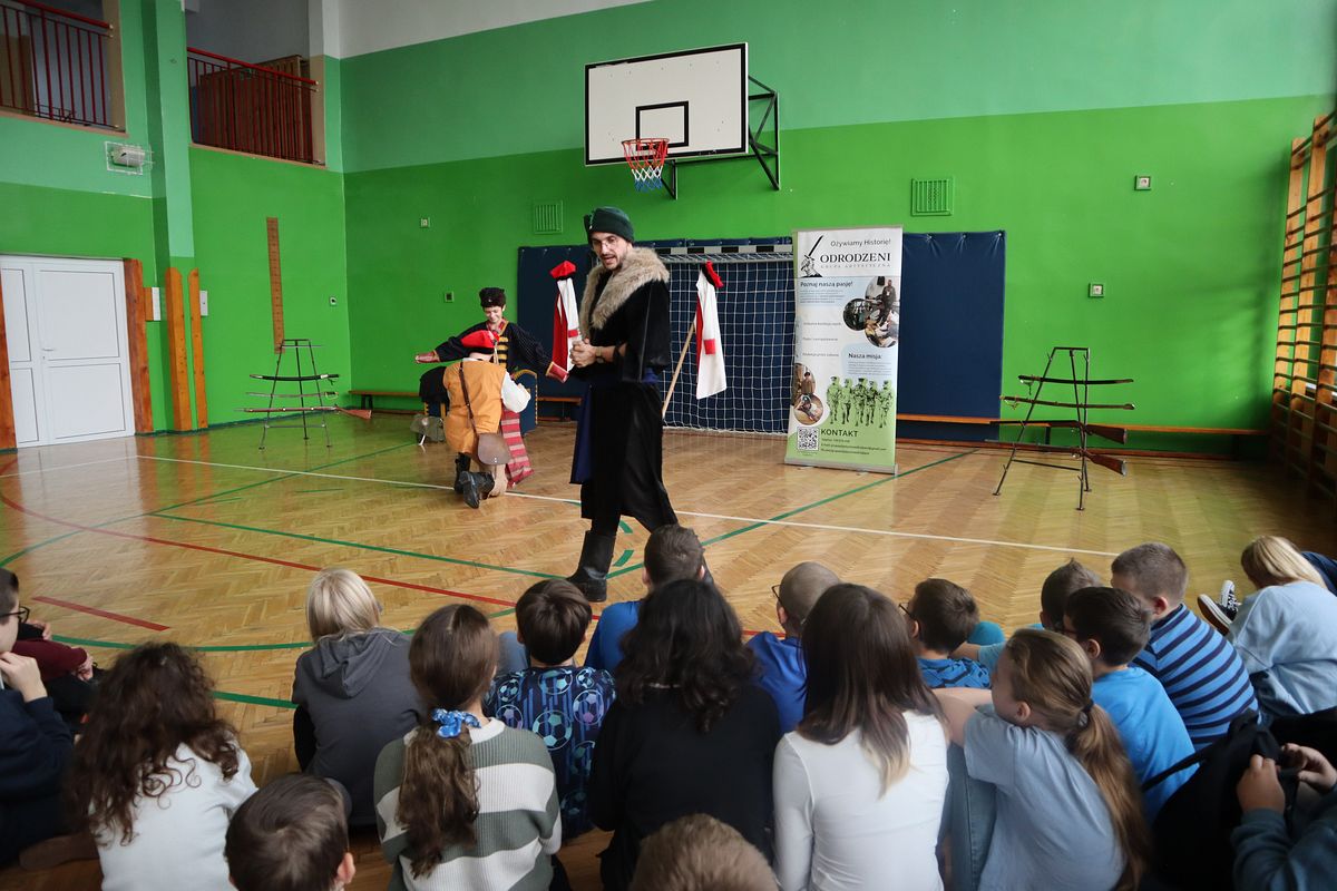 Uczniowie klas 4-8 chętnie wzięli udział w widowisku historycznym przygotowanym przez grupę artystyczną „Odrodzeni". Prowadzący przypominali o przyczynach rozbiorów Rzeczypospolitej i utracie przez nasze państwo niepodległości w XVIII wieku. Przywołane zostały postacie bohaterów narodowych: Tadeusza Kościuszki, Jana Henryka Dąbrowskiego i Piotra Wysockiego. „Żywa lekcja historii” w interesujący sposób nakreśliła wydarzenia związane z Insurekcją Kościuszkowską, utworzeniem Legionów Polskich we Włoszech i Powstaniem Listopadowym. Można było zobaczyć repliki sprzętu bojowego i wyposażenia powstańców oraz stroje z epoki walki narodowowyzwoleńczych. Dzięki temu spotkaniu nasi uczniowie mogli lepiej zrozumieć sytuację Polaków pod zaborami i ich pragnienie wolności.