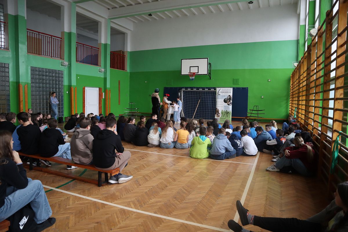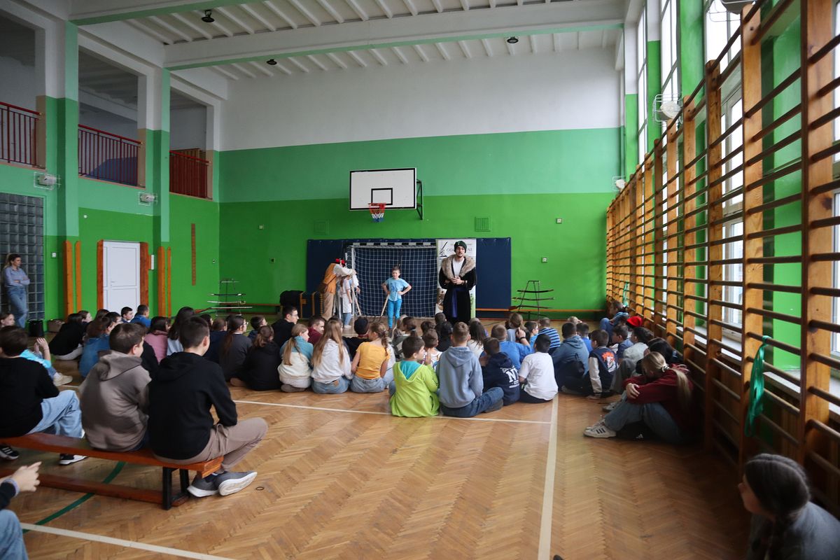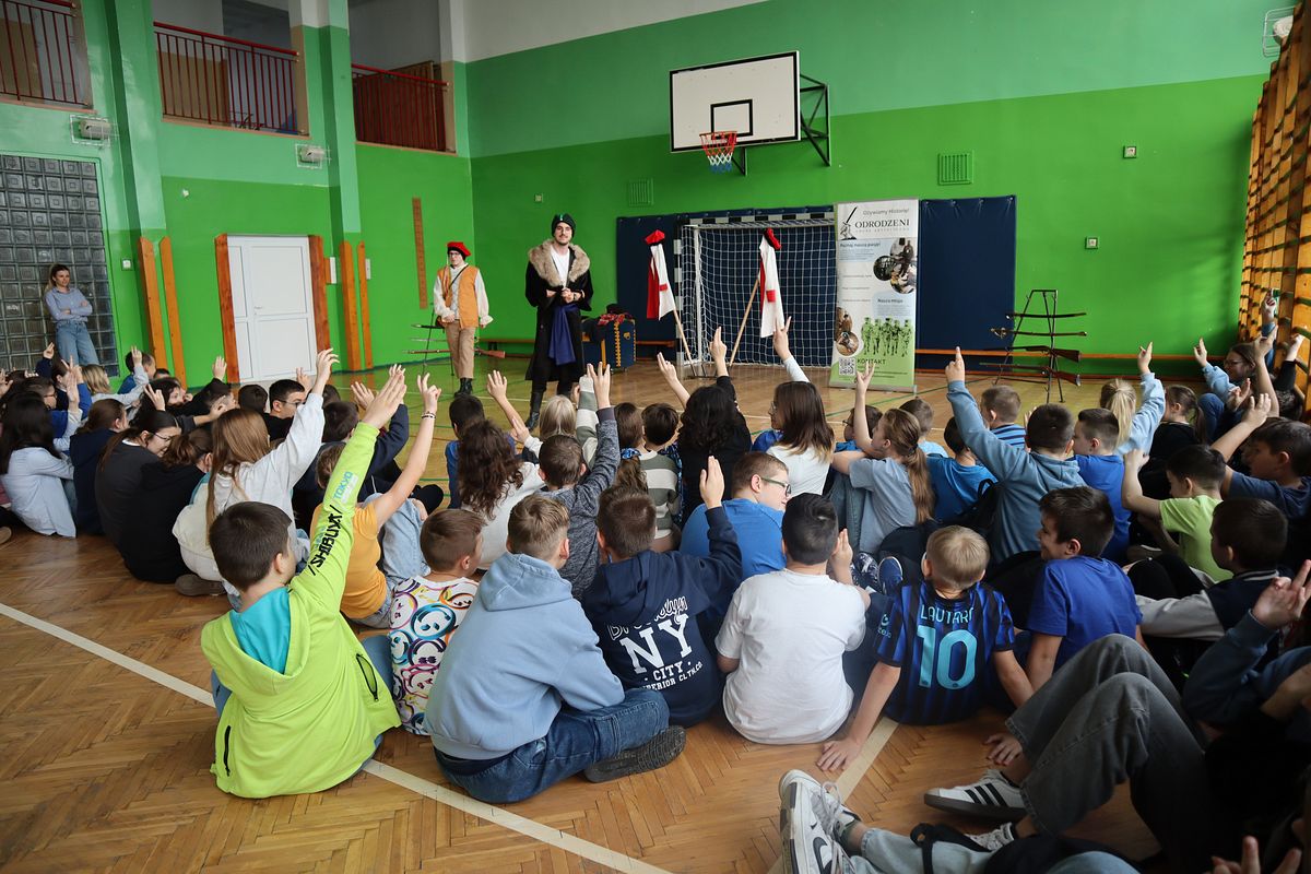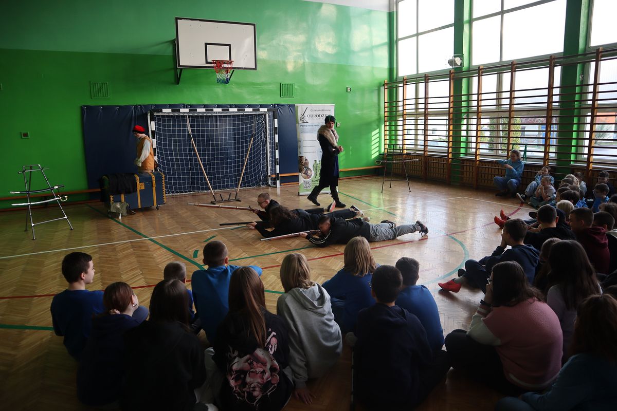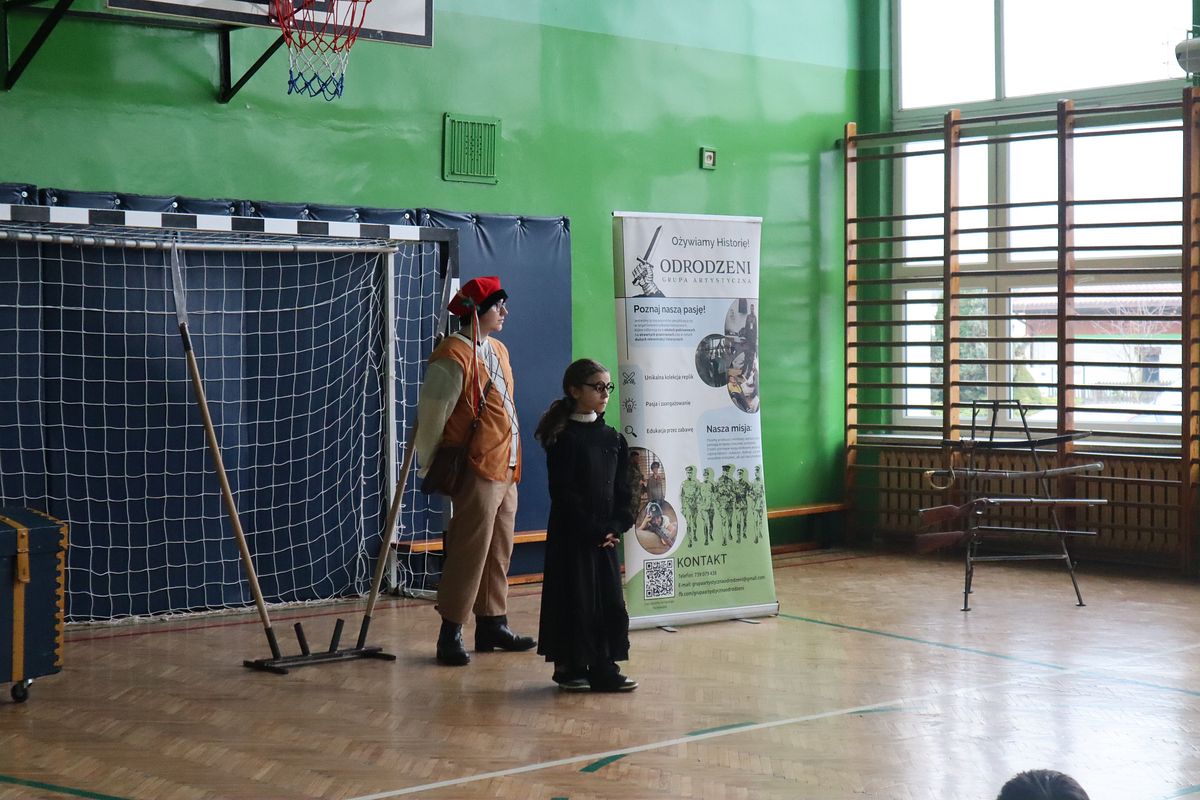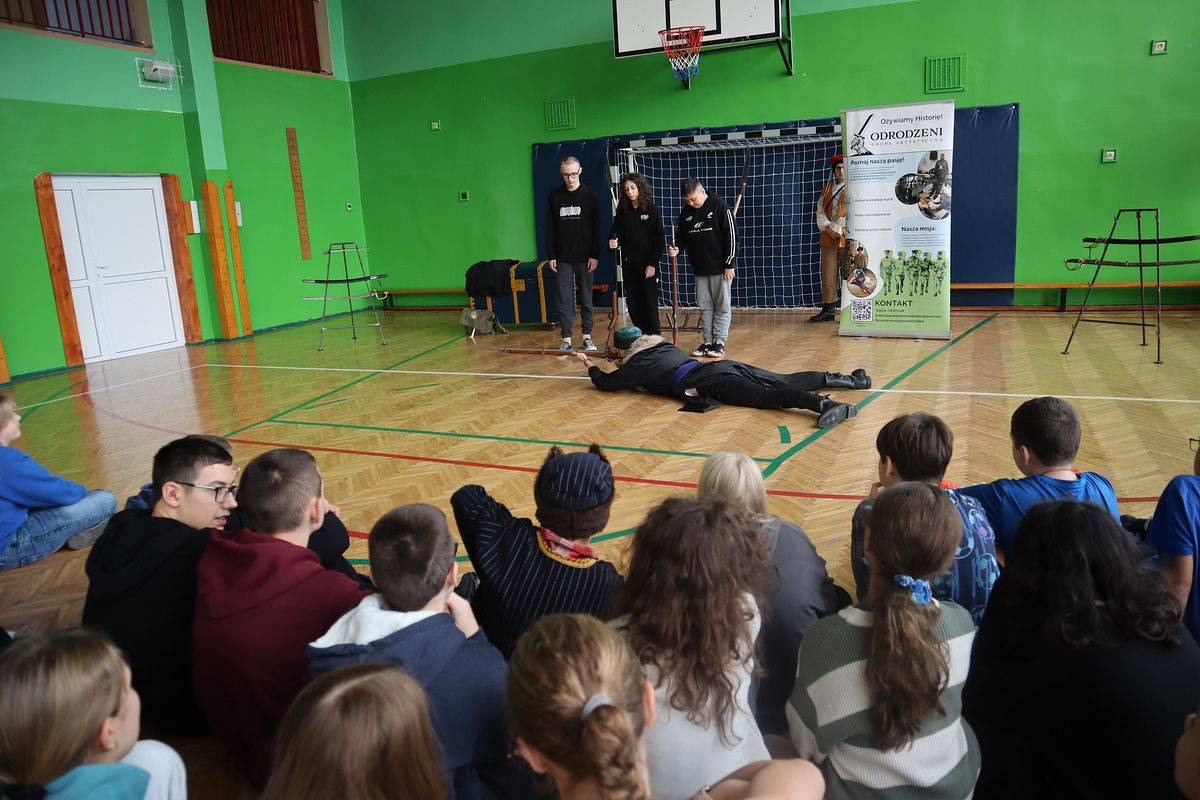 Uczniowie klas 4-8 chętnie wzięli udział w widowisku historycznym przygotowanym przez grupę artystyczną „Odrodzeni". Prowadzący przypominali o przyczynach rozbiorów Rzeczypospolitej i utracie przez nasze państwo niepodległości w XVIII wieku. Przywołane zostały postacie bohaterów narodowych: Tadeusza Kościuszki, Jana Henryka Dąbrowskiego i Piotra Wysockiego. „Żywa lekcja historii” w interesujący sposób nakreśliła wydarzenia związane z Insurekcją Kościuszkowską, utworzeniem Legionów Polskich we Włoszech i Powstaniem Listopadowym. Można było zobaczyć repliki sprzętu bojowego i wyposażenia powstańców oraz stroje z epoki walki narodowowyzwoleńczych. Dzięki temu spotkaniu nasi uczniowie mogli lepiej zrozumieć sytuację Polaków pod zaborami i ich pragnienie wolności.