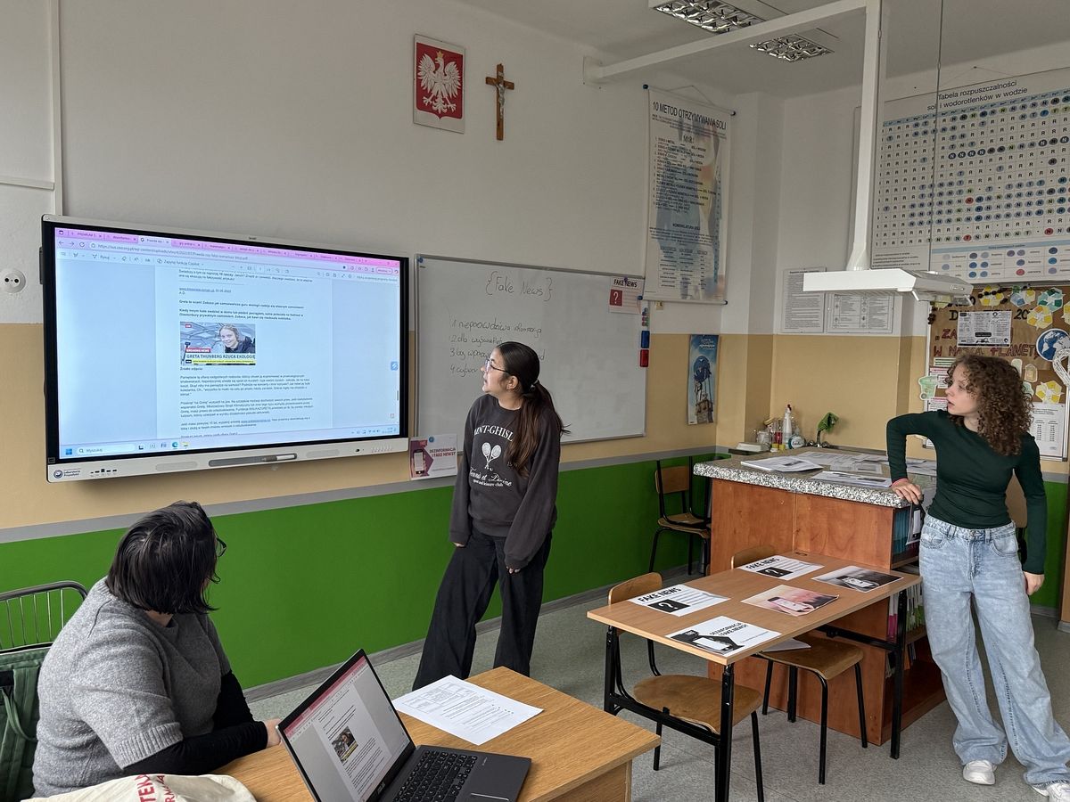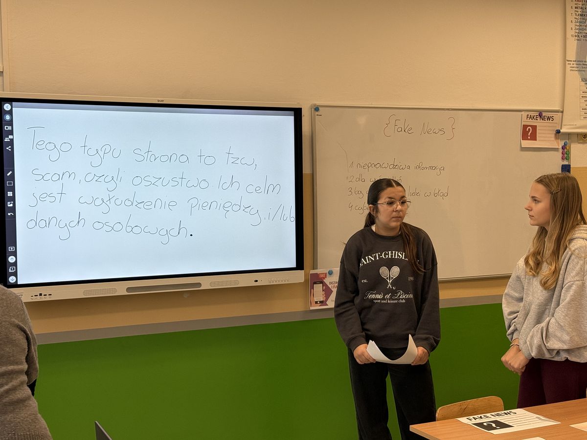 Celem lekcji było rozwijanie umiejętności krytycznego myślenia oraz świadomego odbioru informacji. Uczniowie wspólnie analizowali przykłady wiadomości i wskazywali cechy charakterystyczne dla fake newsów. Dodatkowo prowadzące przygotowały i wyświetliły klasie autorski film o fake newsach, który same nagrały na potrzeby zajęć.