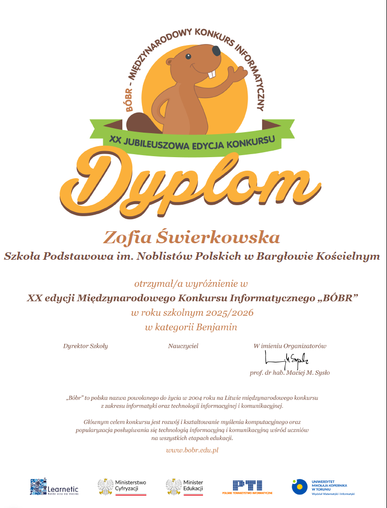 Możemy pochwalić się oficjalnymi wynikami XX Międzynarodowego Konkursu Informatycznego „Bóbr”, który odbył się w listopadzie ubiegłego roku.