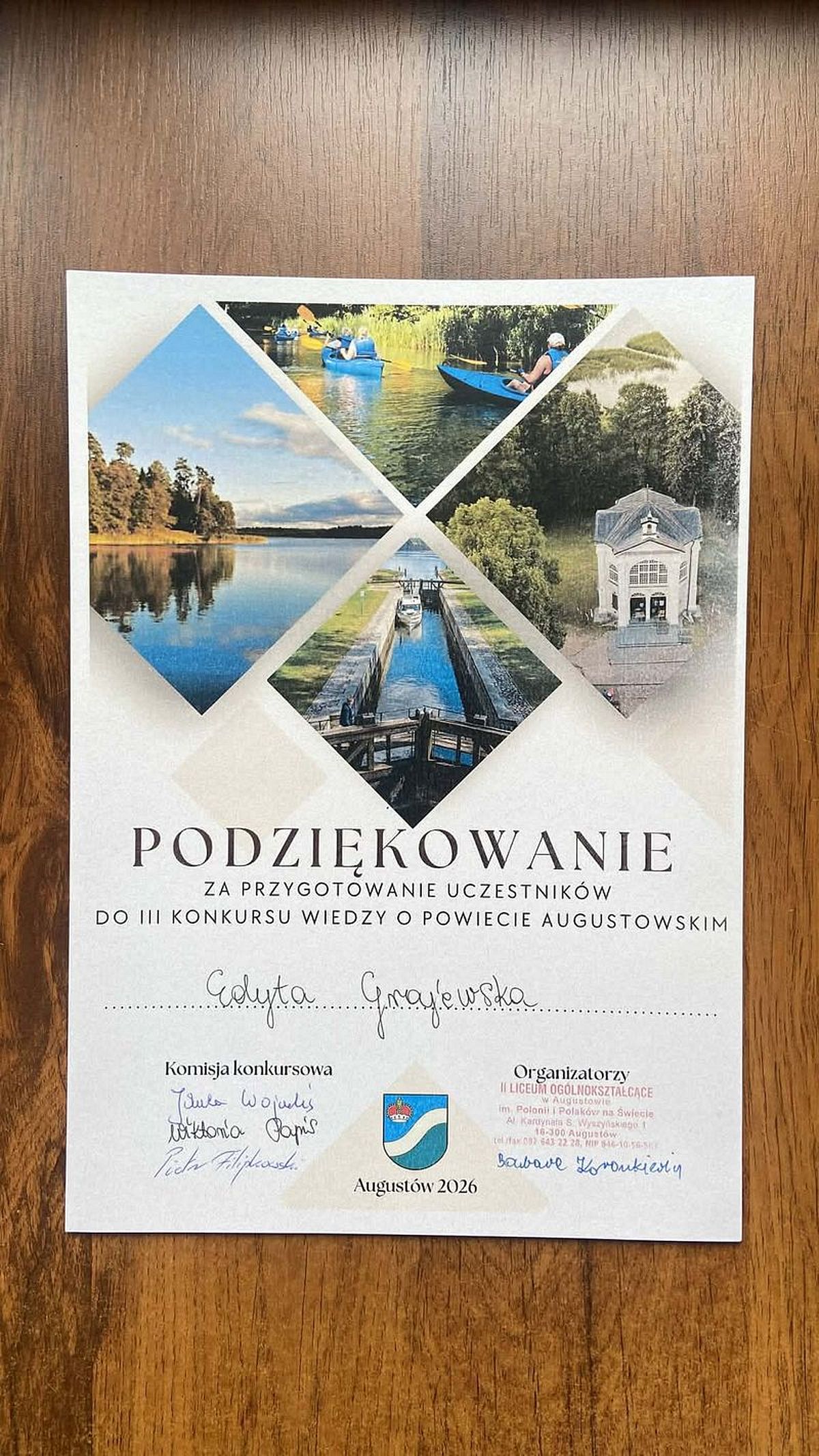 23 lutego 2026r. w II Liceum Ogólnokształcącym im. Polonii i Polaków na Świecie w Augustowie, odbył się etap powiatowy III Konkursu Wiedzy o Powiecie Augustowskim skierowany do uczniów klas VIII szkół podstawowych oraz klas I szkół ponadpodstawowych, popularyzujący wiedzę o regionie, o organach władzy samorządowej i ich zadaniach. Naszą szkołę reprezentowali Zuzanna Grycz, Wiktor Bućko i Hubert Michniewicz.