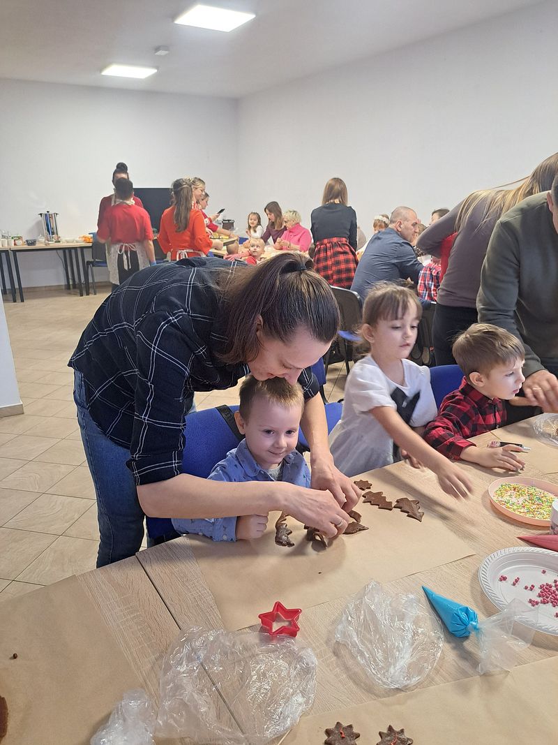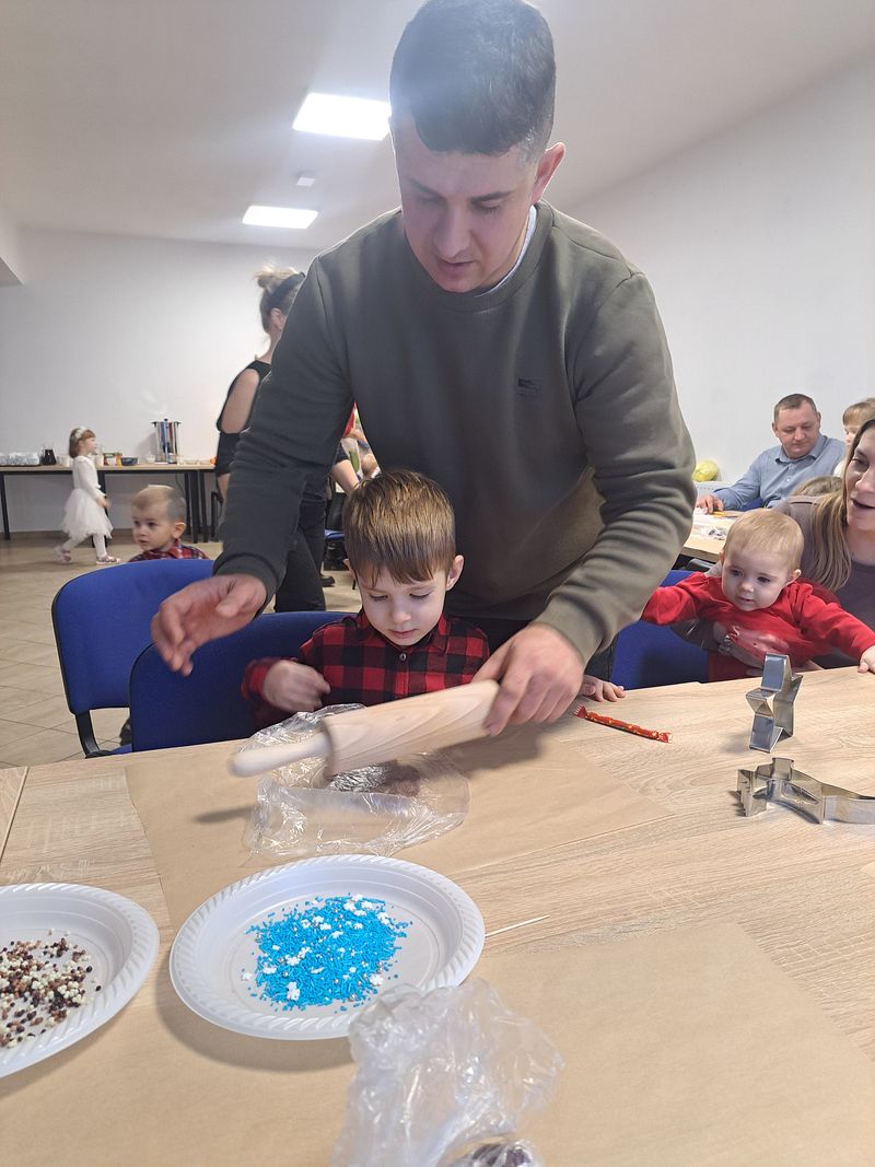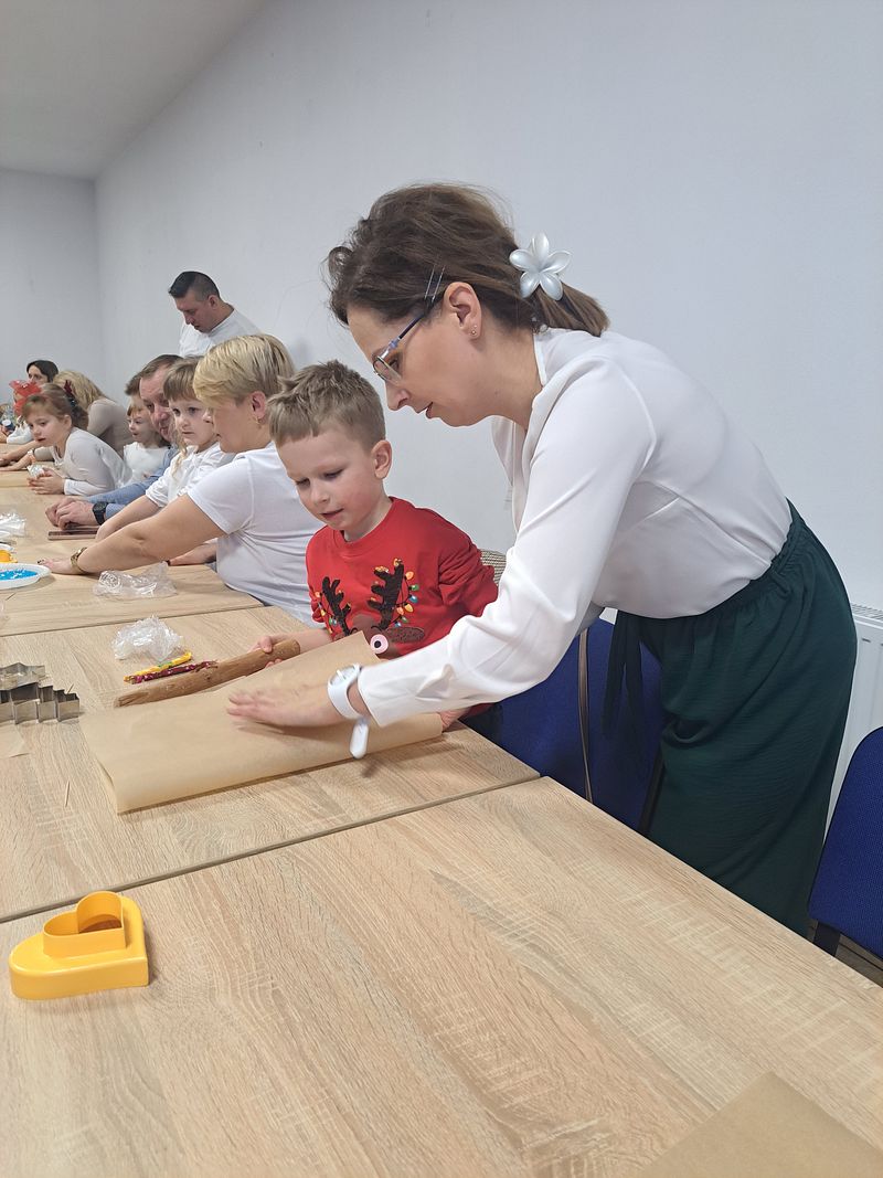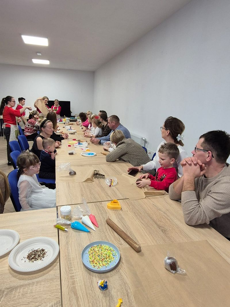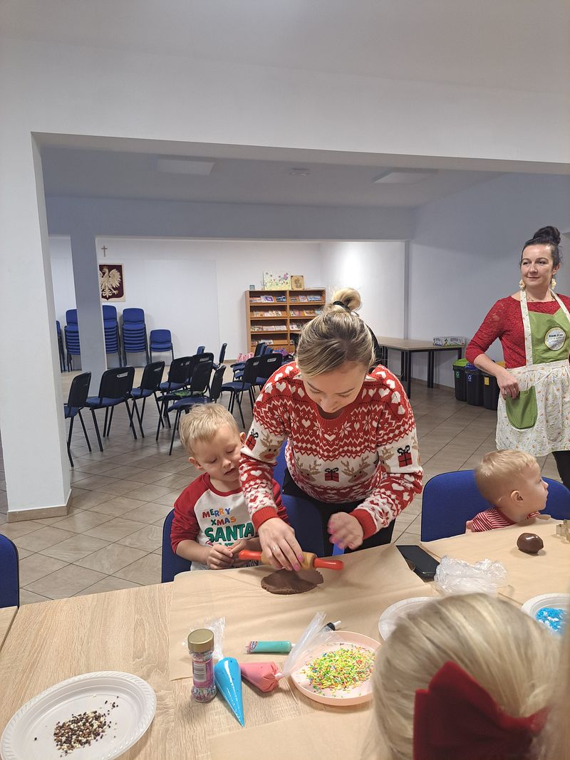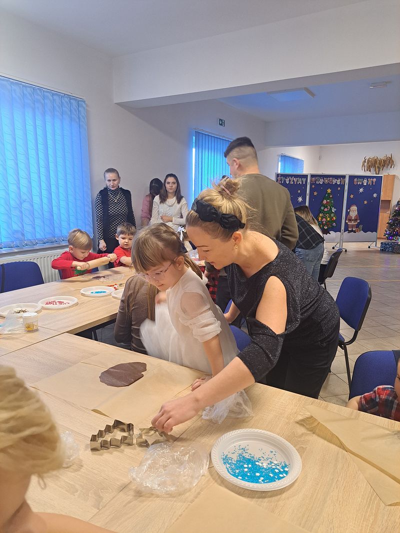 Po przedstawieniu na dzieci czekała kolejna atrakcja – warsztaty pieczenia pierników, prowadzone przez niezastąpione Panie z Koła Gospodyń Wiejskich z Kamionki. Wspólne wałkowanie ciasta, wykrawanie pierników i ich dekorowanie sprawiło dzieciom ogromną radość, a unoszący się w powietrzu zapach korzennych przypraw stworzył prawdziwie świąteczną atmosferę. Następnie odbyły się zajęcia plastyczne, podczas których każde dziecko malowało bombkę ze swoim imieniem. Powstały piękne, kolorowe prace, pełne dziecięcej wyobraźni i serca, które będą wyjątkową pamiątką tego dnia.