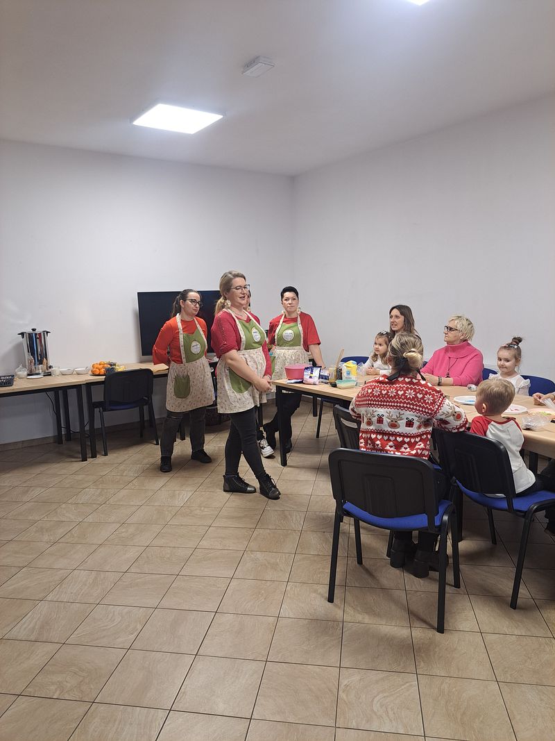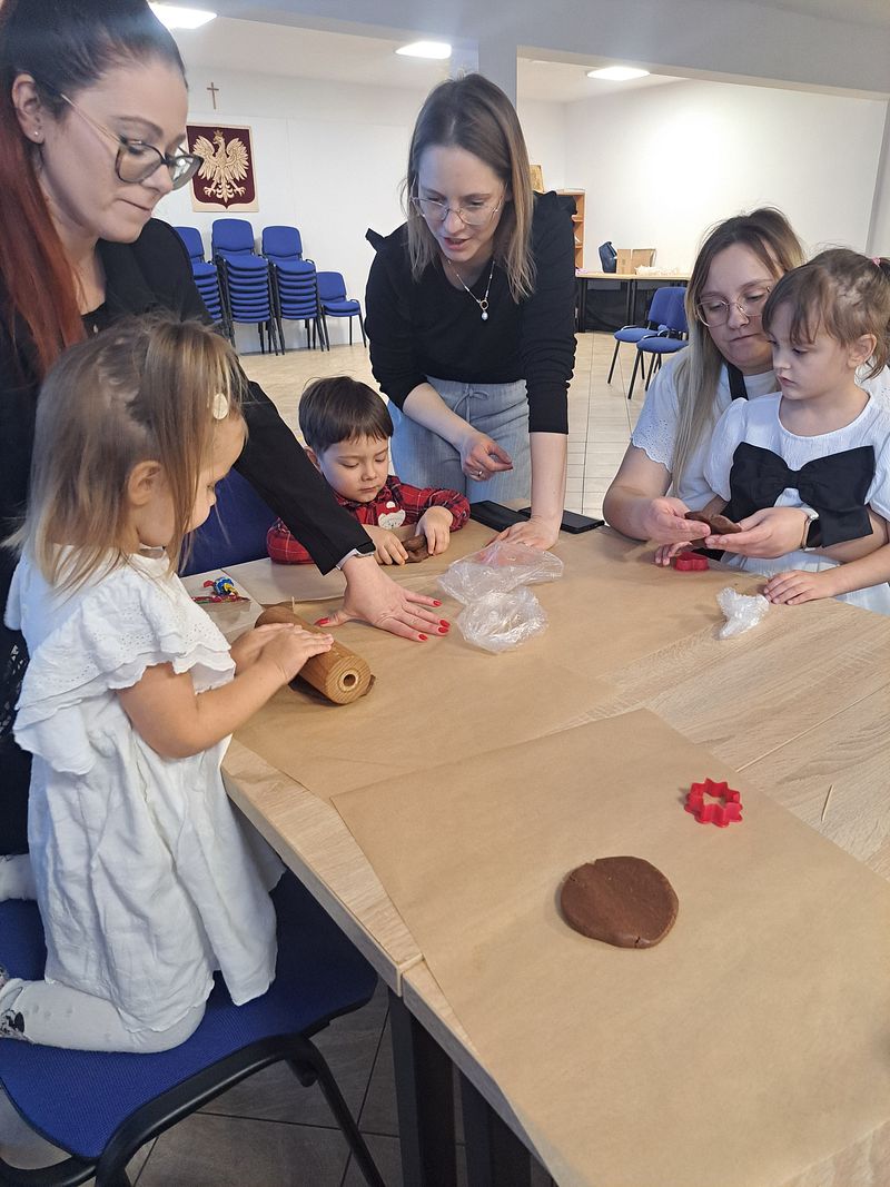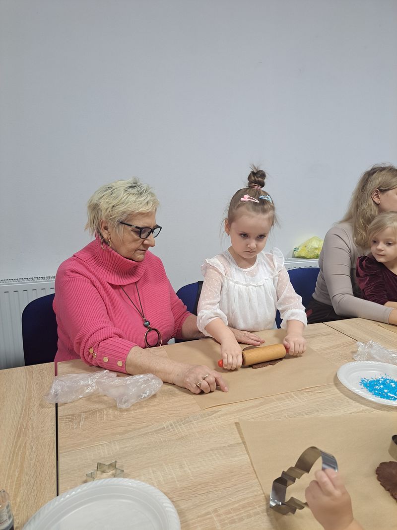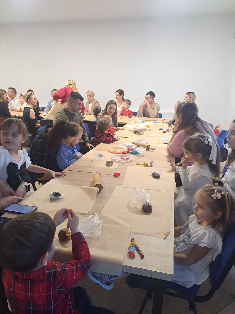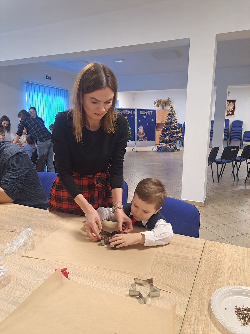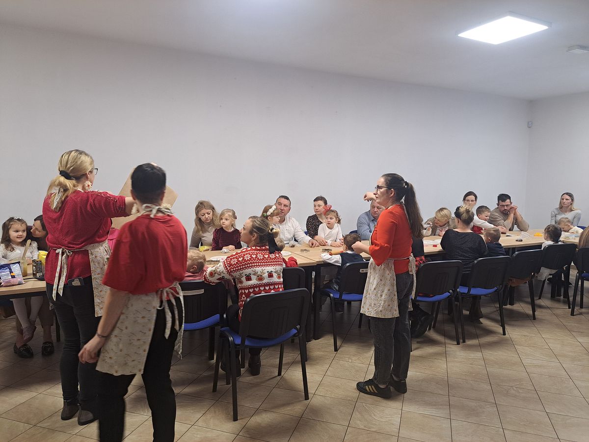 Po przedstawieniu na dzieci czekała kolejna atrakcja – warsztaty pieczenia pierników, prowadzone przez niezastąpione Panie z Koła Gospodyń Wiejskich z Kamionki. Wspólne wałkowanie ciasta, wykrawanie pierników i ich dekorowanie sprawiło dzieciom ogromną radość, a unoszący się w powietrzu zapach korzennych przypraw stworzył prawdziwie świąteczną atmosferę. Następnie odbyły się zajęcia plastyczne, podczas których każde dziecko malowało bombkę ze swoim imieniem. Powstały piękne, kolorowe prace, pełne dziecięcej wyobraźni i serca, które będą wyjątkową pamiątką tego dnia.