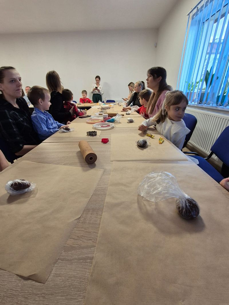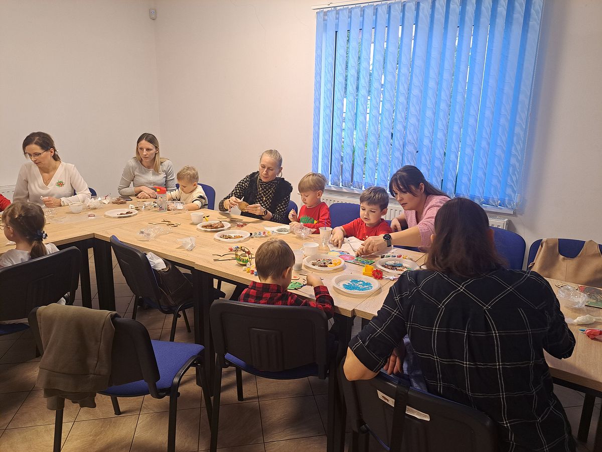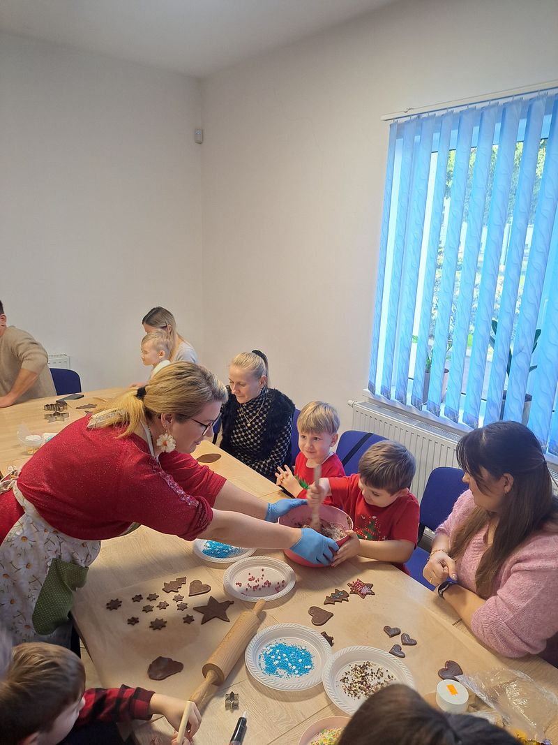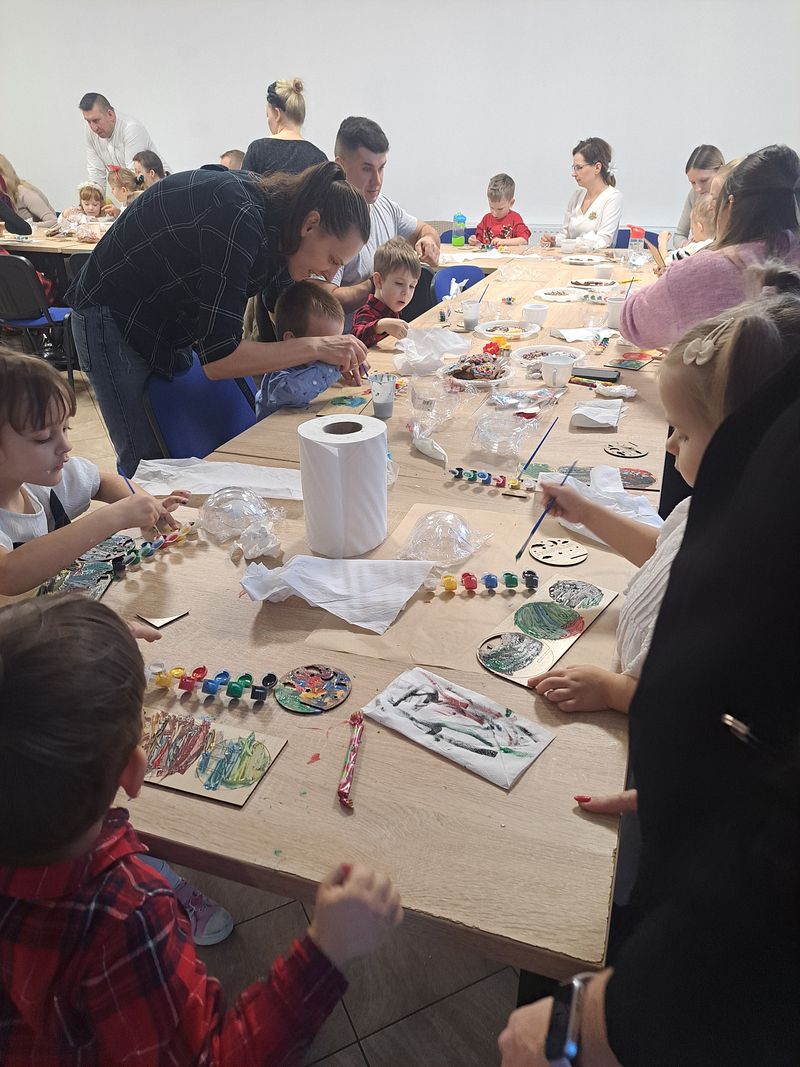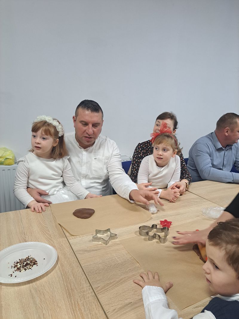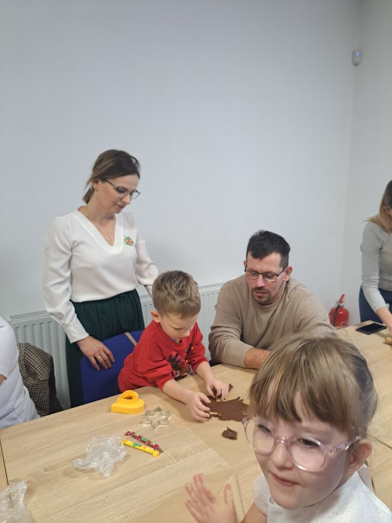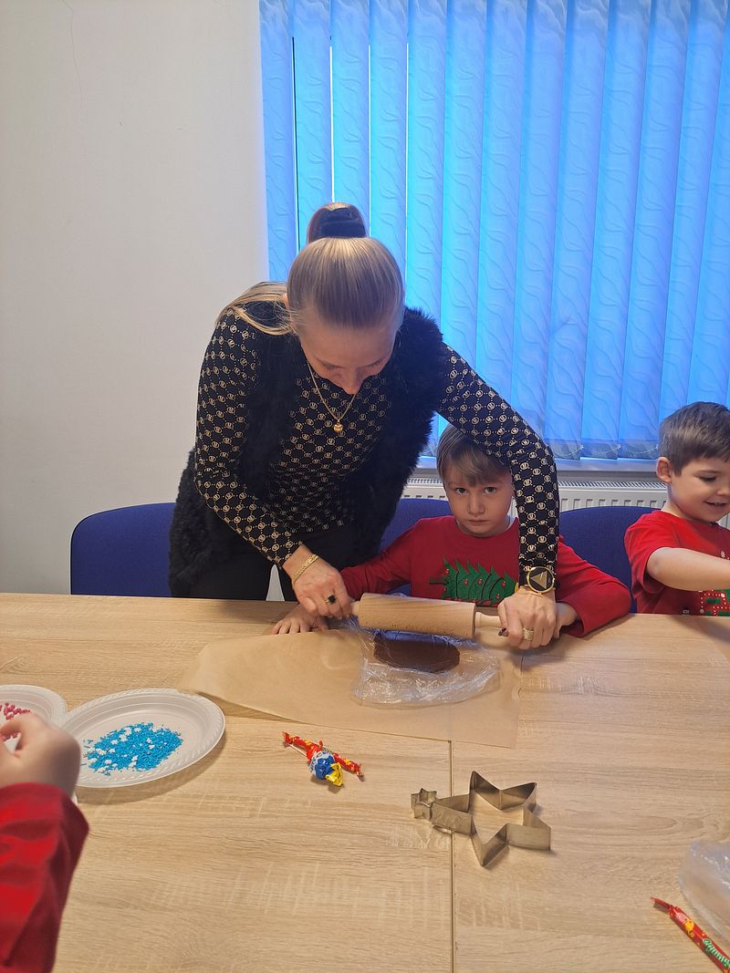 Po przedstawieniu na dzieci czekała kolejna atrakcja – warsztaty pieczenia pierników, prowadzone przez niezastąpione Panie z Koła Gospodyń Wiejskich z Kamionki. Wspólne wałkowanie ciasta, wykrawanie pierników i ich dekorowanie sprawiło dzieciom ogromną radość, a unoszący się w powietrzu zapach korzennych przypraw stworzył prawdziwie świąteczną atmosferę. Następnie odbyły się zajęcia plastyczne, podczas których każde dziecko malowało bombkę ze swoim imieniem. Powstały piękne, kolorowe prace, pełne dziecięcej wyobraźni i serca, które będą wyjątkową pamiątką tego dnia.