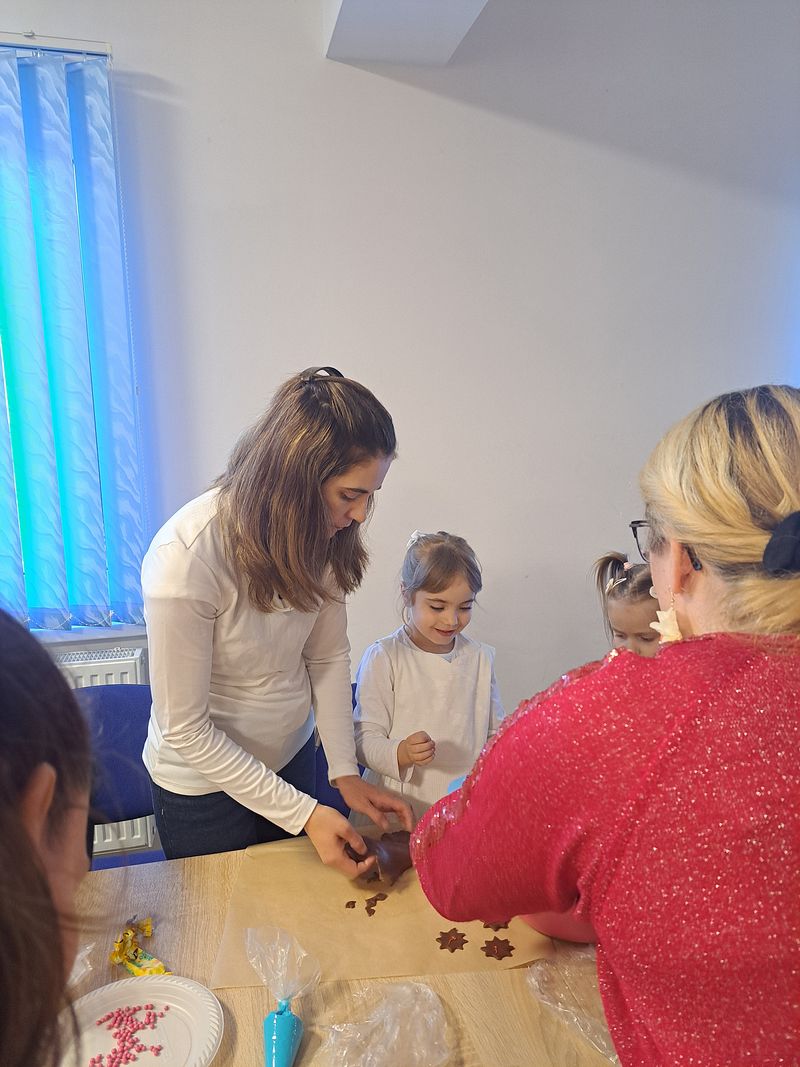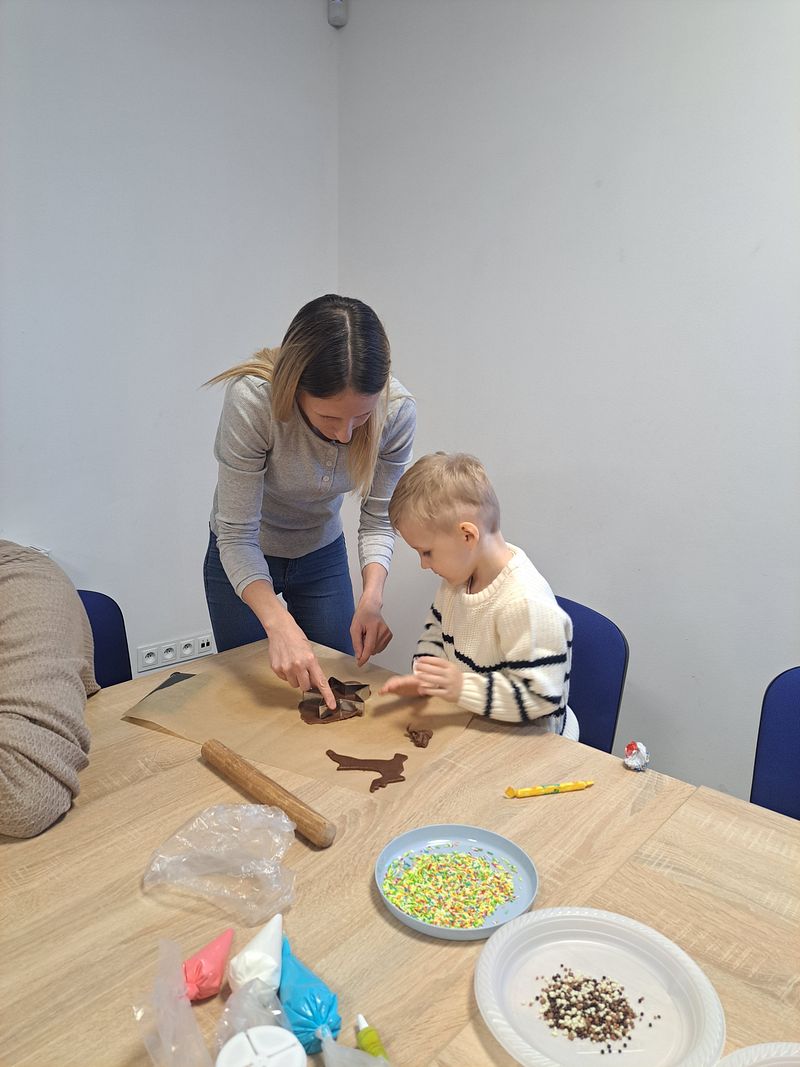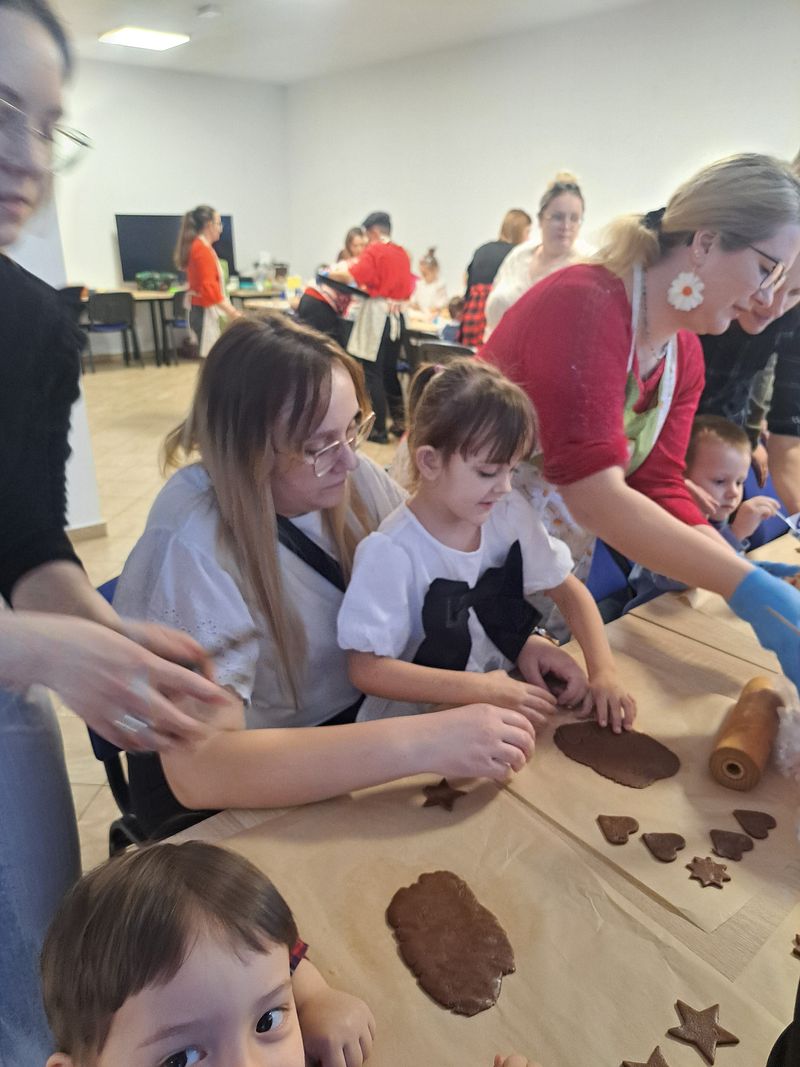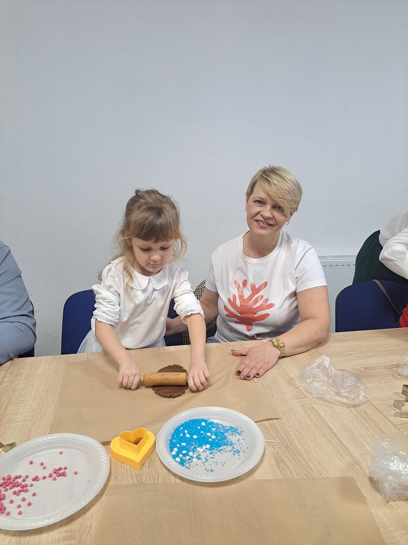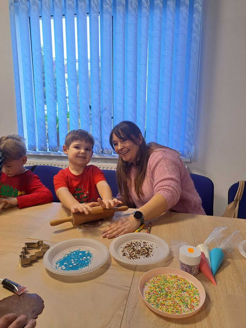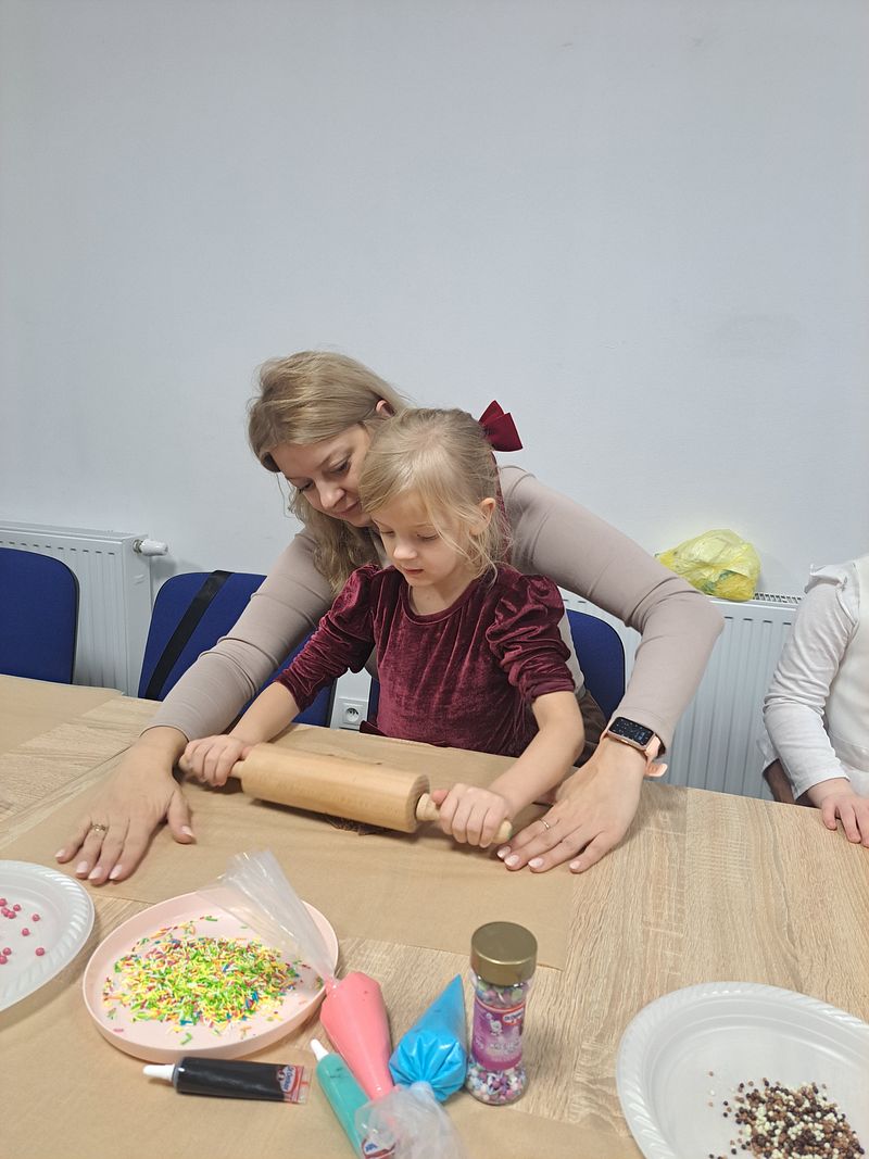 Po przedstawieniu na dzieci czekała kolejna atrakcja – warsztaty pieczenia pierników, prowadzone przez niezastąpione Panie z Koła Gospodyń Wiejskich z Kamionki. Wspólne wałkowanie ciasta, wykrawanie pierników i ich dekorowanie sprawiło dzieciom ogromną radość, a unoszący się w powietrzu zapach korzennych przypraw stworzył prawdziwie świąteczną atmosferę. Następnie odbyły się zajęcia plastyczne, podczas których każde dziecko malowało bombkę ze swoim imieniem. Powstały piękne, kolorowe prace, pełne dziecięcej wyobraźni i serca, które będą wyjątkową pamiątką tego dnia.