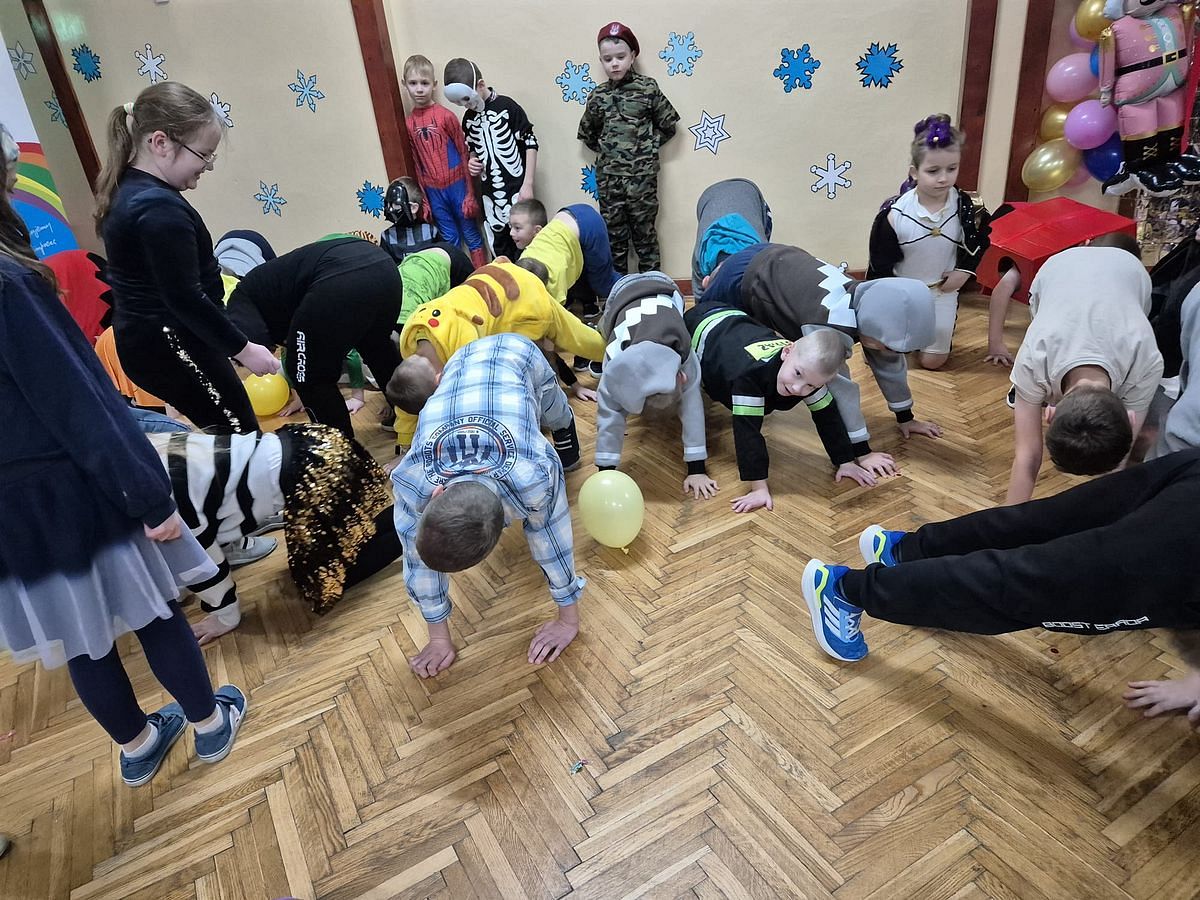 Zabawę poprowadził animator, który przygotował dla dzieci liczne gry i zabawy ruchowe przy muzyce. Uczniowie chętnie brali udział w tańcach, zabawach integracyjnych oraz konkurencjach zespołowych. Animator zadbał o wesołą atmosferę i aktywne uczestnictwo wszystkich dzieci. Radość, śmiech i dobra zabawa towarzyszyły uczestnikom przez cały czas trwania imprezy.