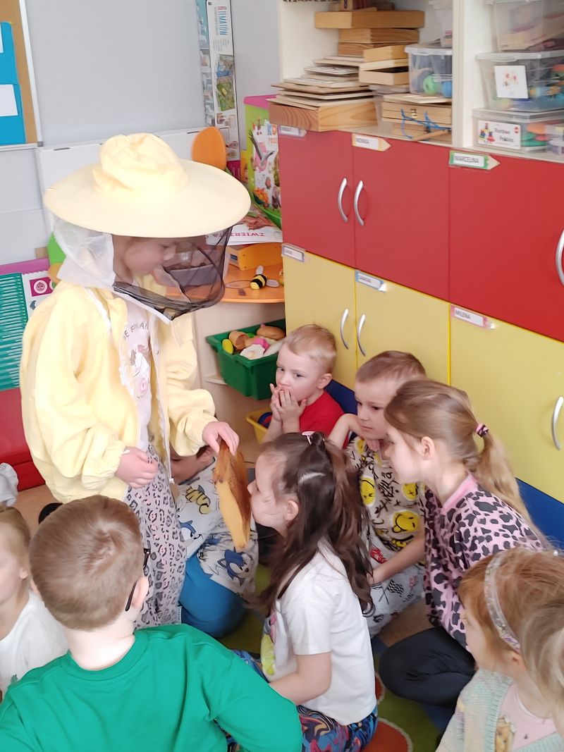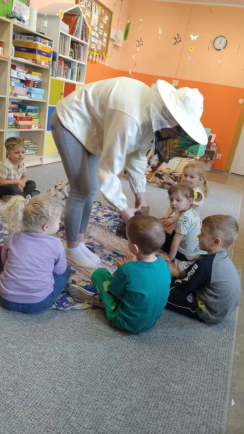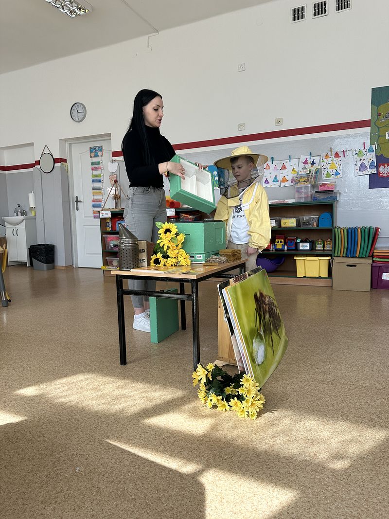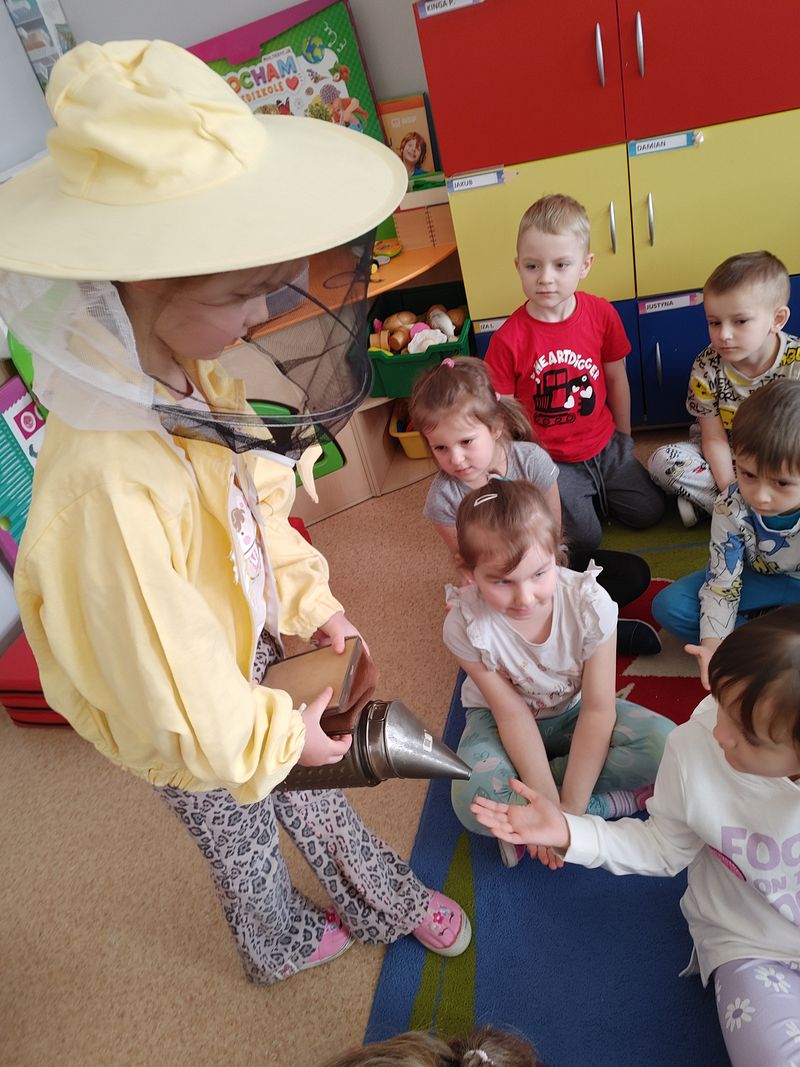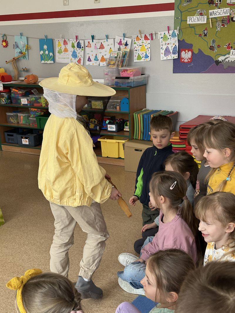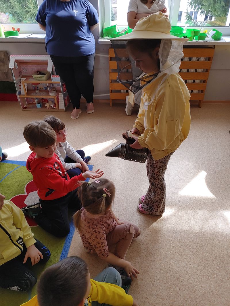 Dzieci miały okazję poznać fascynujący świat pszczół oraz dowiedzieć się, jak ważną rolę odgrywają one w przyrodzie. Podczas spotkania przedszkolaki zobaczyły z bliska prawdziwy ul, ramkę pszczelą, specjalistyczne ubranie pszczelarza oraz narzędzia wykorzystywane w pracy, takie jak podkurzacz. Obserwowały także pracujące pszczoły znajdujące się za szybą.