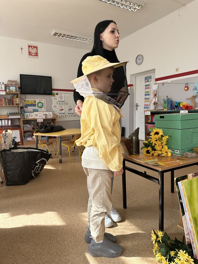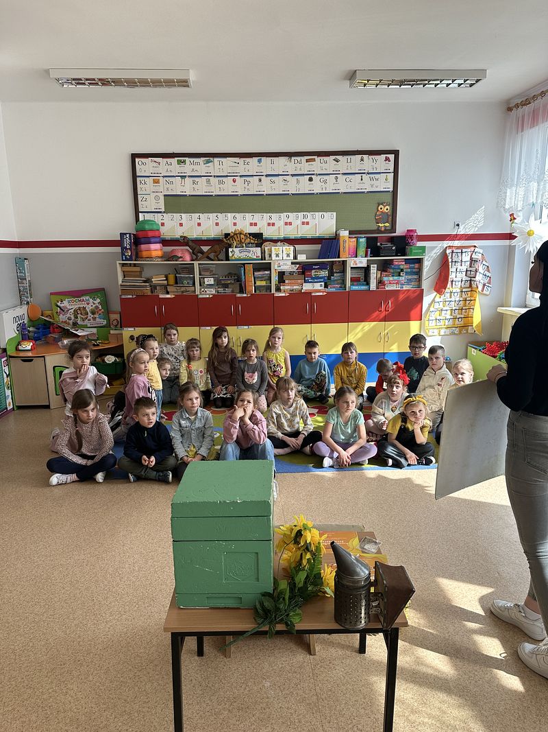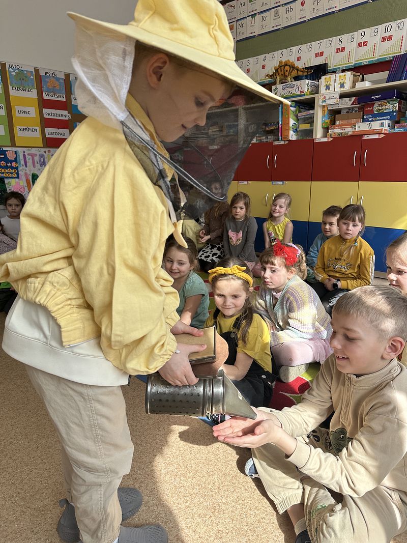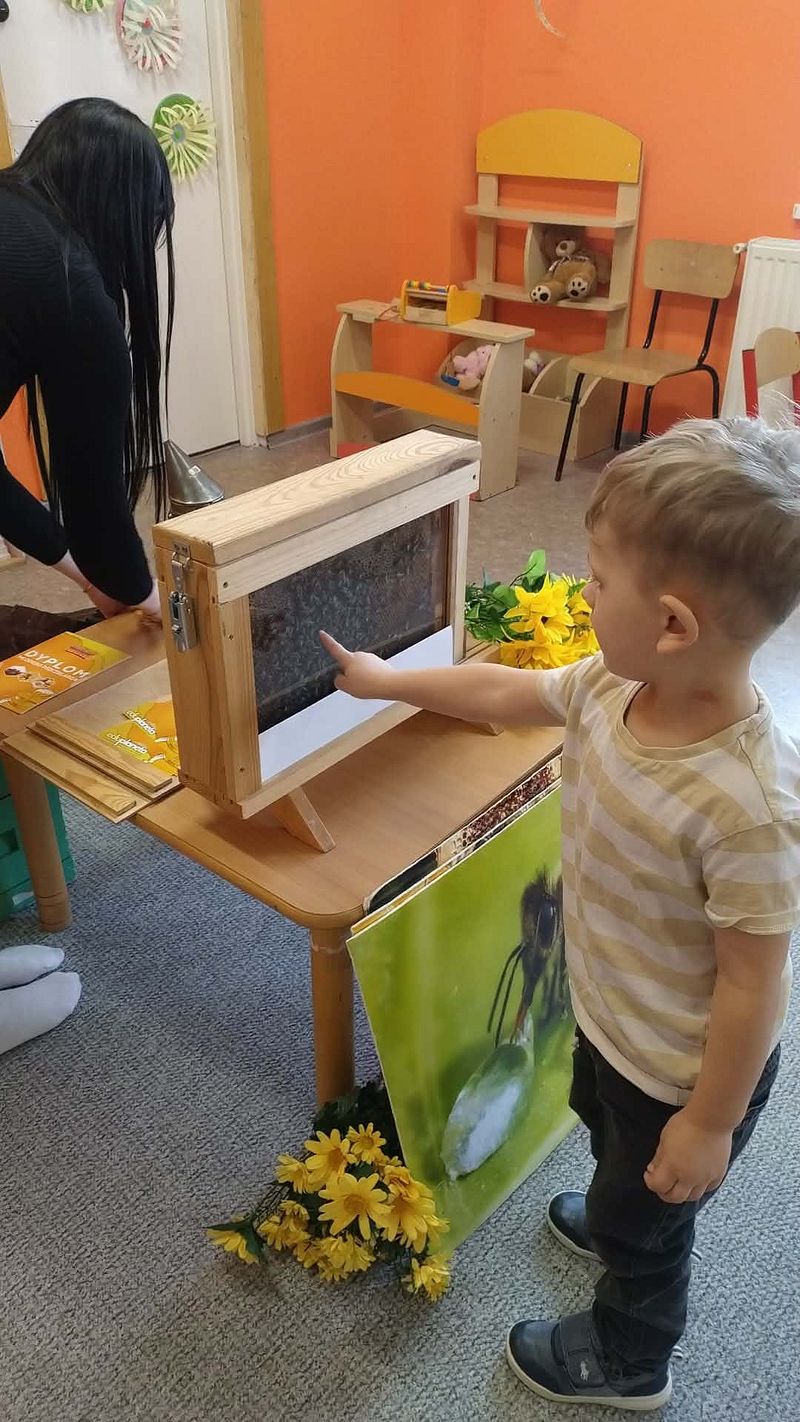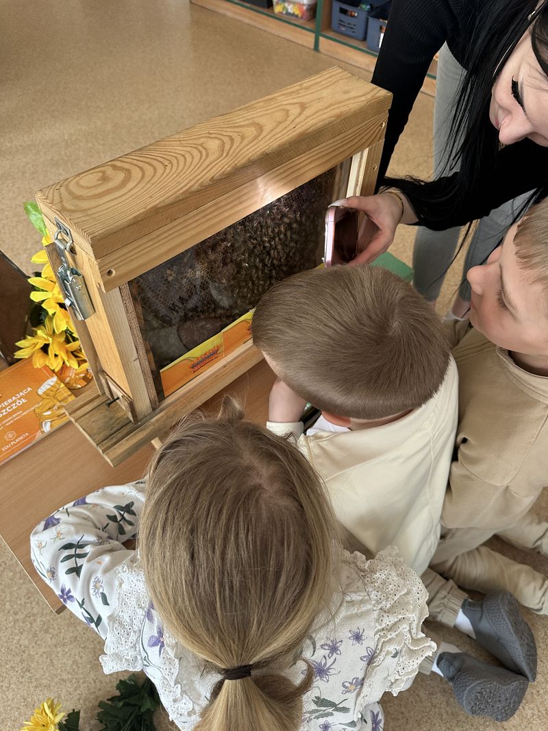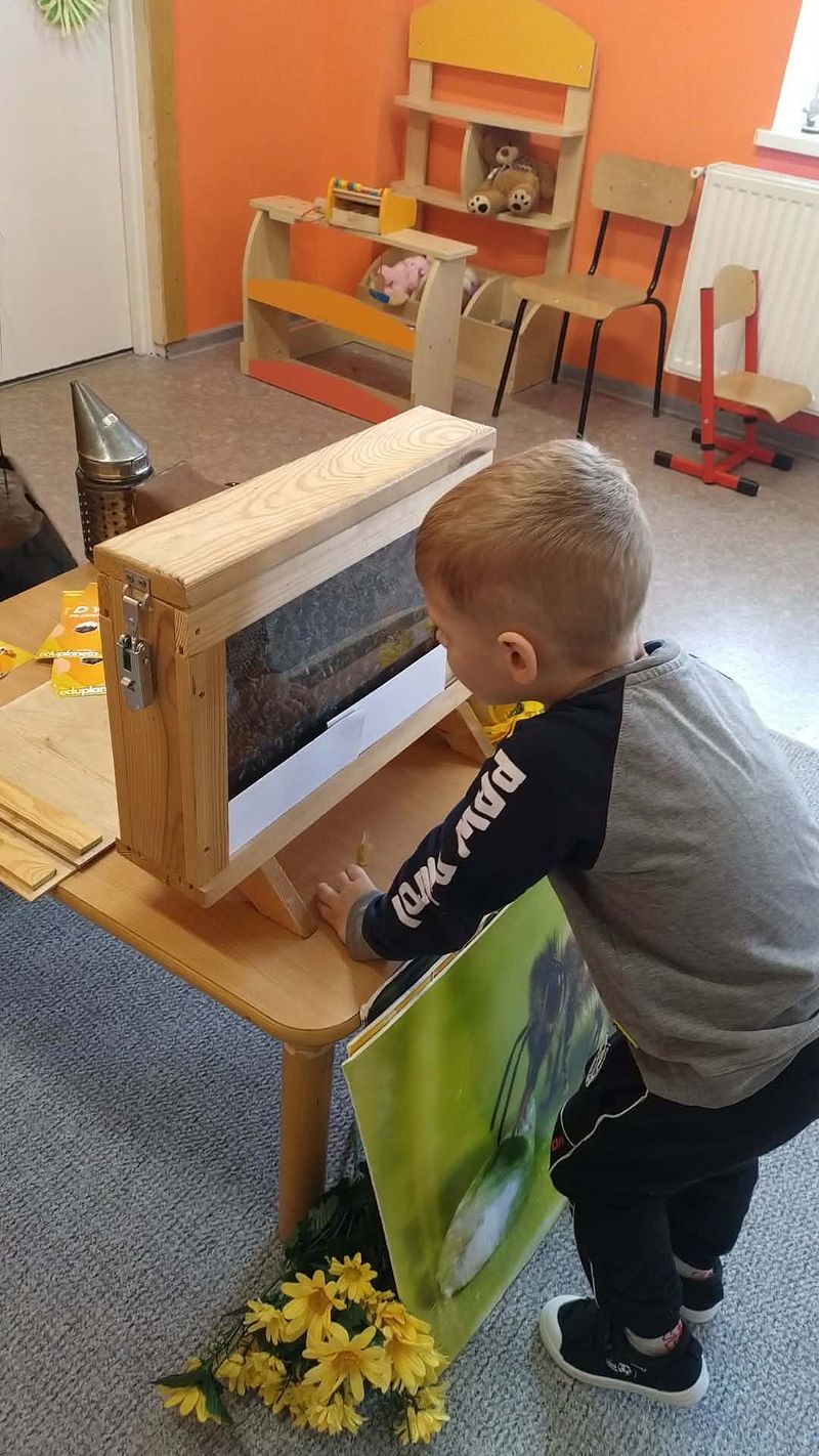 Dzieci miały okazję poznać fascynujący świat pszczół oraz dowiedzieć się, jak ważną rolę odgrywają one w przyrodzie. Podczas spotkania przedszkolaki zobaczyły z bliska prawdziwy ul, ramkę pszczelą, specjalistyczne ubranie pszczelarza oraz narzędzia wykorzystywane w pracy, takie jak podkurzacz. Obserwowały także pracujące pszczoły znajdujące się za szybą.