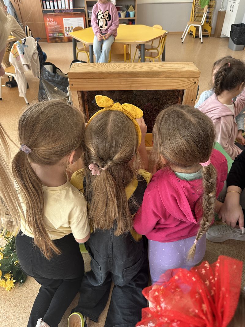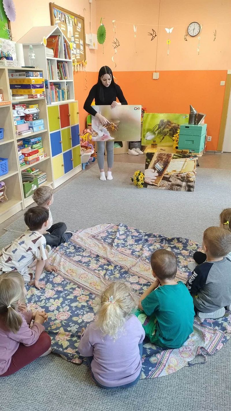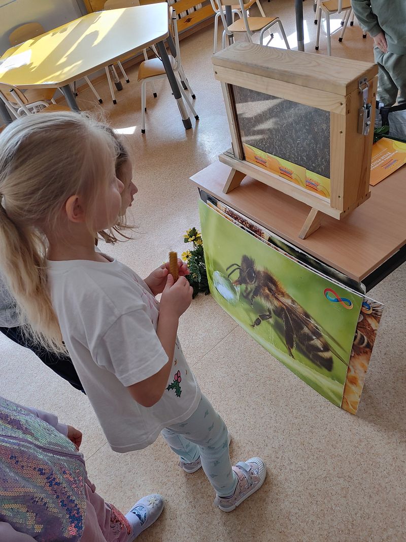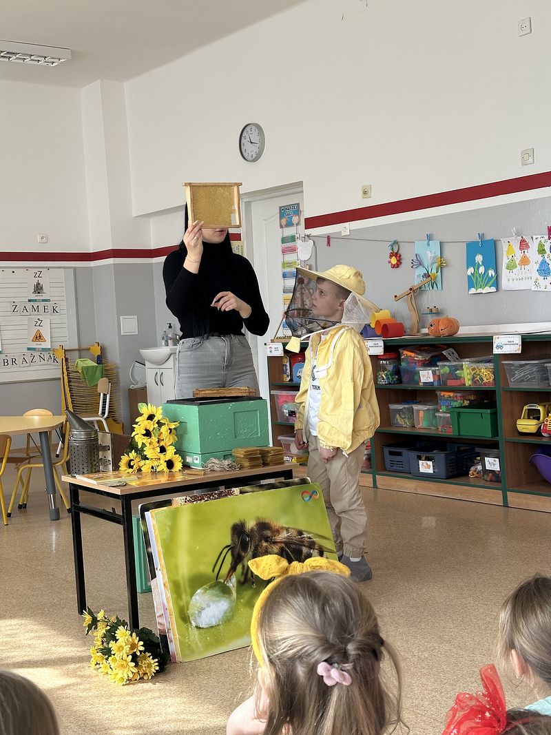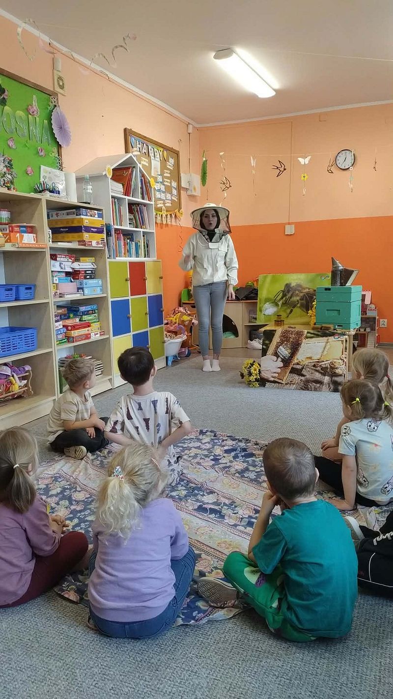 Dzieci miały okazję poznać fascynujący świat pszczół oraz dowiedzieć się, jak ważną rolę odgrywają one w przyrodzie. Podczas spotkania przedszkolaki zobaczyły z bliska prawdziwy ul, ramkę pszczelą, specjalistyczne ubranie pszczelarza oraz narzędzia wykorzystywane w pracy, takie jak podkurzacz. Obserwowały także pracujące pszczoły znajdujące się za szybą.