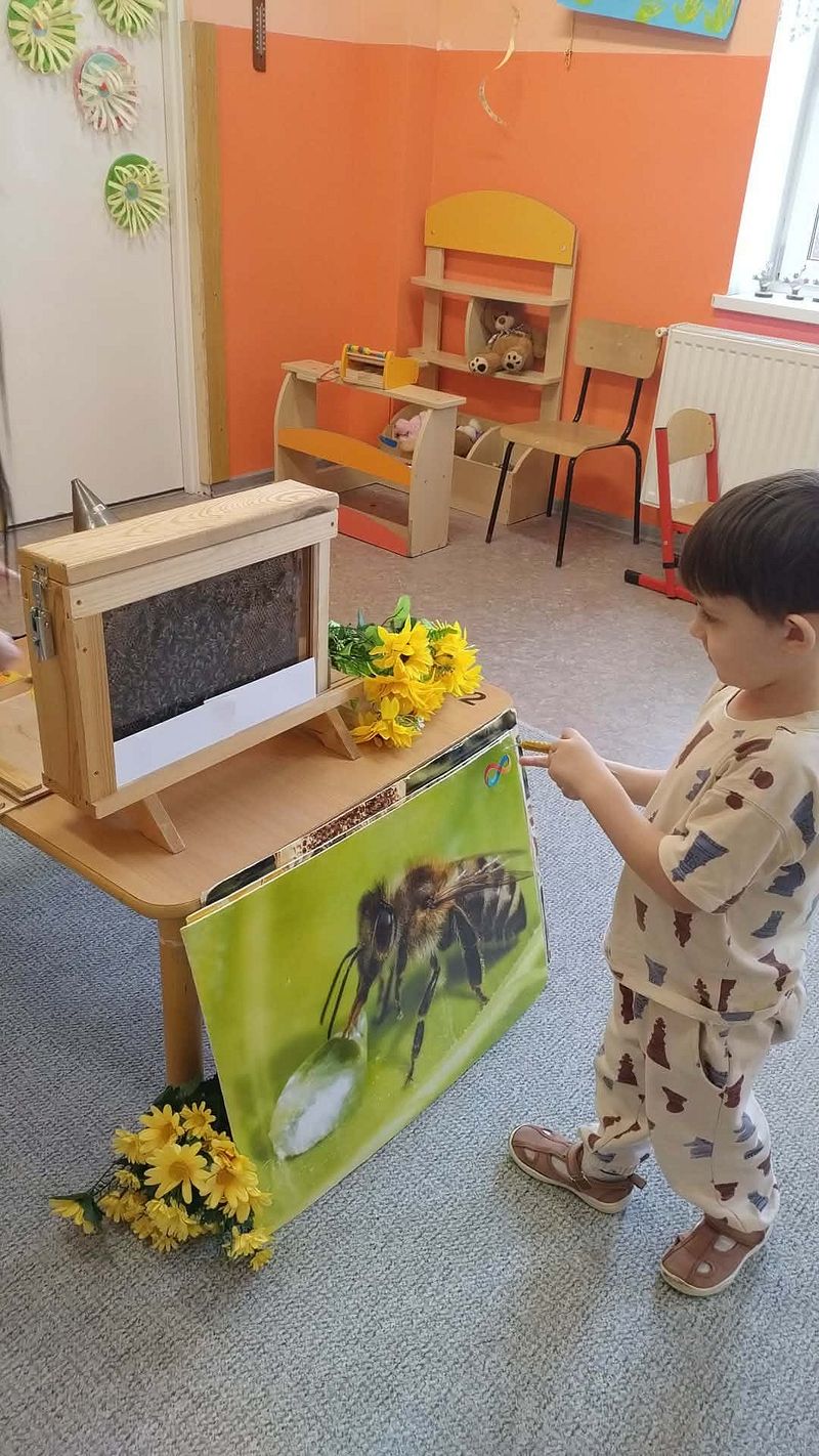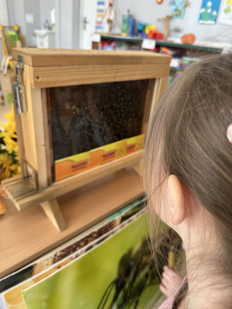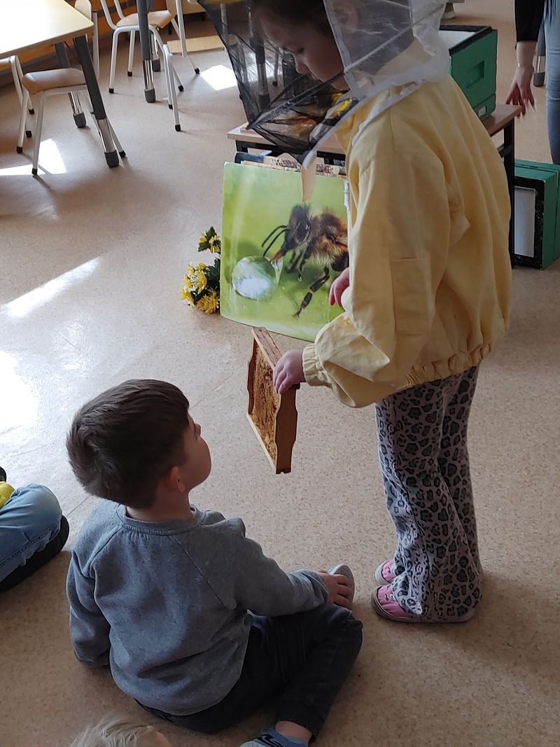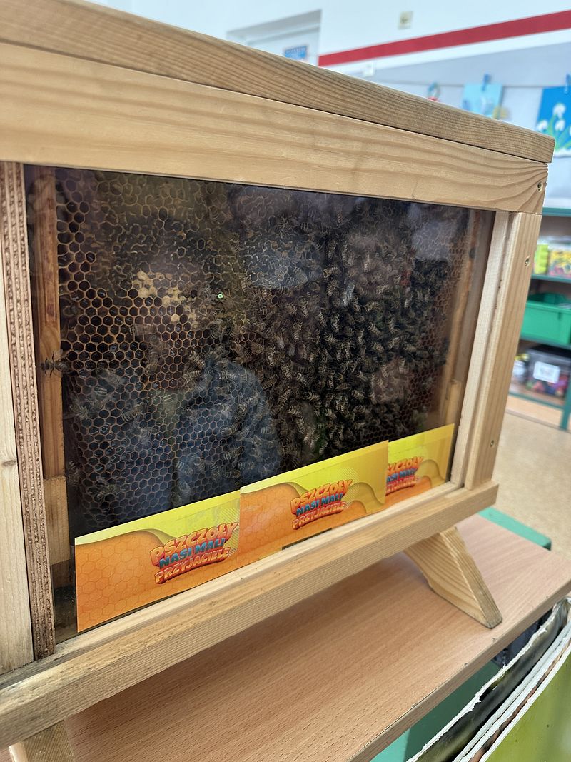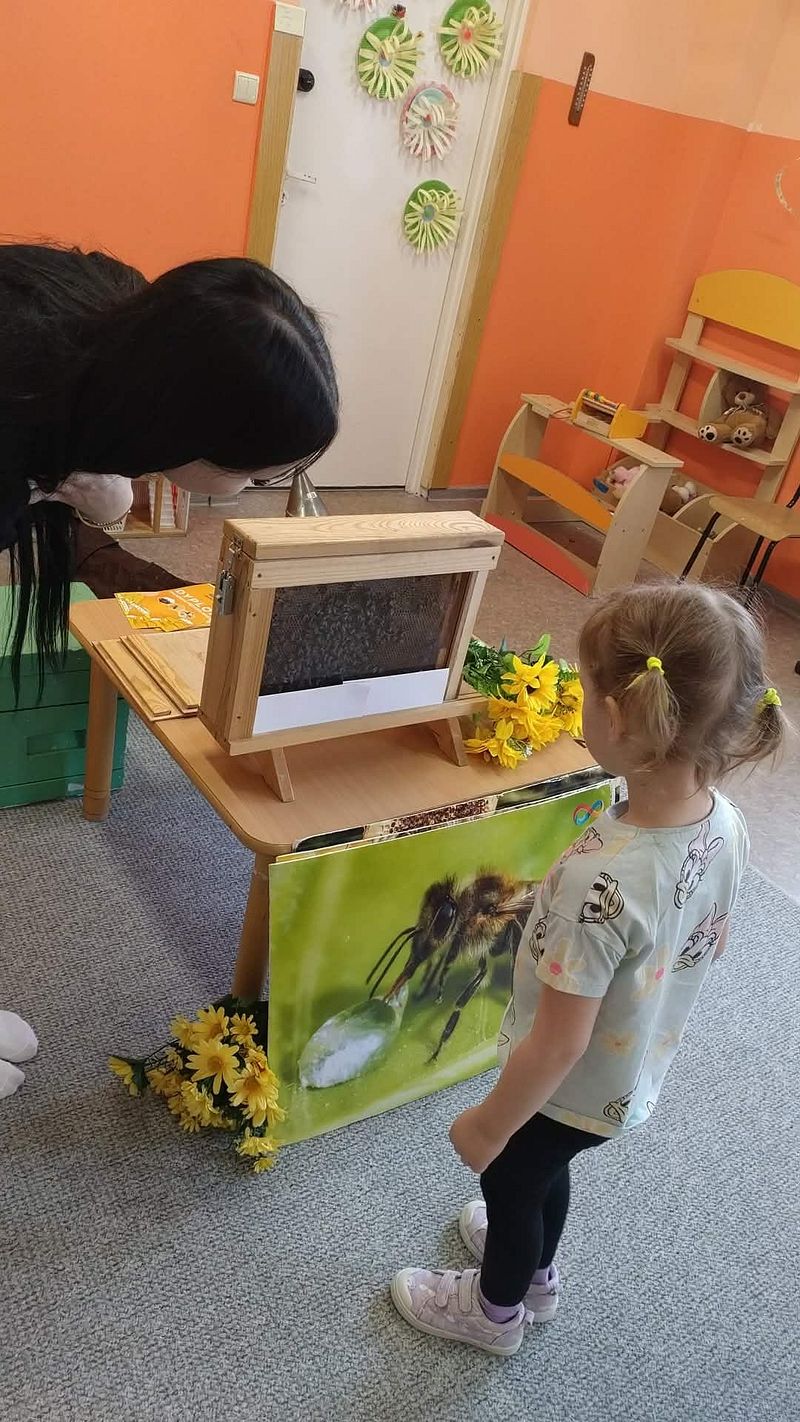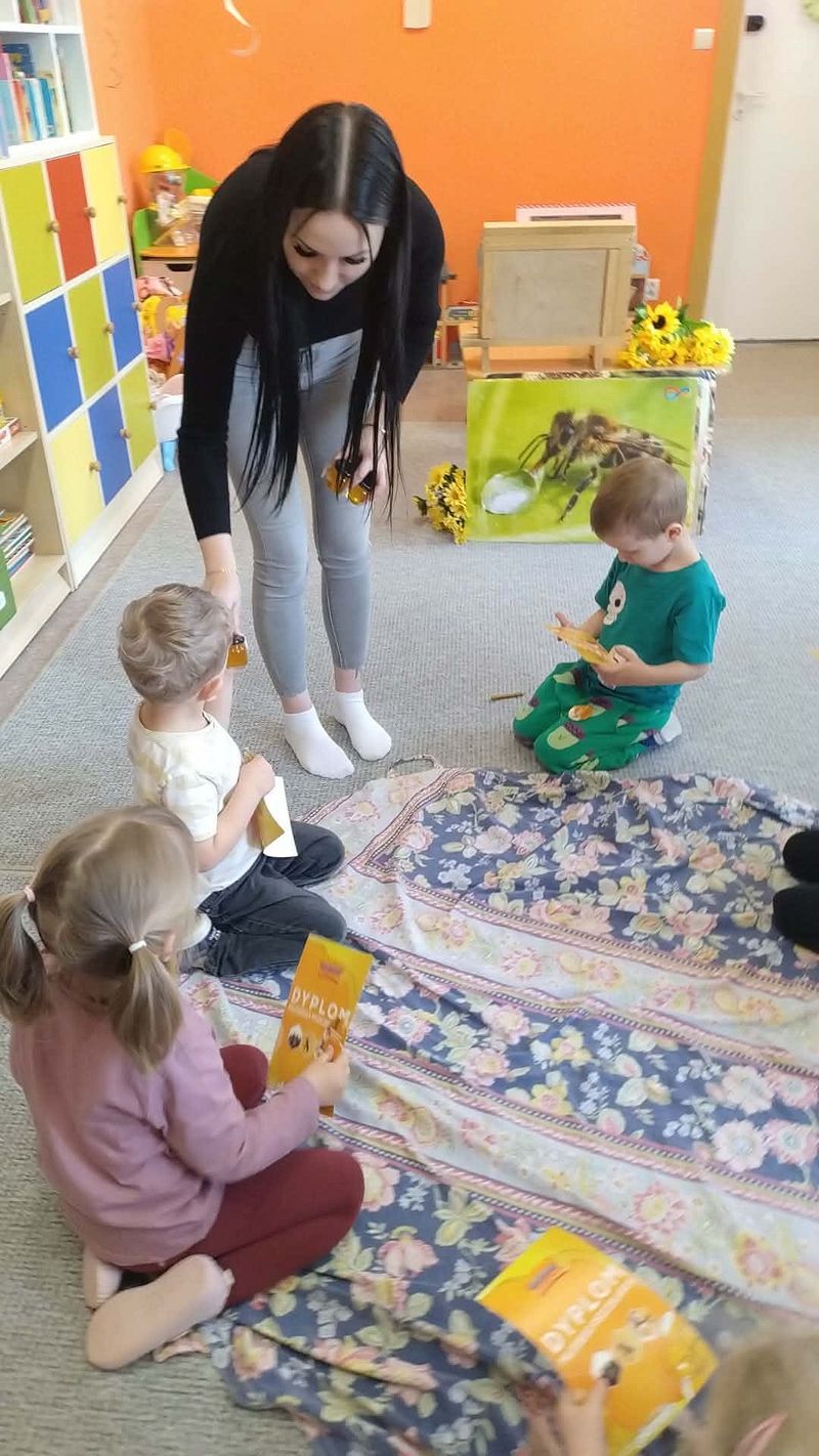 Dzieci miały okazję poznać fascynujący świat pszczół oraz dowiedzieć się, jak ważną rolę odgrywają one w przyrodzie. Podczas spotkania przedszkolaki zobaczyły z bliska prawdziwy ul, ramkę pszczelą, specjalistyczne ubranie pszczelarza oraz narzędzia wykorzystywane w pracy, takie jak podkurzacz. Obserwowały także pracujące pszczoły znajdujące się za szybą.