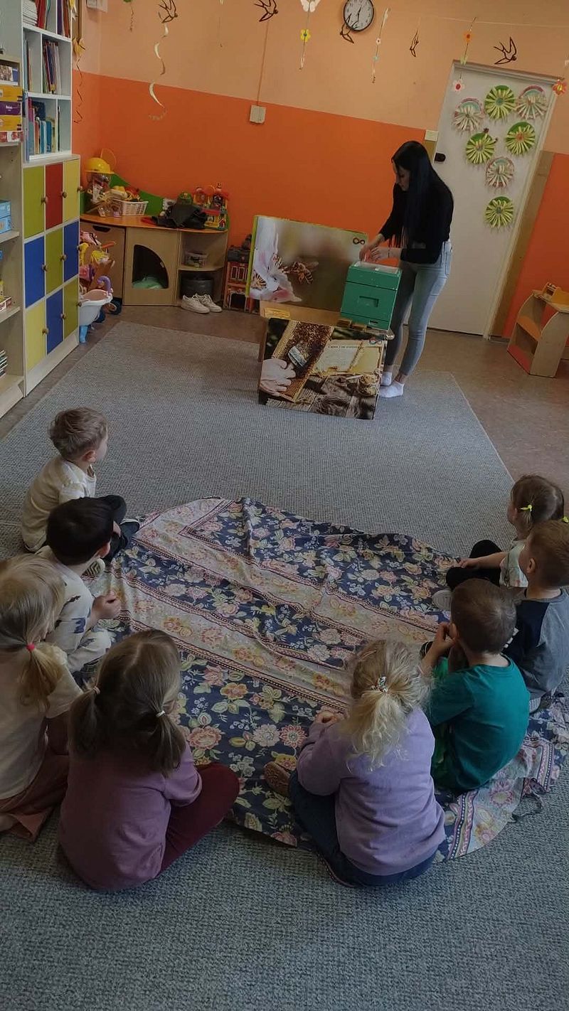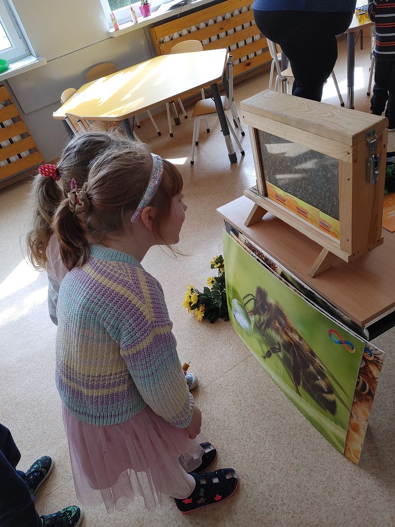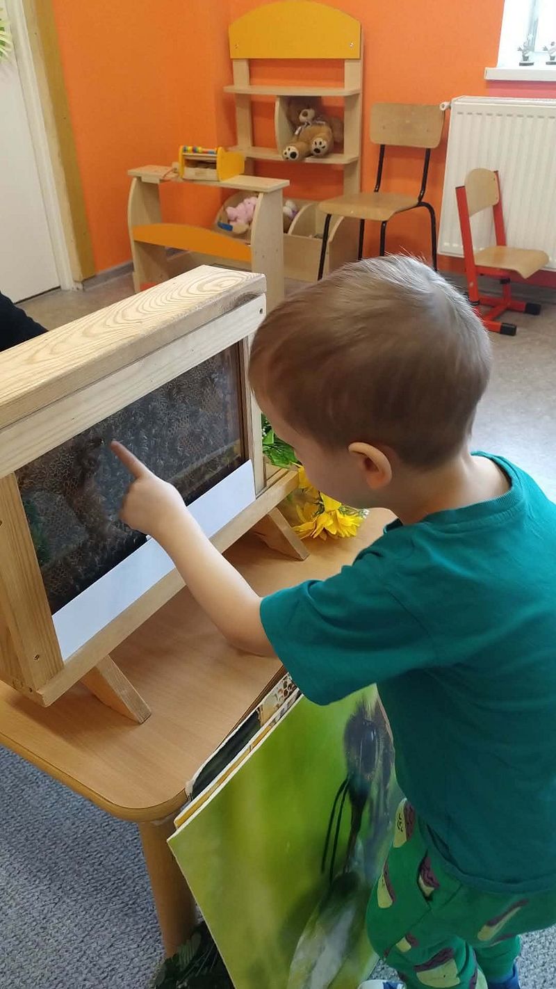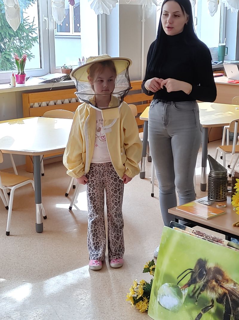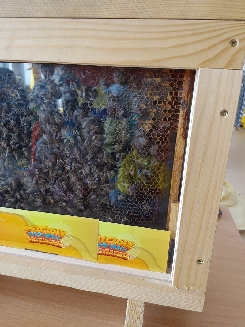 Dzieci miały okazję poznać fascynujący świat pszczół oraz dowiedzieć się, jak ważną rolę odgrywają one w przyrodzie. Podczas spotkania przedszkolaki zobaczyły z bliska prawdziwy ul, ramkę pszczelą, specjalistyczne ubranie pszczelarza oraz narzędzia wykorzystywane w pracy, takie jak podkurzacz. Obserwowały także pracujące pszczoły znajdujące się za szybą.