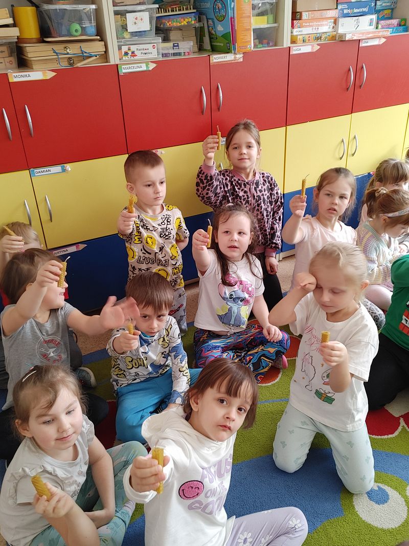 Na zakończenie każde dziecko wykonało własną świecę z dodatkiem miodu — była to twórcza i pachnąca pamiątka z tej wyjątkowej lekcji.
