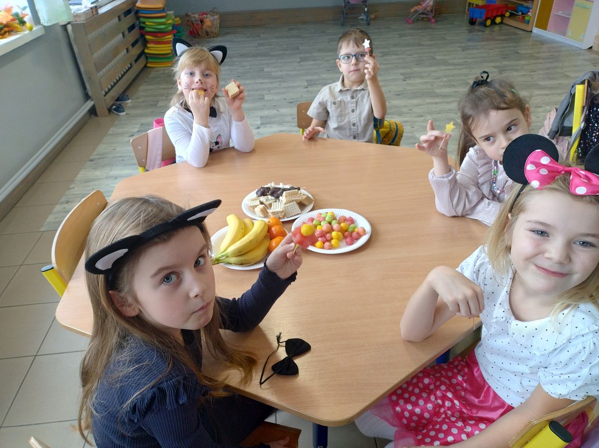 Podczas zabawy na dzieci czekał również kolorowy stół pełen pysznych przekąsek. Przedszkolaki zajadały się owocami, chrupiącymi smakołykami i drobnymi słodkościami.